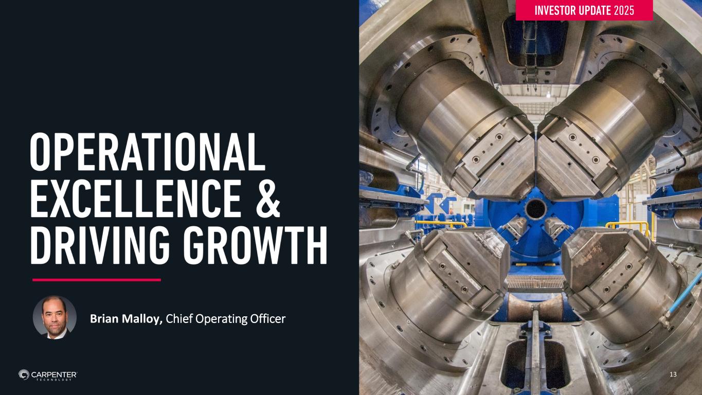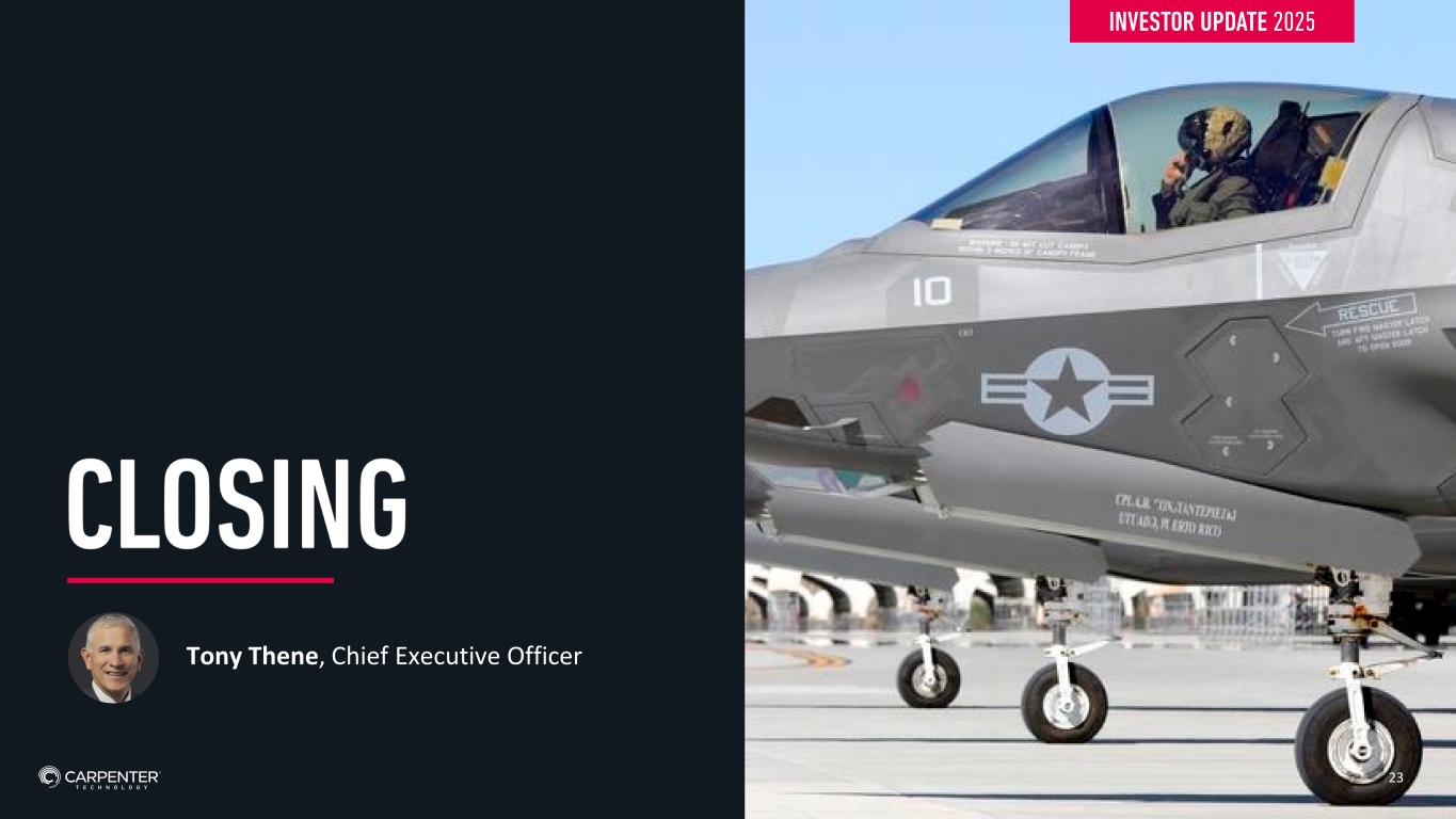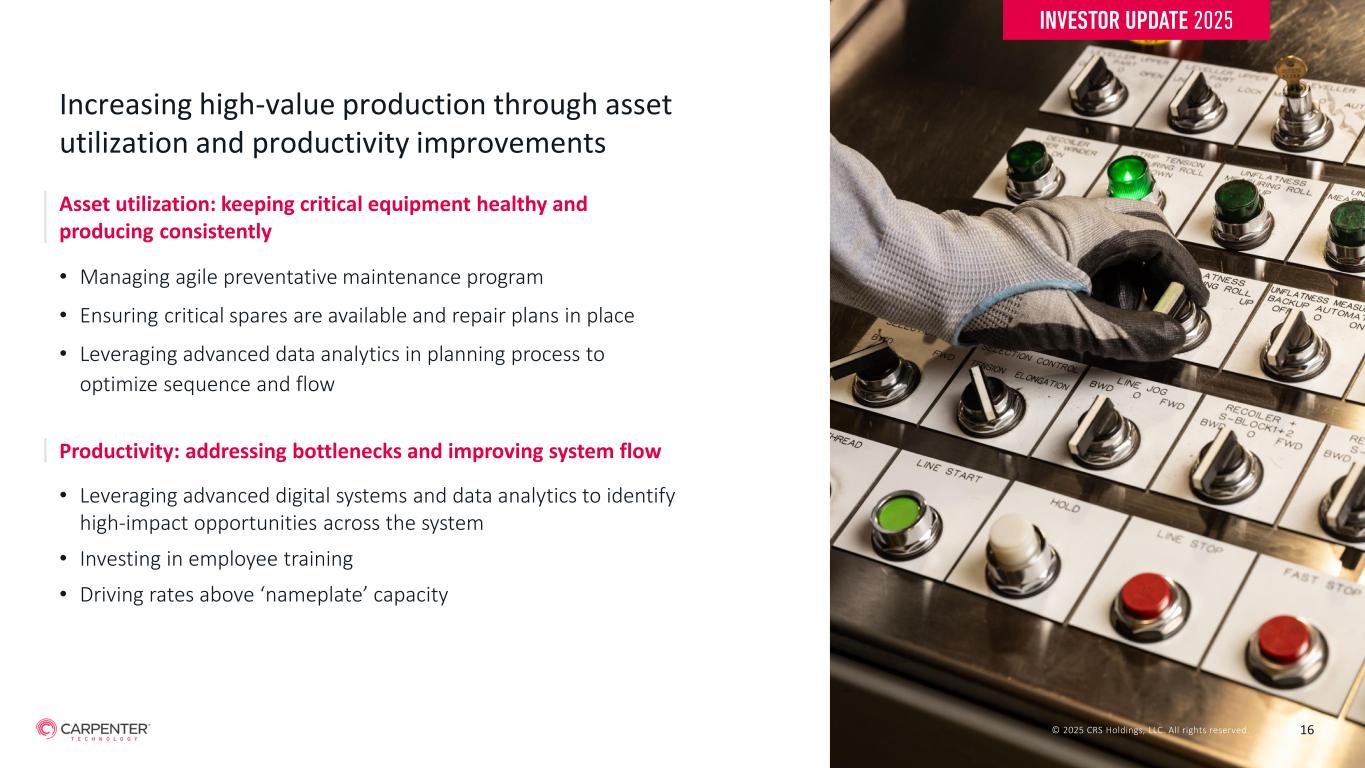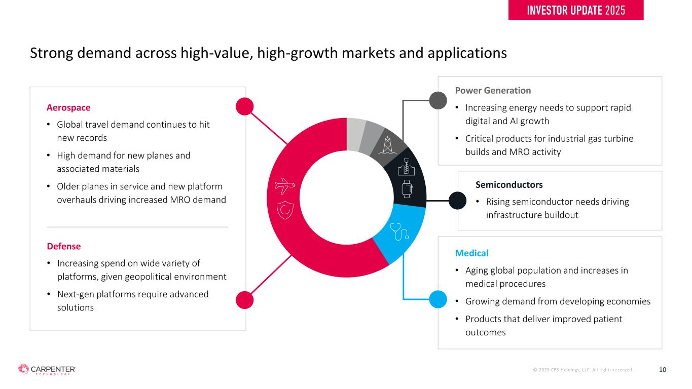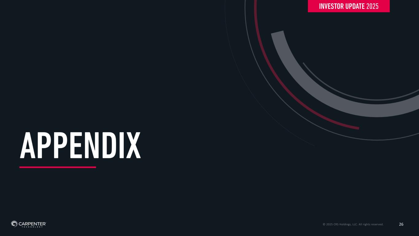 ©2025年CRS控股有限责任公司。版权所有。警示性声明2前瞻性声明本演示文稿包含1995年《私人证券诉讼法案》含义内的前瞻性声明。这些前瞻性陈述受到可能导致实际结果与预测、预期或暗示的结果不同的风险和不确定性的影响。这些不确定因素中最重要的在卡朋特科技提交给美国证券交易委员会的文件中有描述,包括其截至2024年6月30日的财政年度的10-K表格报告、截至2024年9月30日和2024年12月31日的财政季度的10-Q表格,以及这些文件所附的附件。包括但不限于:(1)特种材料业务和某些最终用途市场的周期性,包括航空航天、国防、医疗、能源、交通运输、工业和消费类,或对卡朋特科技业务产生的其他影响,例如新的竞争对手,竞争对手、客户、供应商的整合或制造能力从美国向外国的转移;(2)卡朋特科技实现现金产生、增长、收益、盈利能力、营业收入、成本节约和减少、资质、生产力改进或工艺变化的能力;(3)回收能源、原材料成本增加的能力,运费或其他因素;(4)某些金属的国内外过剩制造产能;(5)货币汇率和利率的波动;(6)政府贸易行为的影响,包括关税;(7)卡朋特科技养老信托中的资产和负债的估值以及养老计划的会计处理;(8)可能的劳资纠纷或停工;(9)我们的客户可能会替代替代替代材料或采用不同的制造做法,从而替代或限制我们产品的适用性;(10)成功收购和整合收购的能力;(11)可向卡朋特科技、其客户或供应链的其他成员;(12)获得能源或原材料的能力,尤其是从位于可能受到不稳定政治或经济条件影响的国家的供应商处获得能源或原材料;(13)卡朋特科技的制造工艺依赖于主要位于宾夕法尼亚州雷丁和拉特罗布以及阿拉巴马州雅典的设施中的高度专业化的设备,如果出现重大设备故障或灾难性事件,这些设施的替代方案可能有限;(14)雇用和留住合格员工队伍和关键人员的能力,包括执行管理团队成员、管理层、冶金学家和其他技术人员;(15)石油和天然气价格和产量的波动;(16)潜在的网络攻击和信息技术或数据安全漏洞的影响;(17)供应商因供应链中断或其他原因履行义务的能力;(18)满足增加的需求、生产目标或承诺的能力;(19)管理自然灾害、气候变化、流行病和传染病爆发的影响以及其他不利的公共卫生发展的能力;(20)与我们的全球业务相关的地缘政治、经济和监管风险,包括地缘政治和外交紧张局势、不稳定和冲突,如乌克兰战争、以色列与哈马斯之间的战争、以色列与真主党之间的战争、胡塞武装袭击商业船只和其他海军舰艇以及遵守美国和外国贸易和税法、制裁、禁运和其他法规;(21)影响商业航空业或主要参与者的挑战,包括但不限于在The Boeing Company的生产和其他挑战;(22)公告的后果,维持或使用卡朋特科技的股份回购计划;及(23)我们成功完成棕地扩建以增加高纯熔体产能以加速长期增长的能力。这些因素中的任何一个都可能对卡朋特科技的经营业绩产生不利的和/或波动的影响。本文件中的前瞻性陈述旨在受制于经修订的1933年《证券法》第27A条(“证券法”)和经修订的1934年《证券交易法》第21E条提供的安全港保护。我们提醒您不要过分依赖前瞻性陈述, 仅在本演示文稿发布之日或此类前瞻性陈述中另有说明的日期发表。卡朋特科技不承担更新或修改任何前瞻性陈述的义务。非GAAP和其他财务指标本演示文稿中包含的财务信息未经审计。此列报中包含的部分信息来自卡朋特科技的合并财务信息,但未在卡朋特科技根据美国公认会计原则(GAAP)编制的财务报表中列报。根据SEC规则,其中某些数据被视为“非GAAP财务指标”。这些非GAAP财务指标补充了我们的GAAP披露,不应被视为GAAP指标的替代方案。与最直接可比的GAAP财务指标和管理层使用非GAAP财务指标的理由的对账可在本演示文稿的附录中找到。