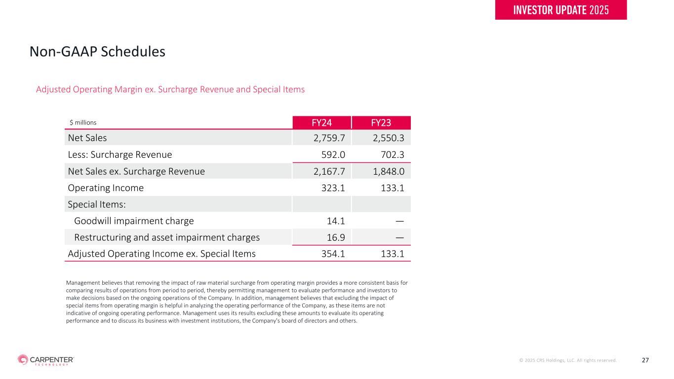 ©2025年CRS控股有限责任公司。版权所有。非美国通用会计准则附表27调整后营业利润率ex。附加费收入和特殊项目百万美元FY24 FY23净销售额2,759.72,550.3减:附加费收入592.070 2.3净销售额ex。附加费收入2,167.71,848.0营业收入323.11 33.1特殊项目:商誉减值费用14.1 —重组和资产减值费用16.9 —调整后营业收入ex。特殊项目354.11 33.1管理层认为,从营业利润率中剔除原材料附加费的影响,为比较不同时期的经营业绩提供了更一致的基础,从而使管理层能够评估业绩,并使投资者能够根据公司的持续经营做出决策。此外,管理层认为,从营业利润率中剔除特殊项目的影响有助于分析公司的经营业绩,因为这些项目并不代表持续的经营业绩。管理层使用不包括这些金额的结果来评估其经营业绩,并与投资机构、公司董事会和其他方面讨论其业务。