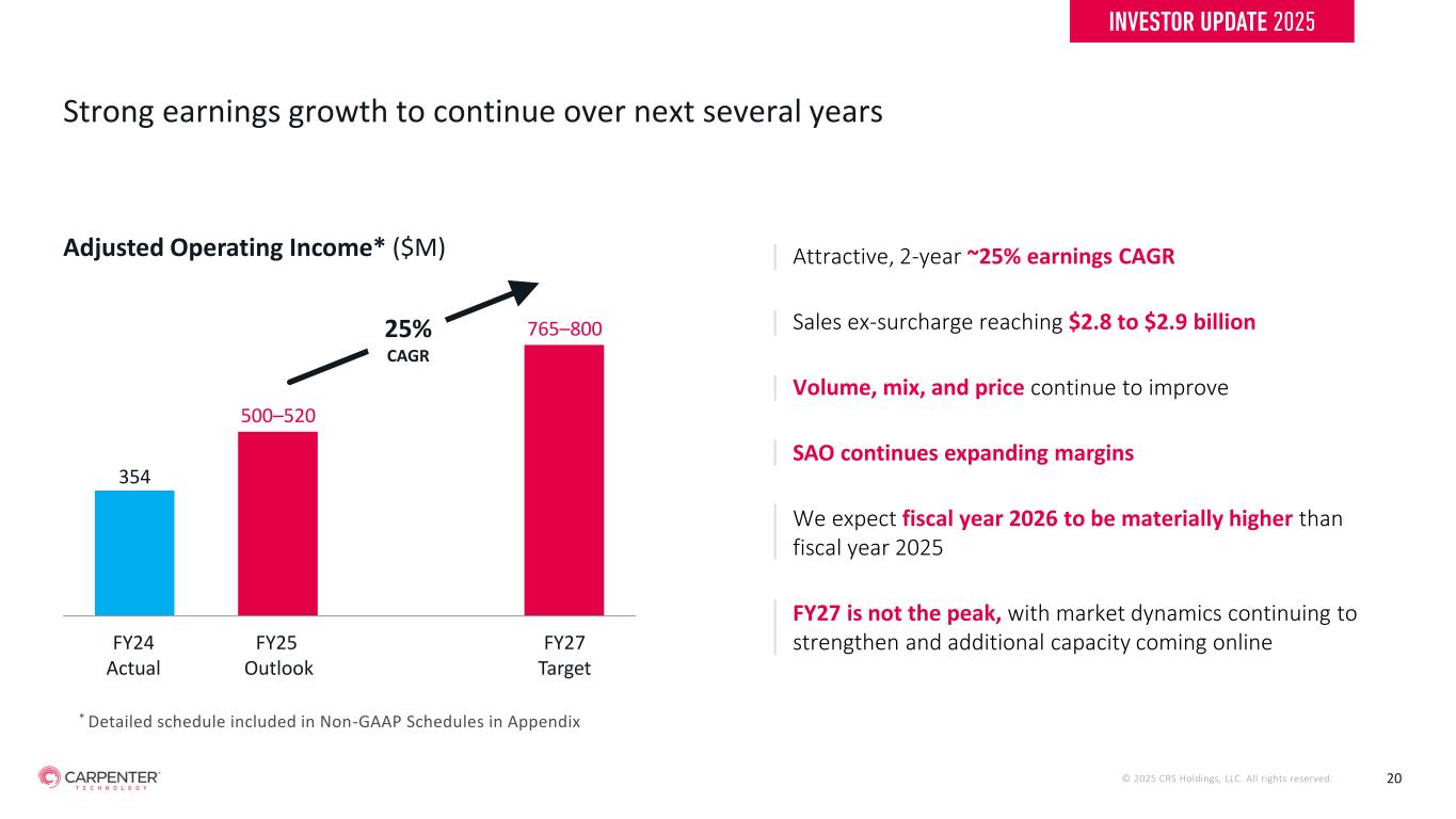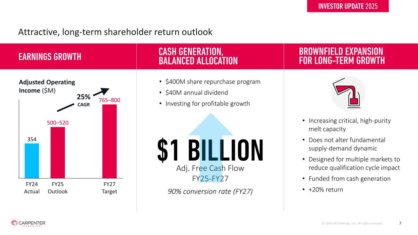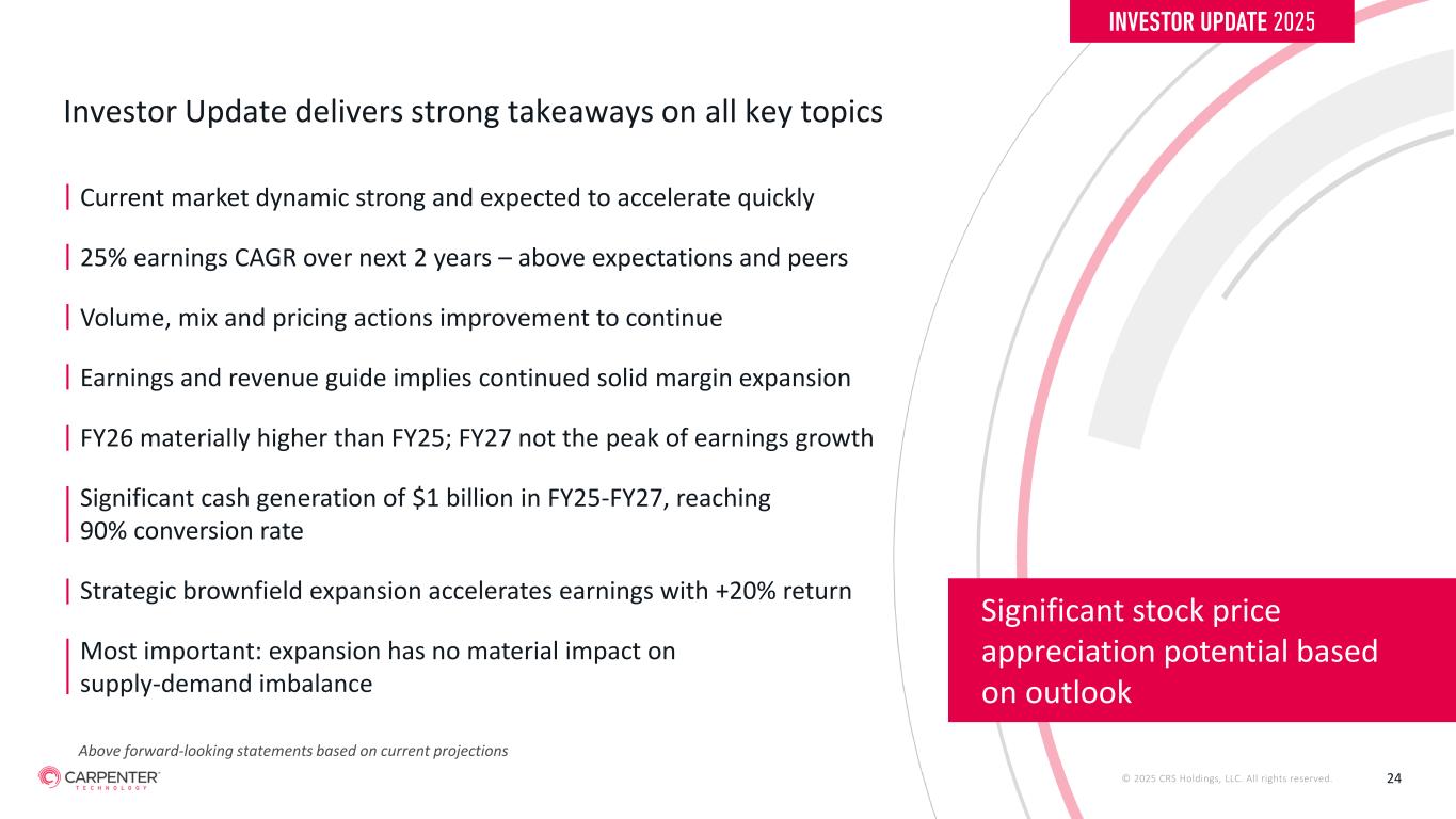 ©2025年CRS控股有限责任公司。版权所有。投资者更新就所有关键主题提供了强有力的要点24当前市场动态强劲,预计未来2年将迅速加速25%的盈利复合年增长率——高于预期和同行的数量、组合和定价行动改善将继续盈利和收入指南意味着26财年的利润率持续稳健扩张,大大高于25财年;27财年不是盈利增长的高峰,25-27财年产生了10亿美元的显着现金,达到90%转化率战略棕地扩张加速盈利+ 20%回报率最重要:扩张对供需失衡没有实质性影响以上基于当前预测的前瞻性陈述基于前景的显着股价升值潜力