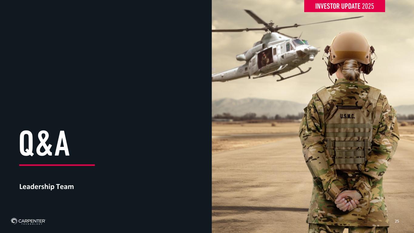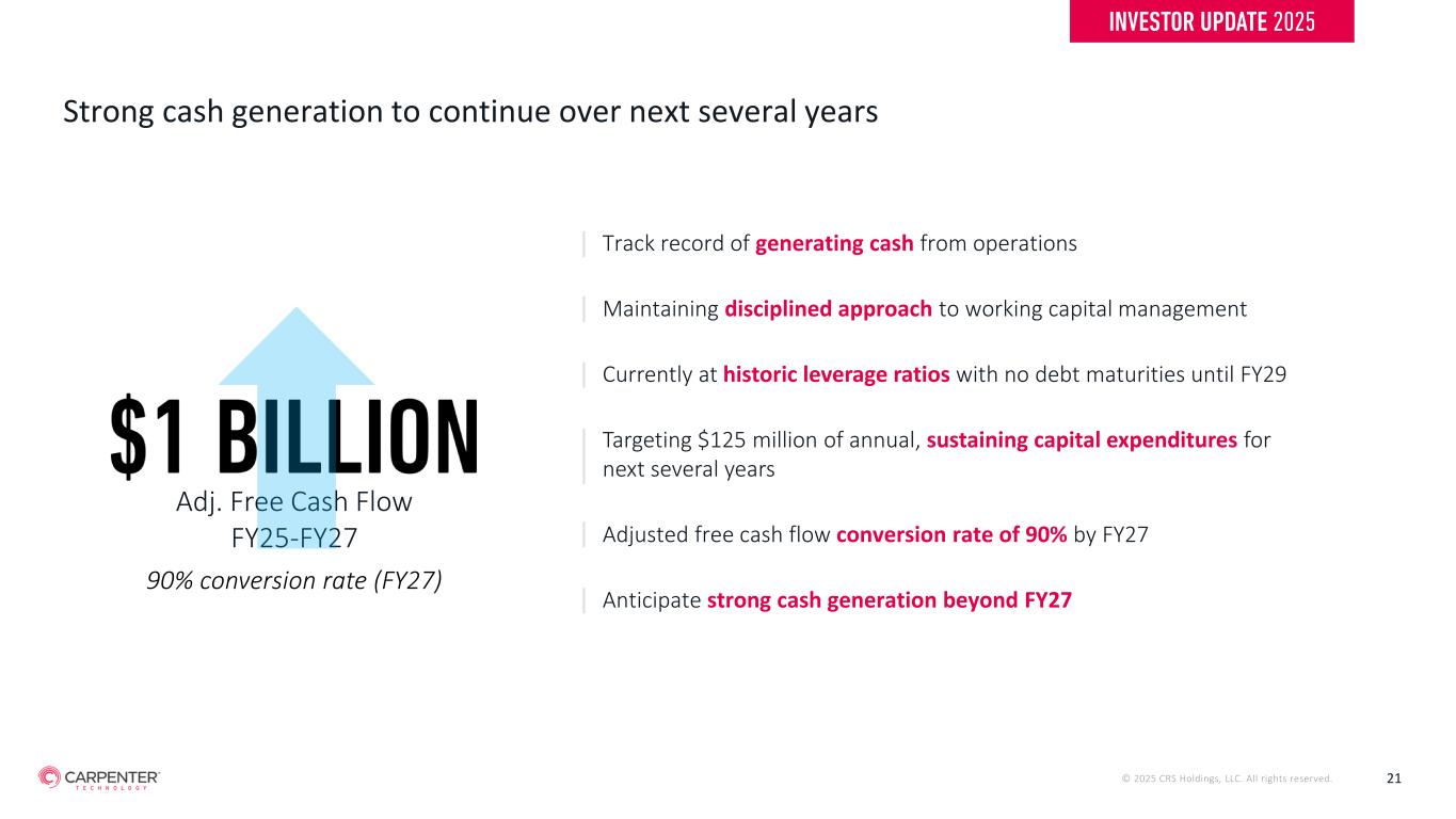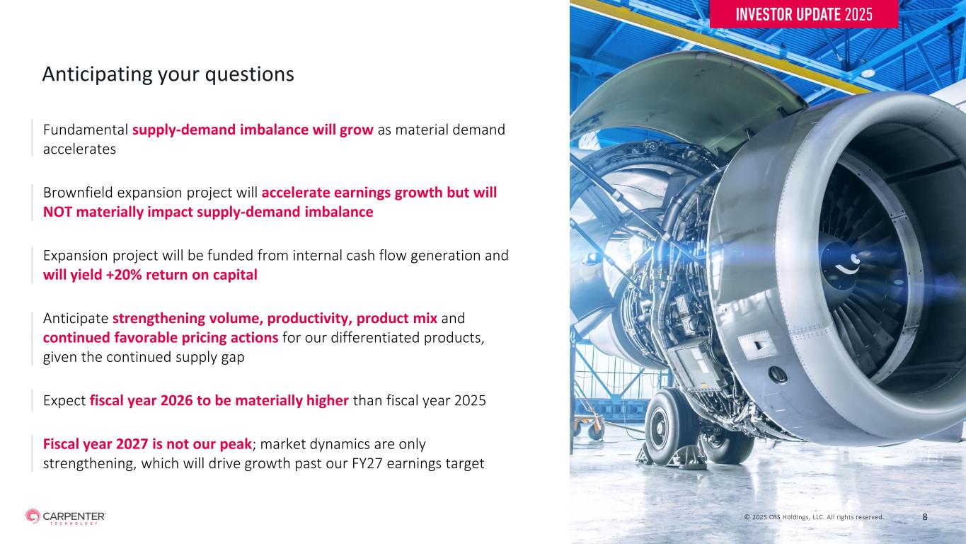 ©2025年CRS控股有限责任公司。版权所有。投资者更新就所有关键主题提供了强有力的要点24当前市场动态强劲,预计未来2年将迅速加速25%的盈利复合年增长率——高于预期和同行的数量、组合和定价行动改善将继续盈利和收入指南意味着26财年的利润率持续稳健扩张,大大高于25财年;27财年不是盈利增长的高峰,25-27财年产生了10亿美元的显着现金,达到90%转化率战略棕地扩张加速盈利+ 20%回报率最重要:扩张对供需失衡没有实质性影响以上基于当前预测的前瞻性陈述基于前景的显着股价升值潜力