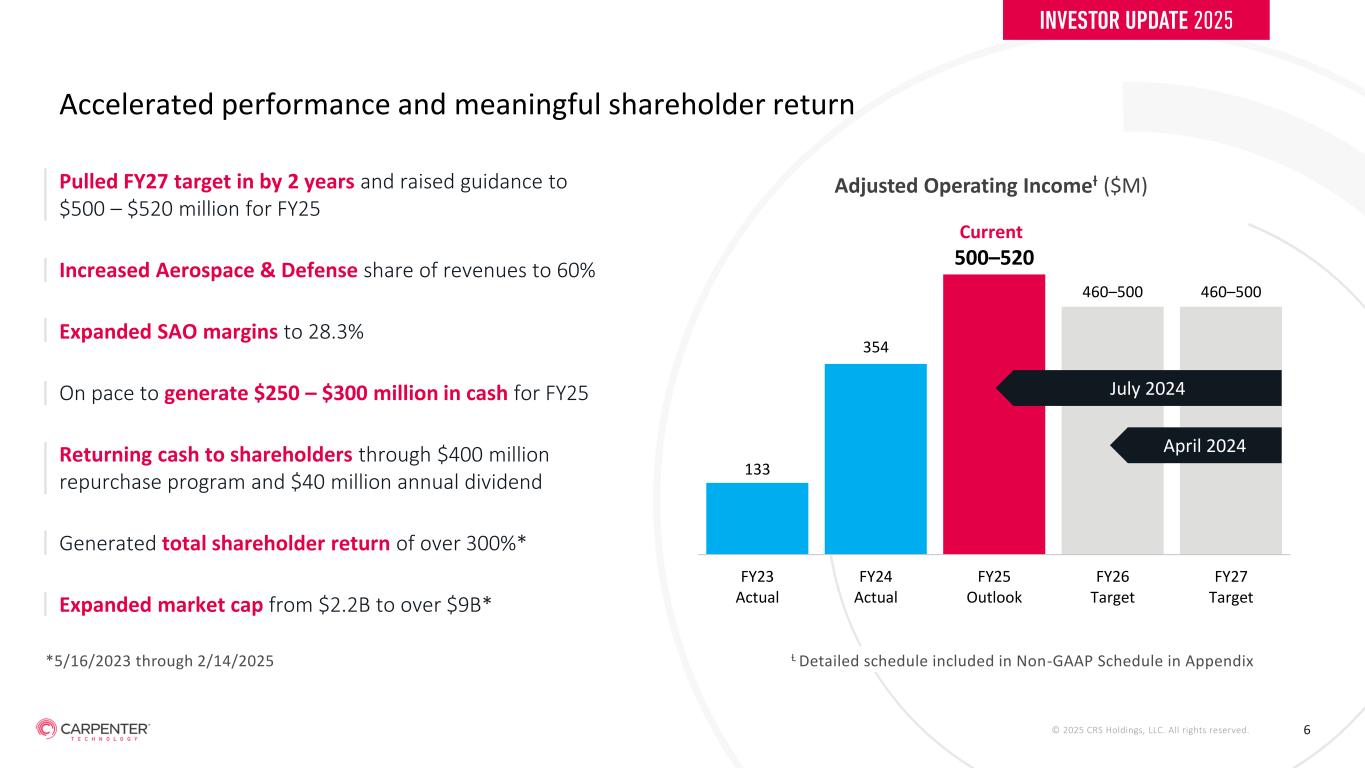 ©2025年CRS控股有限责任公司。版权所有。将27财年的目标在2年内拉高,并将25财年的指引提高至500 – 5.2亿美元将航空航天和国防部门的收入份额提高至60%将SAO利润率扩大至28.3%,有望在25财年产生250 – 3亿美元的现金通过4亿美元的回购计划和4000万美元的年度股息向股东返还现金,产生了超过300%的股东总回报*市值从$ 2.2B扩大到$ 9B以上*业绩加速和有意义的股东回报133354500 – 520460 – 500460 – 50023财年实际FY24实际FY25展望FY26目标FY27目标调整后营业收入(百万美元)当前2024年4月2024年7月6附录中非公认会计原则附表中包含的详细时间表*2023年5月16日至2025年2月14日