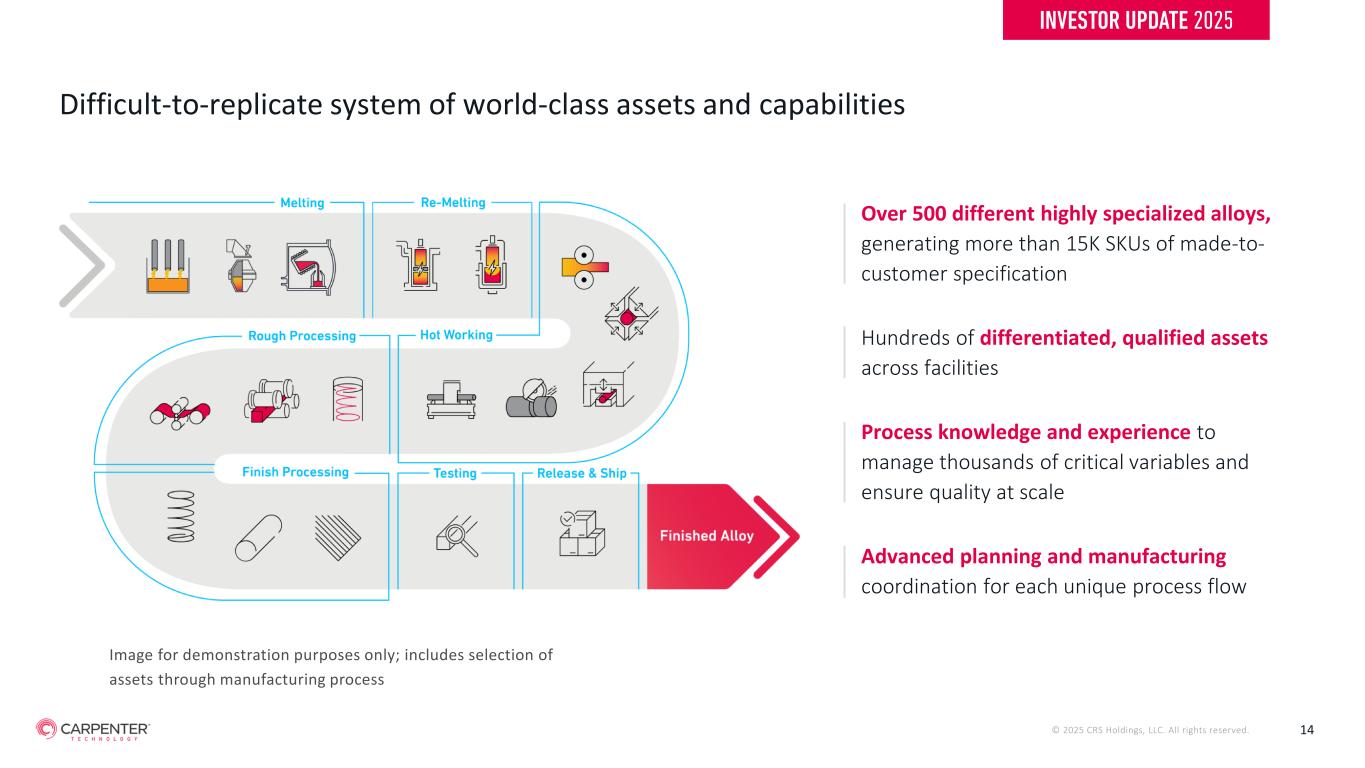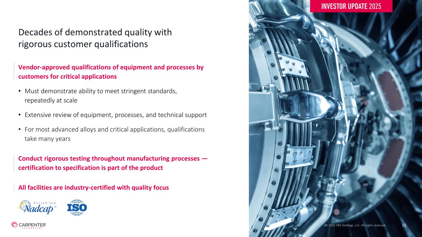 ©2025年CRS控股有限责任公司。版权所有。难以复制的世界级资产和能力体系14超过500种不同的高度专业化合金,产生超过15000个定制客户规格的SKU数百种跨设施的差异化合格资产流程知识和经验,以管理数千个关键变量并确保规模质量先进的规划和制造协调,每个独特的工艺流程图像仅用于演示目的;包括通过制造流程选择资产