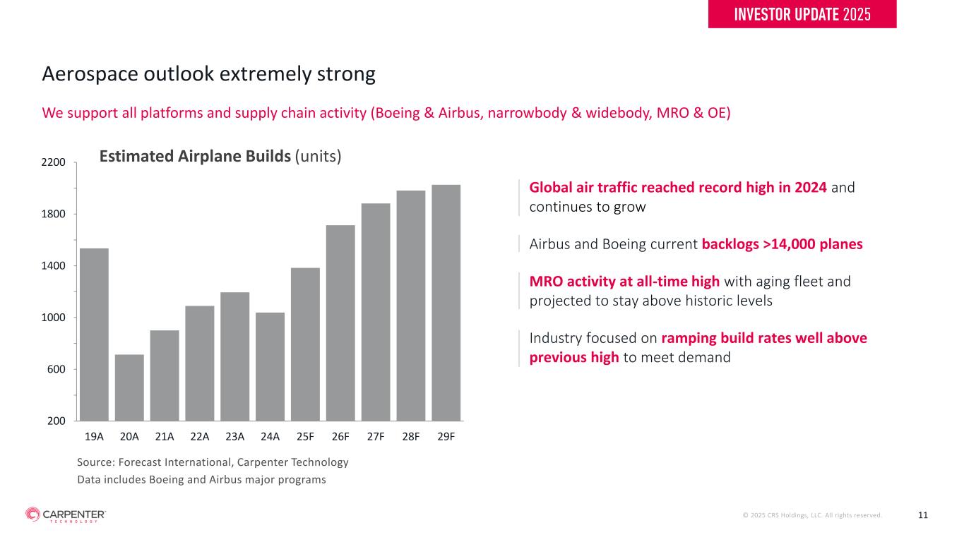 ©2025年CRS控股有限责任公司。版权所有。高价值、高增长市场和应用领域的强劲需求10航空航天•全球旅行需求不断创下新纪录•对新飞机和相关材料的高需求•服役中的老旧飞机和新平台大修推动增加的MRO需求防御•增加对各种平台的支出,鉴于地缘政治环境•下一代平台需要先进的解决方案医疗•全球人口老龄化和医疗程序增加•发展中经济体的需求不断增长•产品可改善患者的治疗效果发电•能源需求不断增加,以支持数字和人工智能的快速增长•工业燃气轮机建造和MRO活动的关键产品半导体•不断增长的半导体需求推动基础设施建设
