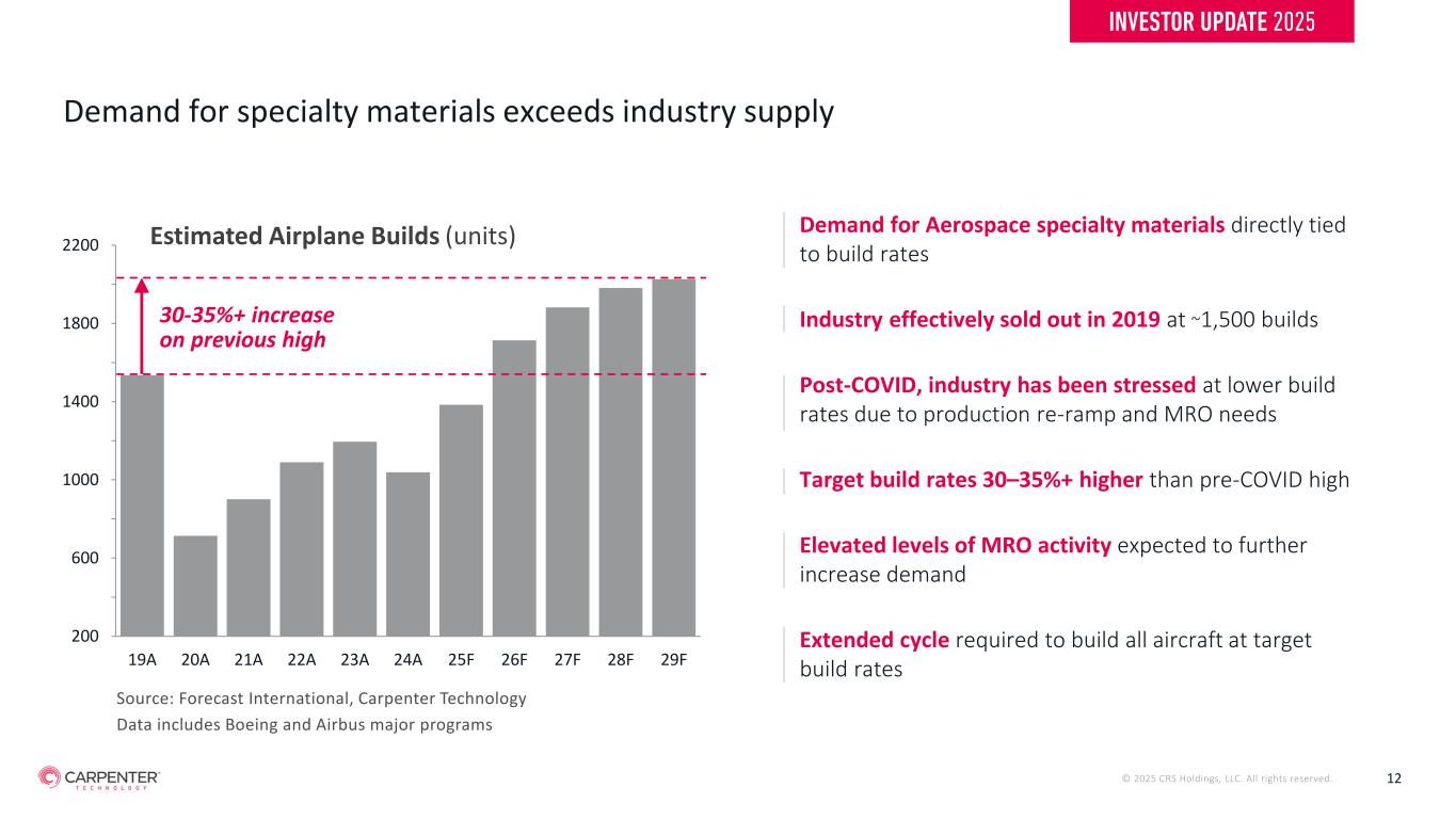 ©2025年CRS控股有限责任公司。版权所有。2006001000140018002200 19A 20A 21A 22A 23A 24A 25F 26F 27F 28F 29F估计飞机建造(单位)对与建造率直接相关的航空航天特种材料的需求行业在2019年有效售罄,约为1,500次建造后的新冠疫情,由于生产重新爬坡和MRO需求,行业一直承受着较低的建造速度带来的压力目标建造速度30 – 35% +高于新冠疫情前的高水平MRO活动的升高水平预计将进一步增加需求以目标建造速度建造所有飞机所需的延长周期对特种材料的需求超过行业供应30-35 % +在之前的高点上增加12来源:Forecast International,卡朋特科技数据包括波音和空客主要计划