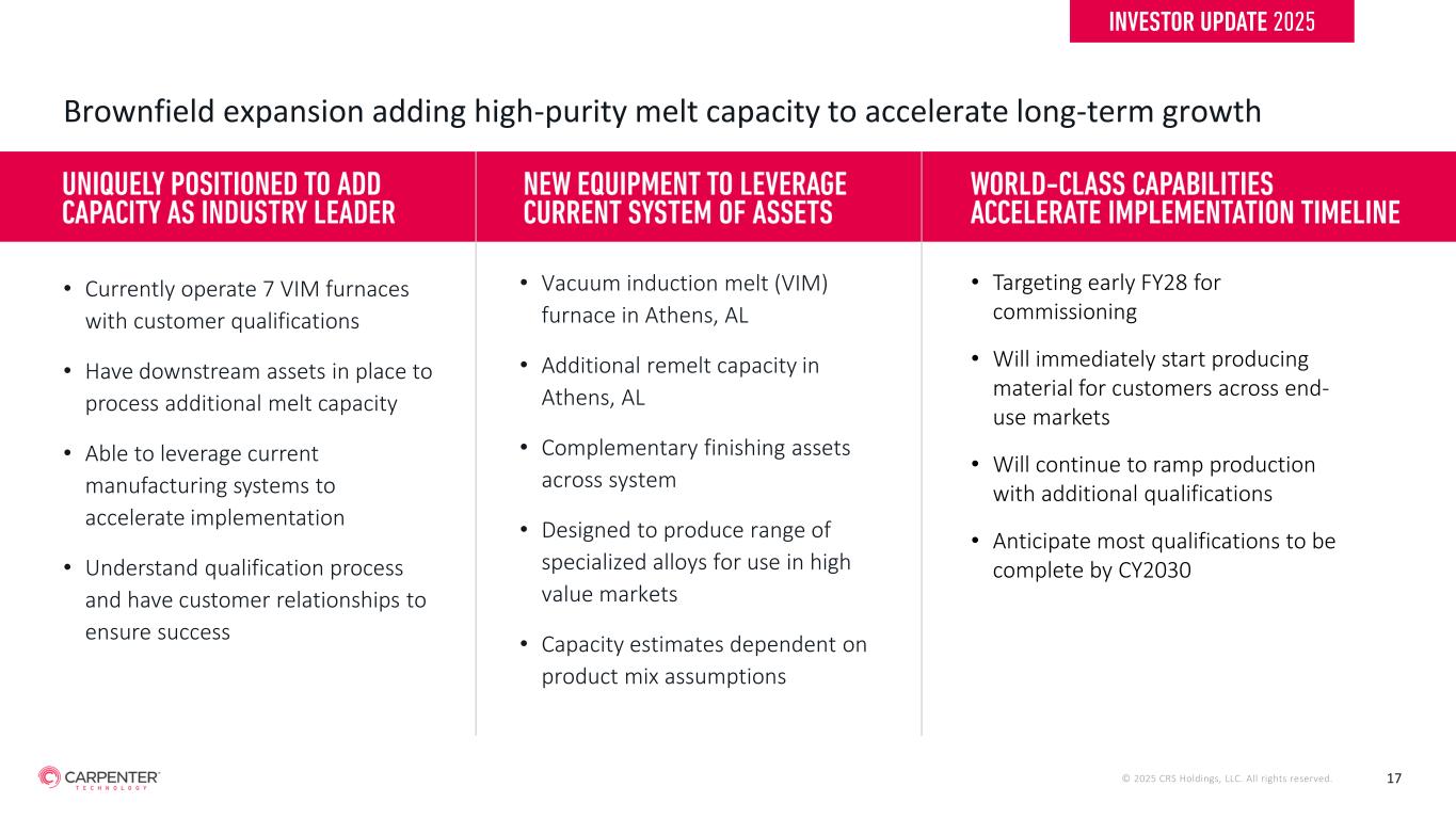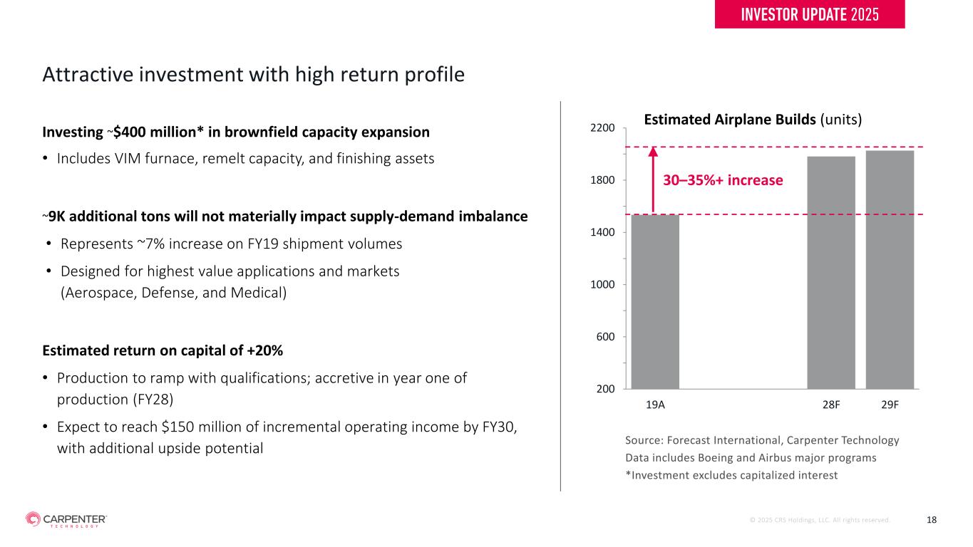 ©2025年CRS控股有限责任公司。版权所有。•位于阿拉巴马州雅典的真空感应熔体(VIM)炉•位于雅典的额外重熔产能,AL •跨系统互补精加工资产•旨在生产用于高价值市场的一系列专用合金•产能估计取决于产品组合假设棕地扩张增加高纯熔体产能以加速长期增长17 •目前运营7座具有客户资质的VIM熔炉•拥有下游资产以处理额外的熔体产能•能够利用当前的制造系统加速实施•了解资质流程并与客户建立关系以确保成功•目标是在28财年初进行调试•将立即开始为终端使用市场的客户生产材料•将继续以额外的资质增加产量•预计大多数资质将在CY2030之前完成