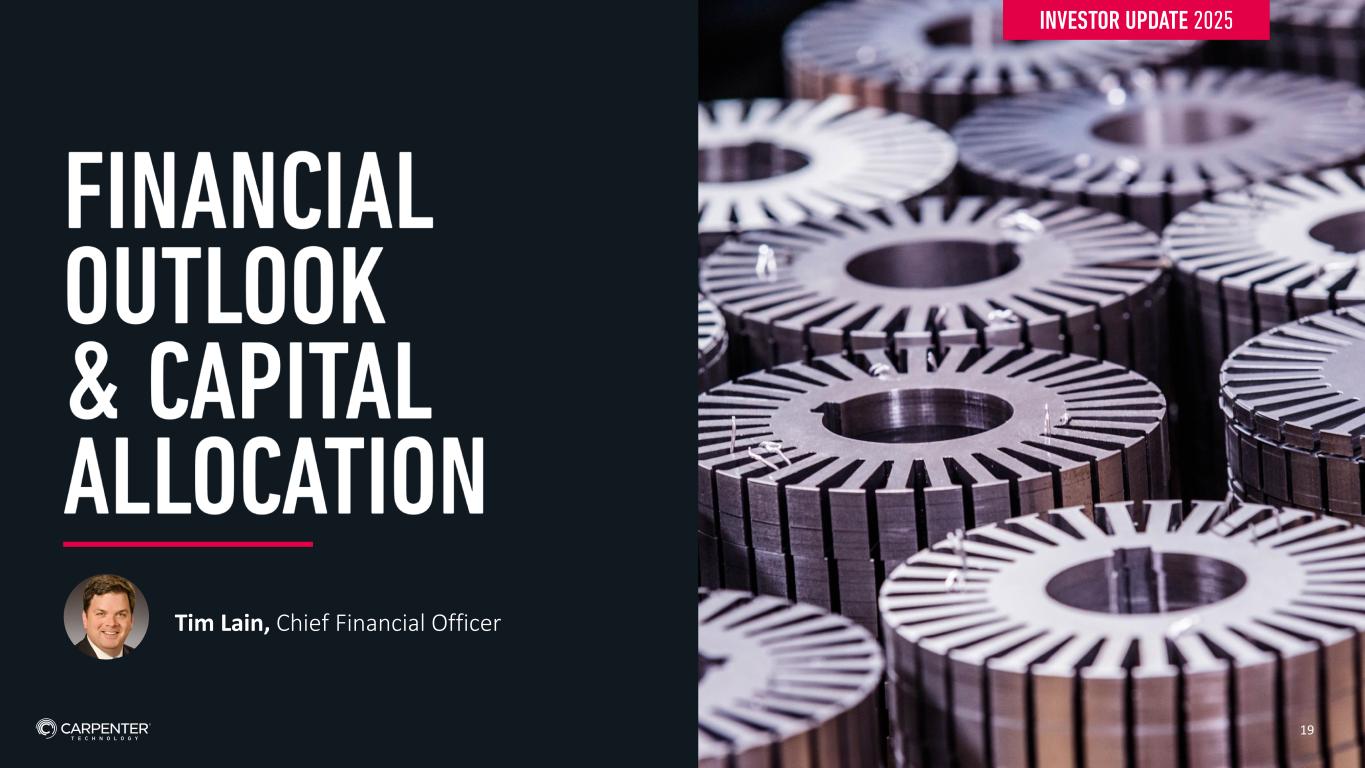 ©2025年CRS控股有限责任公司。版权所有。投资约4亿美元*在棕地产能扩张•包括VIM炉、重熔产能和精加工资产~9k额外吨不会对供需失衡产生实质性影响•代表2019财年出货量增加~7% •专为最高价值应用和市场(航空航天、国防和医疗)设计,预计资本回报率为+ 20% •生产将获得资格;生产的第一年(28财年)将增加•预计到30财年将达到1.5亿美元的增量营业收入,具有额外上行潜力高回报配置的有吸引力的投资182006001000140018002200 19A 28F 29F预计飞机建造(架)30 – 35% +增长来源:Forecast International,卡朋特科技数据包括波音和空客主要计划*投资不包括资本化利息
