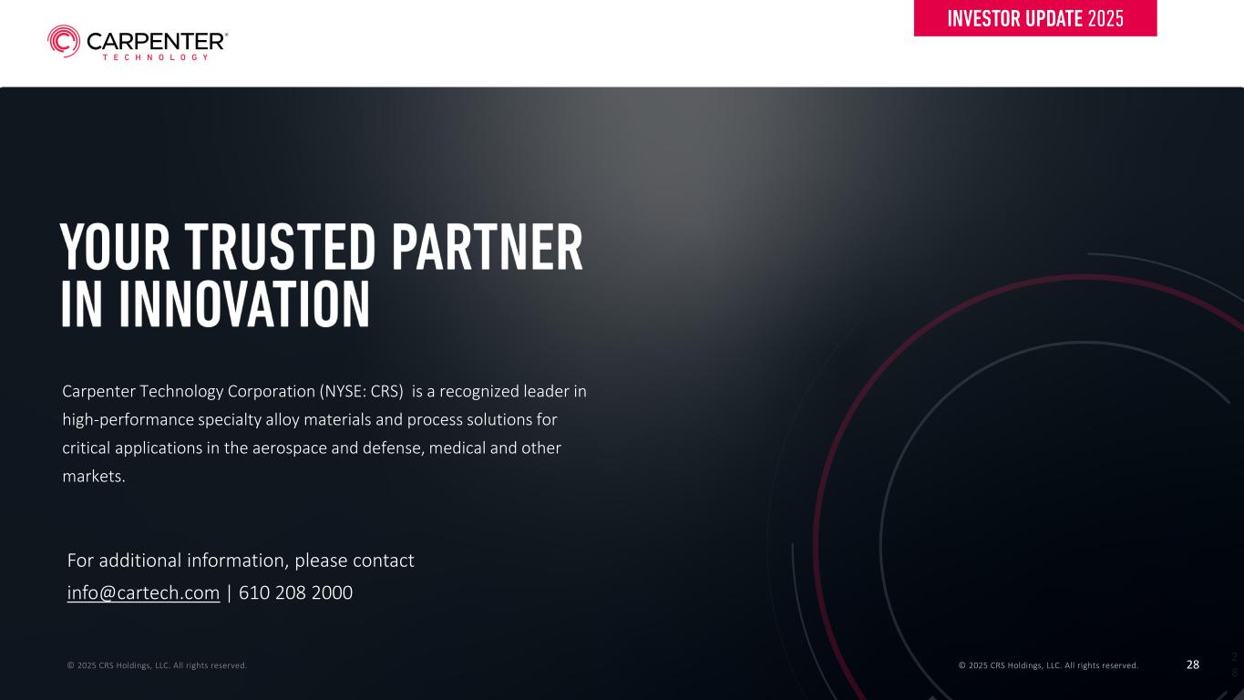 info@cartech.com欲了解更多信息,请联系info@cartech.com | 6102082000©2025年CRS控股有限责任公司。版权所有。Carpenter Technology Corporation(NYSE:CRS)是航空航天和国防、医疗和其他市场关键应用的高性能特种合金材料和工艺解决方案领域公认的领导者。2 8©2025年CRS控股有限责任公司。版权所有。28