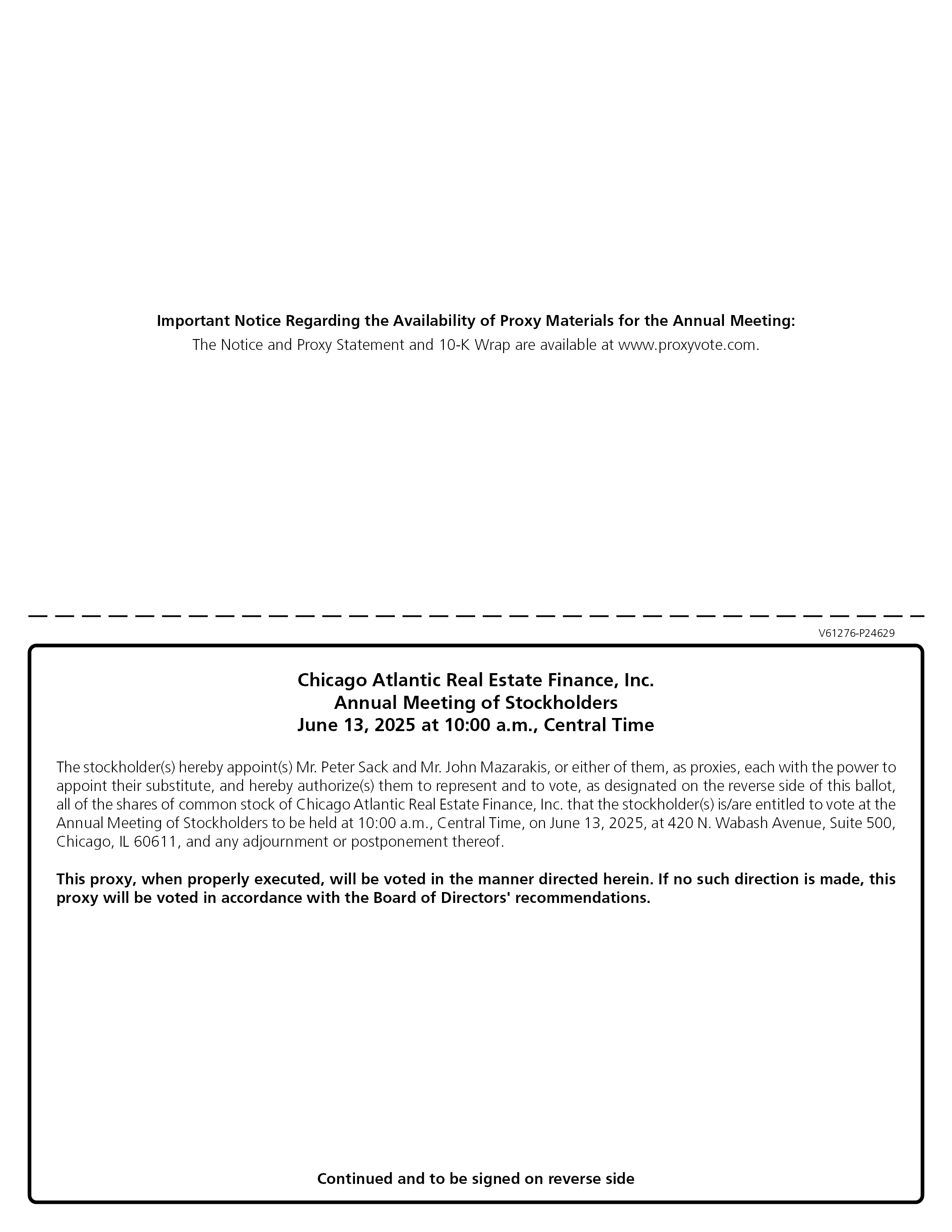 关于提供年度会议代理材料的重要通知:通知和代理声明以及10-K包装可在以下网址查阅:www.proxyvote.com.v61276-p24629Chicago Atlantic Real Estate Finance,Inc.年度股东大会美国中部时间2025年6月13日上午10:00股东(s)特此任命(s)Peter Sack先生和John Mazarakis先生或其中任何一人为代理人,各自有权任命其替代人,并在此授权(s)他们代表并投票,如本投票反面所指定的那样,Chicago Atlantic Real Estate Finance的所有普通股股份,Inc.表示,股东有/有权在美国中部时间2025年6月13日上午10:00在420 N. Wabash Avenue,Suite 500,Chicago,IL 60611举行的年度股东大会上投票,以及任何延期或延期。本委托书在得到适当执行后,将按照此处指示的方式进行投票。如无此指示,本代表将按照董事会建议进行表决。续并在反面签署