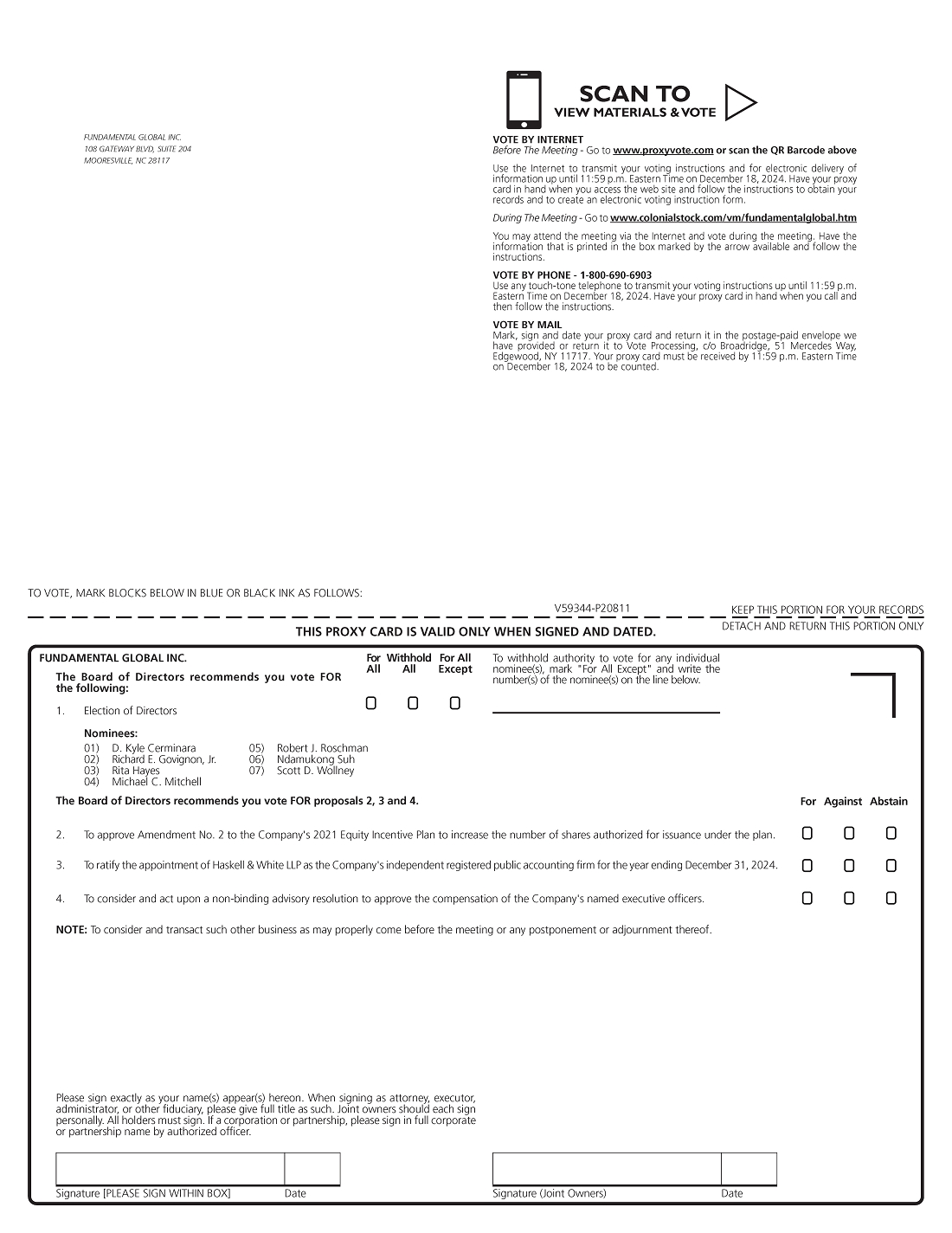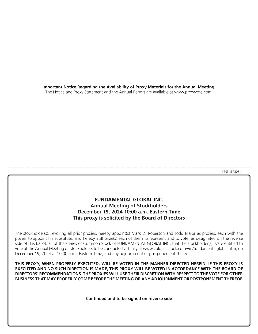 诚邀您参加我们的2024年度股东大会,该会议将于美国东部时间2024年12月19日上午10:00在https://www.colonialstock.com/vm/fundamentalglobal.htm以虚拟方式进行,以及出于以下目的的任何休会或延期: