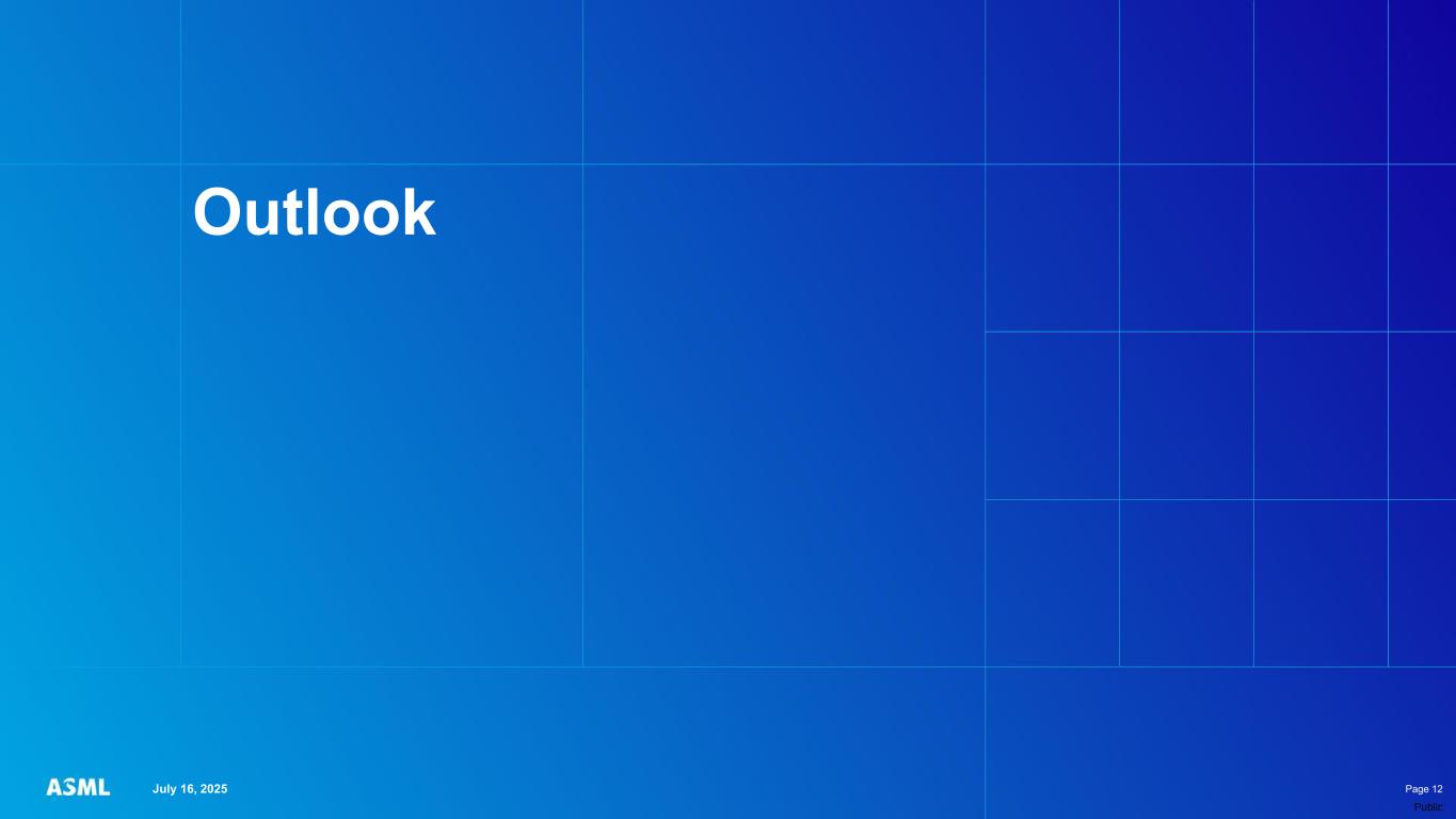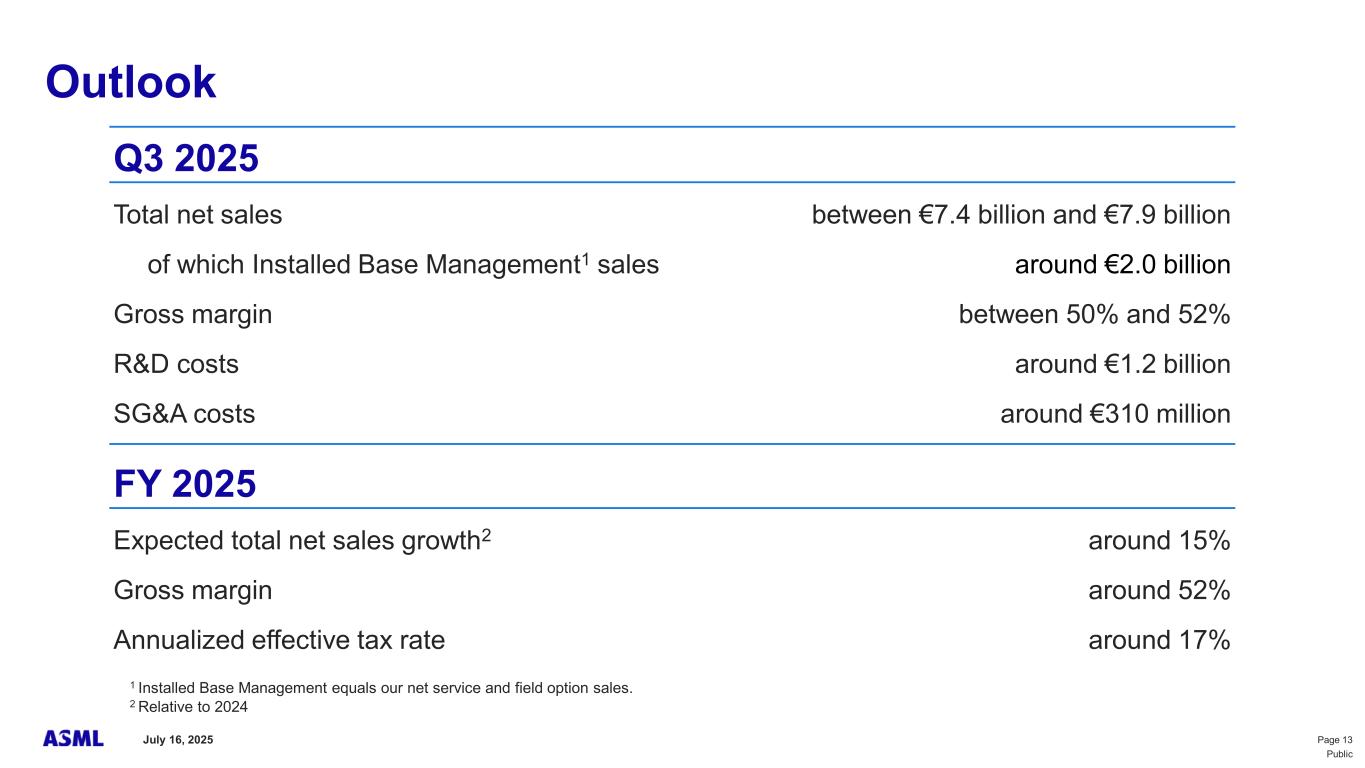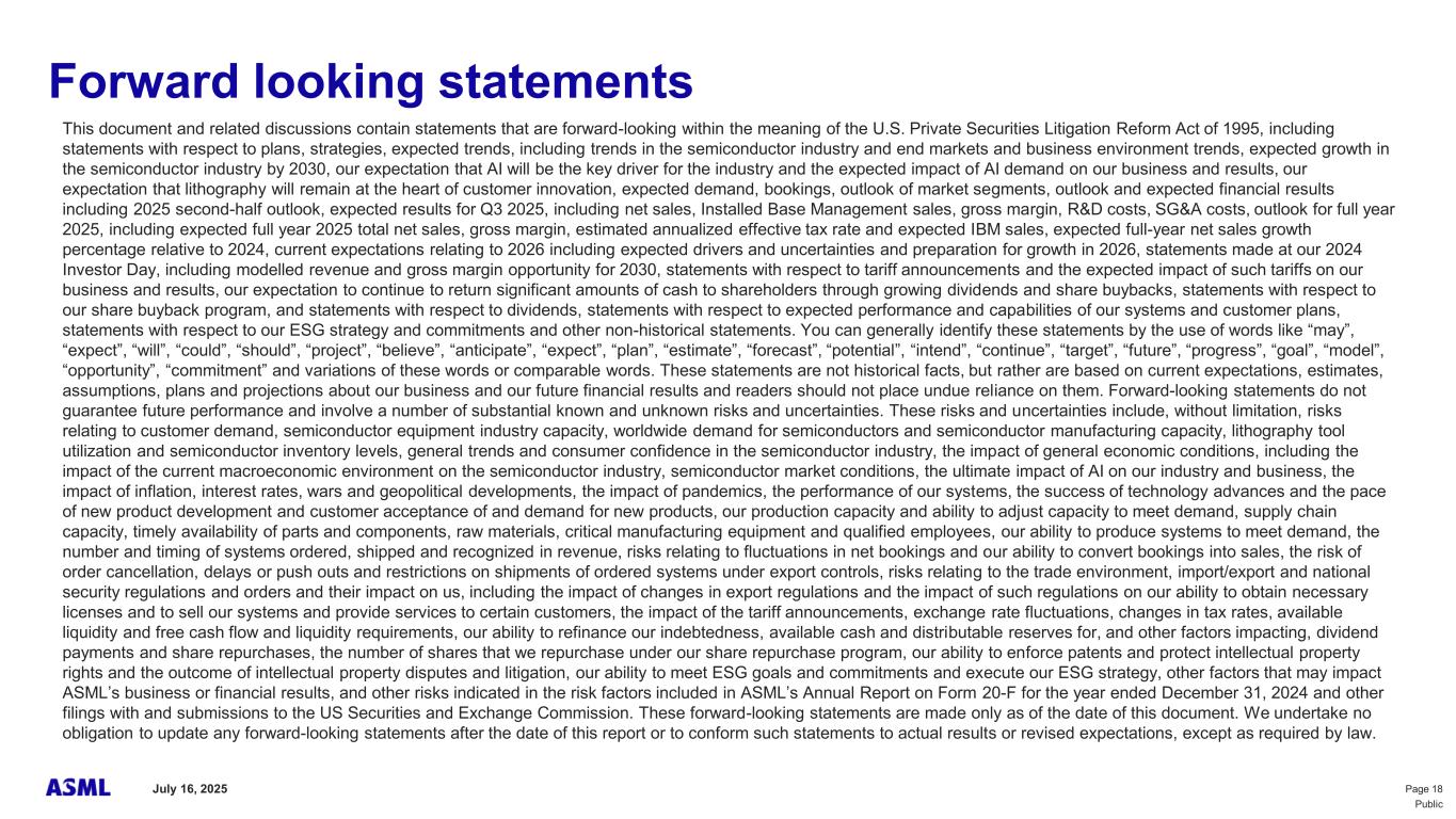 第18页2025年7月16日公开本文件和相关讨论包含1995年美国《私人证券诉讼改革法案》含义内的前瞻性陈述,包括有关计划、战略、预期趋势的陈述,包括半导体行业和终端市场的趋势和商业环境趋势、半导体行业到2030年的预期增长、我们对人工智能将成为行业关键驱动因素的预期以及人工智能需求对我们的业务和业绩的预期影响、我们对光刻技术仍将是客户创新、预期需求、预订的核心的预期,细分市场的展望、展望和预期财务业绩,包括2025年下半年展望、2025年第三季度的预期业绩,包括净销售额、已安装基地管理销售额、毛利率、研发成本、SG & A成本、2025年全年展望,包括预计2025年全年总净销售额、毛利率、估计年化有效税率和预期IBM销售额、相对于2024年的预期全年净销售额增长百分比、与2026年相关的当前预期,包括预期驱动因素和不确定性以及为2026年增长做准备,在2024年投资者日发表的声明,包括2030年的模拟收入和毛利率机会,关于关税公告的声明以及此类关税对我们的业务和业绩的预期影响,我们期望通过不断增加的股息和股票回购继续向股东返还大量现金,关于我们的股票回购计划的声明,以及关于股息的声明,关于我们系统和客户计划的预期业绩和能力的声明,关于我们的ESG战略和承诺的声明以及其他非历史性声明。你一般可以通过使用“可能”、“预期”、“将”、“可以”、“应该”、“项目”、“相信”、“预期”、“计划”、“估计”、“预测”、“潜力”、“打算”、“继续”、“目标”、“未来”、“进展”、“目标”、“模式”、“机会”、“承诺”等词语来识别这些陈述,以及这些词语或类似词语的变体。这些陈述不是历史事实,而是基于当前对我们业务和未来财务业绩的预期、估计、假设、计划和预测,读者不应过分依赖它们。前瞻性陈述并不能保证未来的业绩,并涉及大量已知和未知的重大风险和不确定性。这些风险和不确定性包括但不限于与客户需求、半导体设备行业产能、全球对半导体和半导体制造产能的需求、光刻工具利用率和半导体库存水平、半导体行业的一般趋势和消费者信心、总体经济状况的影响,包括当前宏观经济环境对半导体行业的影响、半导体市场状况、人工智能对我们的行业和业务的最终影响、通货膨胀、利率、战争和地缘政治发展的影响、流行病的影响、我们系统的性能,技术进步的成功和新产品开发的速度以及客户对新产品的接受和需求,我们的生产能力和调整能力以满足需求,供应链能力,零部件、原材料、关键制造设备和合格员工的及时可用性,我们生产系统以满足需求的能力,订购、发货和在收入中确认的系统的数量和时间,与净预订量波动和我们将预订转化为销售的能力有关的风险,订单取消的风险,在出口管制下订购系统的延迟或推出和限制发货、与贸易环境、进出口和国家安全法规和订单相关的风险及其对我们的影响,包括出口法规变化的影响和此类法规对我们获得必要许可证以及向某些客户销售我们的系统和提供服务的能力的影响、关税公告的影响、汇率波动、税率变化、可用流动性和自由现金流以及流动性要求、我们为债务再融资的能力、可用现金和可分配准备金,以及其他影响因素,股息支付和股份回购,我们根据股份回购计划回购的股份数量,我们执行专利和保护知识产权的能力以及知识产权纠纷和诉讼的结果,我们实现ESG目标和承诺以及执行ESG战略的能力,可能影响ASML业务或财务业绩的其他因素, 以及ASML截至2024年12月31日止年度的20-F表格年度报告以及向美国证券交易委员会提交和提交的其他文件中包含的风险因素中提示的其他风险。这些前瞻性陈述仅在本文件发布之日作出。除法律要求外,我们不承担在本报告发布之日后更新任何前瞻性陈述或使此类陈述符合实际结果或经修订的预期的义务。前瞻性陈述