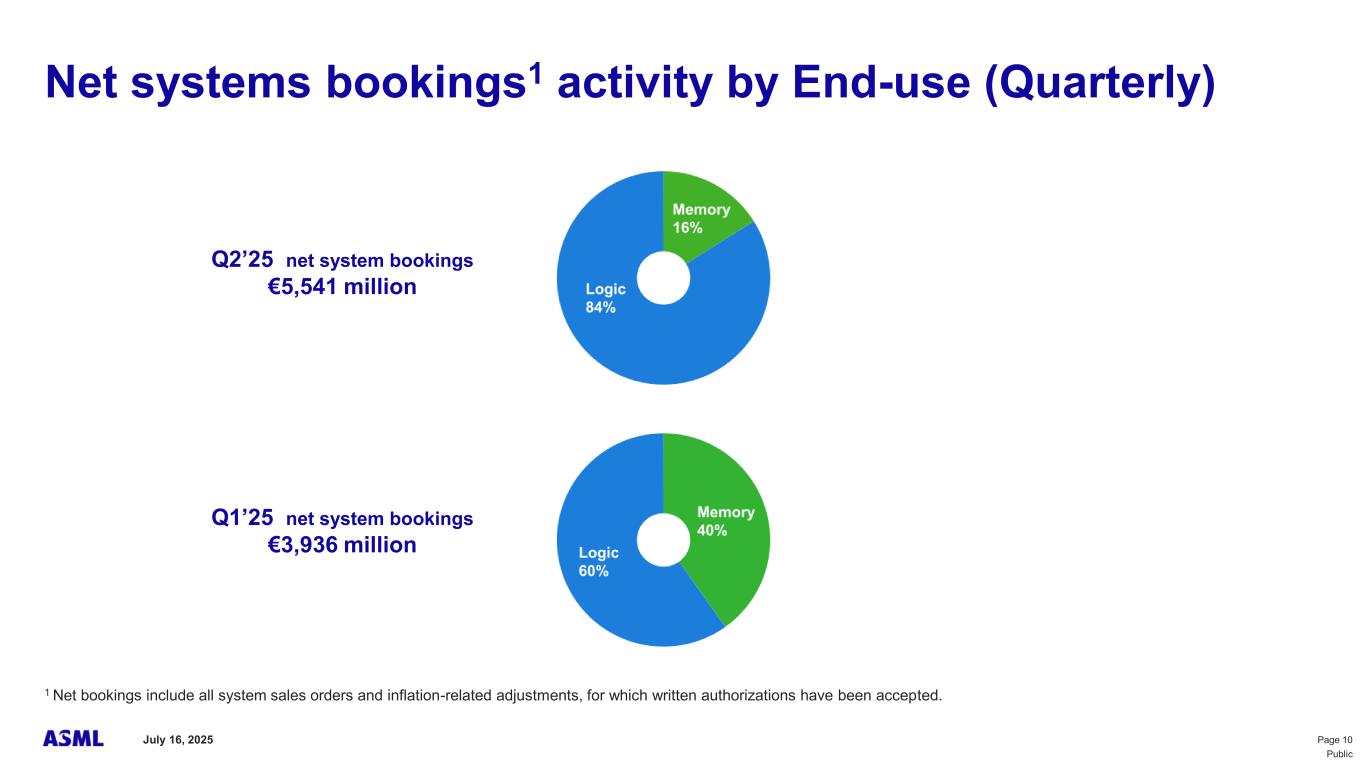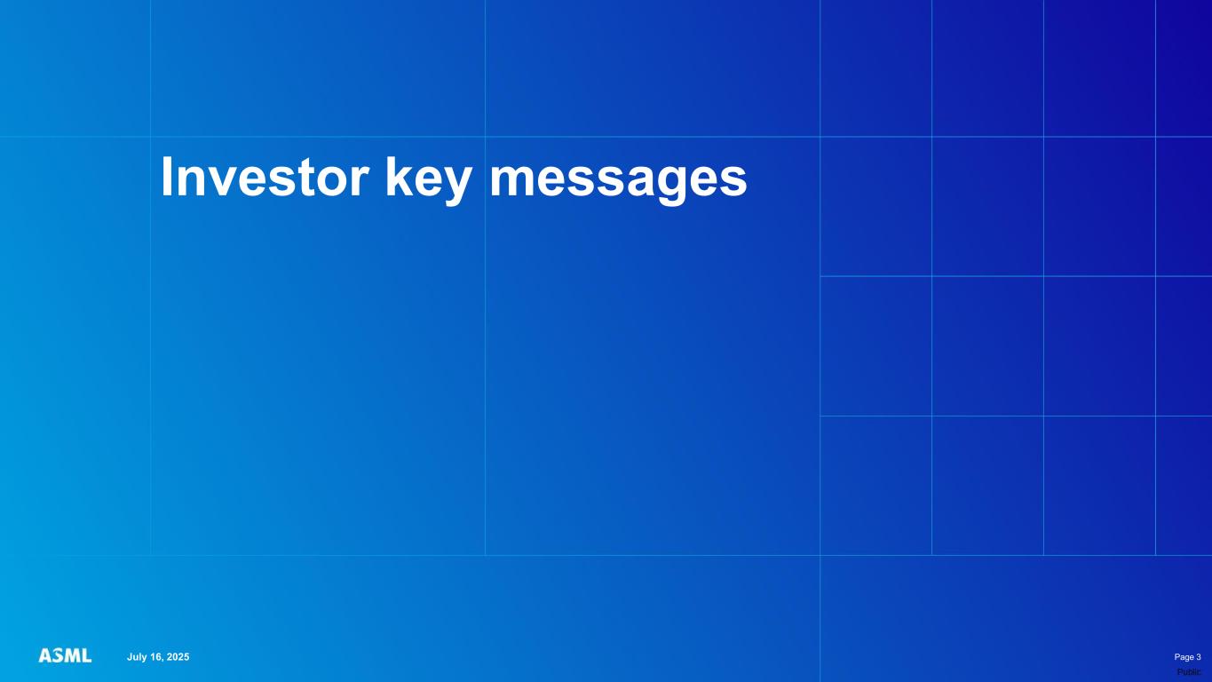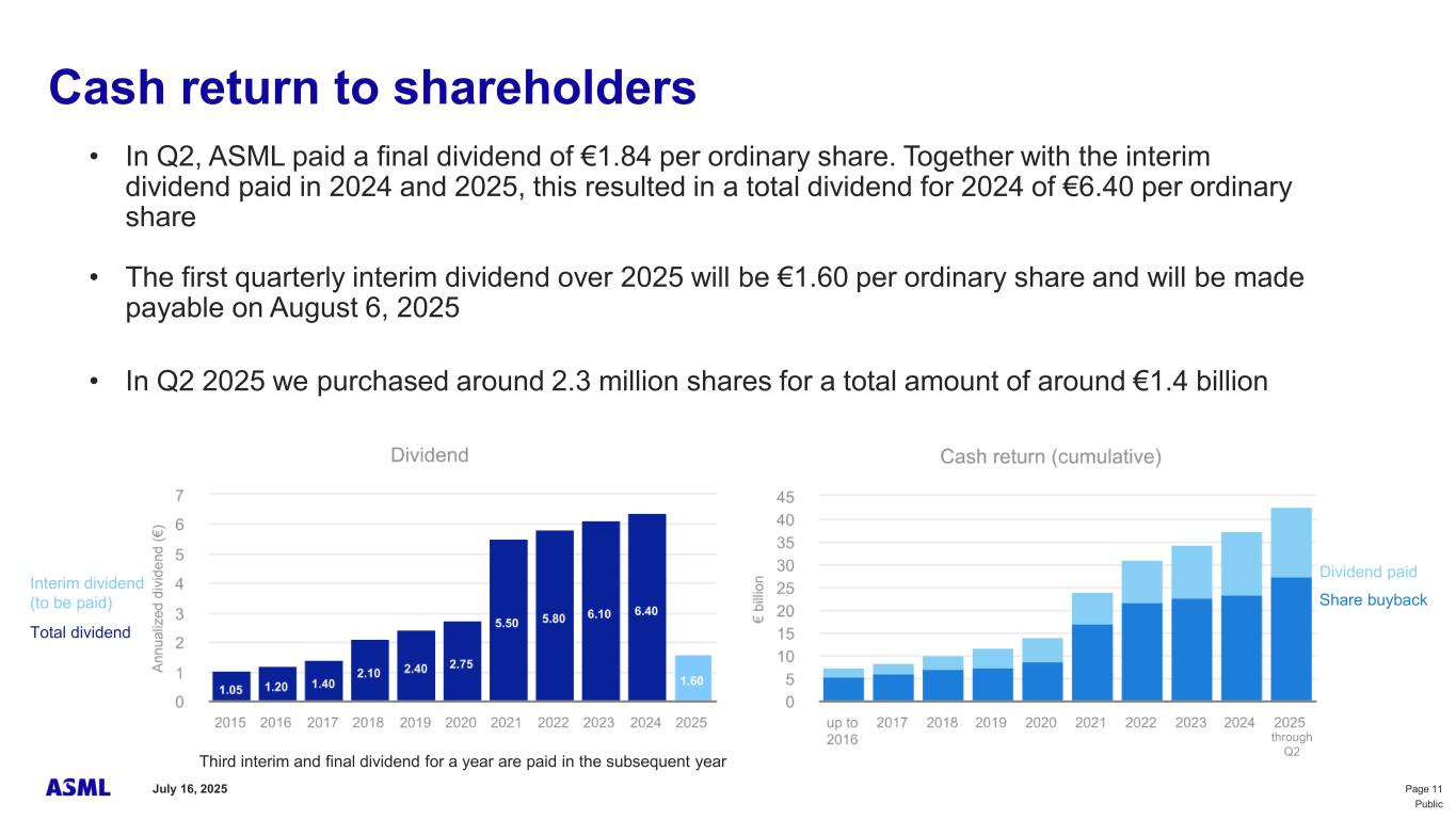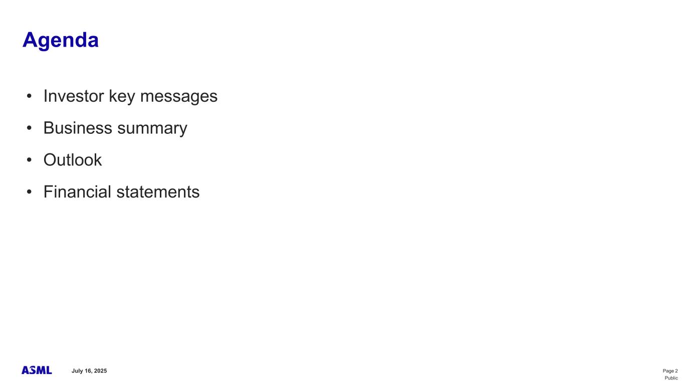 第18页2025年7月16日公开本文件和相关讨论包含1995年美国《私人证券诉讼改革法案》含义内的前瞻性陈述,包括有关计划、战略、预期趋势的陈述,包括半导体行业和终端市场的趋势和商业环境趋势、半导体行业到2030年的预期增长、我们对人工智能将成为行业关键驱动因素的预期以及人工智能需求对我们的业务和业绩的预期影响、我们对光刻技术仍将是客户创新、预期需求、预订的核心的预期,细分市场的展望、展望和预期财务业绩,包括2025年下半年展望、2025年第三季度的预期业绩,包括净销售额、已安装基地管理销售额、毛利率、研发成本、SG & A成本、2025年全年展望,包括预计2025年全年总净销售额、毛利率、估计年化有效税率和预期IBM销售额、相对于2024年的预期全年净销售额增长百分比、与2026年相关的当前预期,包括预期驱动因素和不确定性以及为2026年增长做准备,在2024年投资者日发表的声明,包括2030年的模拟收入和毛利率机会,关于关税公告的声明以及此类关税对我们的业务和业绩的预期影响,我们期望通过不断增加的股息和股票回购继续向股东返还大量现金,关于我们的股票回购计划的声明,以及关于股息的声明,关于我们系统和客户计划的预期业绩和能力的声明,关于我们的ESG战略和承诺的声明以及其他非历史性声明。你一般可以通过使用“可能”、“预期”、“将”、“可以”、“应该”、“项目”、“相信”、“预期”、“计划”、“估计”、“预测”、“潜力”、“打算”、“继续”、“目标”、“未来”、“进展”、“目标”、“模式”、“机会”、“承诺”等词语来识别这些陈述,以及这些词语或类似词语的变体。这些陈述不是历史事实,而是基于当前对我们业务和未来财务业绩的预期、估计、假设、计划和预测,读者不应过分依赖它们。前瞻性陈述并不能保证未来的业绩,并涉及大量已知和未知的重大风险和不确定性。这些风险和不确定性包括但不限于与客户需求、半导体设备行业产能、全球对半导体和半导体制造产能的需求、光刻工具利用率和半导体库存水平、半导体行业的一般趋势和消费者信心、总体经济状况的影响,包括当前宏观经济环境对半导体行业的影响、半导体市场状况、人工智能对我们的行业和业务的最终影响、通货膨胀、利率、战争和地缘政治发展的影响、流行病的影响、我们系统的性能,技术进步的成功和新产品开发的速度以及客户对新产品的接受和需求,我们的生产能力和调整能力以满足需求,供应链能力,零部件、原材料、关键制造设备和合格员工的及时可用性,我们生产系统以满足需求的能力,订购、发货和在收入中确认的系统的数量和时间,与净预订量波动和我们将预订转化为销售的能力有关的风险,订单取消的风险,在出口管制下订购系统的延迟或推出和限制发货、与贸易环境、进出口和国家安全法规和订单相关的风险及其对我们的影响,包括出口法规变化的影响和此类法规对我们获得必要许可证以及向某些客户销售我们的系统和提供服务的能力的影响、关税公告的影响、汇率波动、税率变化、可用流动性和自由现金流以及流动性要求、我们为债务再融资的能力、可用现金和可分配准备金,以及其他影响因素,股息支付和股份回购,我们根据股份回购计划回购的股份数量,我们执行专利和保护知识产权的能力以及知识产权纠纷和诉讼的结果,我们实现ESG目标和承诺以及执行ESG战略的能力,可能影响ASML业务或财务业绩的其他因素, 以及ASML截至2024年12月31日止年度的20-F表格年度报告以及向美国证券交易委员会提交和提交的其他文件中包含的风险因素中提示的其他风险。这些前瞻性陈述仅在本文件发布之日作出。除法律要求外,我们不承担在本报告发布之日后更新任何前瞻性陈述或使此类陈述符合实际结果或经修订的预期的义务。前瞻性陈述