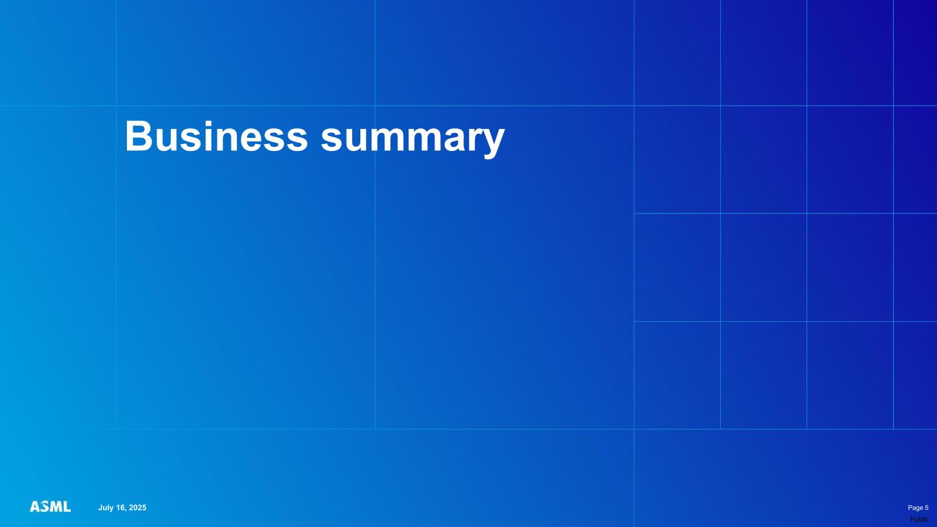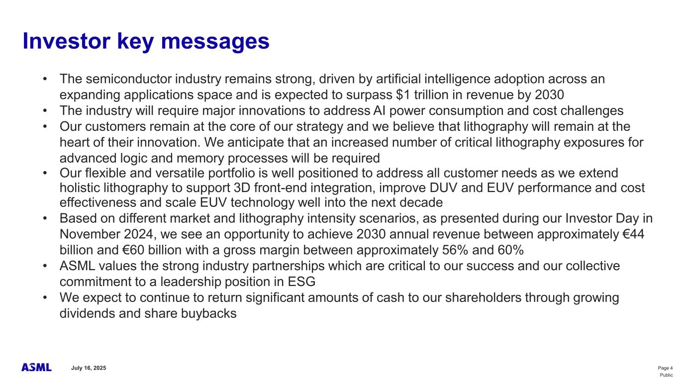 第4页2025年7月16日公众投资者关键信息•半导体行业在不断扩大的应用领域采用人工智能的推动下保持强劲,预计到2030年收入将超过1万亿美元•该行业将需要重大创新来应对AI功耗和成本挑战•我们的客户仍然是我们战略的核心,我们相信光刻技术仍将是他们创新的核心。我们预计,将需要更多用于先进逻辑和内存工艺的关键光刻曝光•我们灵活且多功能的产品组合能够很好地满足所有客户需求,因为我们将整体光刻扩展到支持3D前端集成,提高DUV和EUV性能和成本效益,并将EUV技术扩展到下一个十年•基于不同的市场和光刻强度场景,如我们在2024年11月投资者日期间所介绍的那样,我们看到了实现2030年营收约为440亿欧元至600亿欧元、毛利率约为56%至60%之间的机会• ASML重视强大的行业合作伙伴关系,这对我们的成功以及我们对ESG领导地位的集体承诺至关重要•我们希望通过不断增加的股息和股票回购,继续向股东返还大量现金