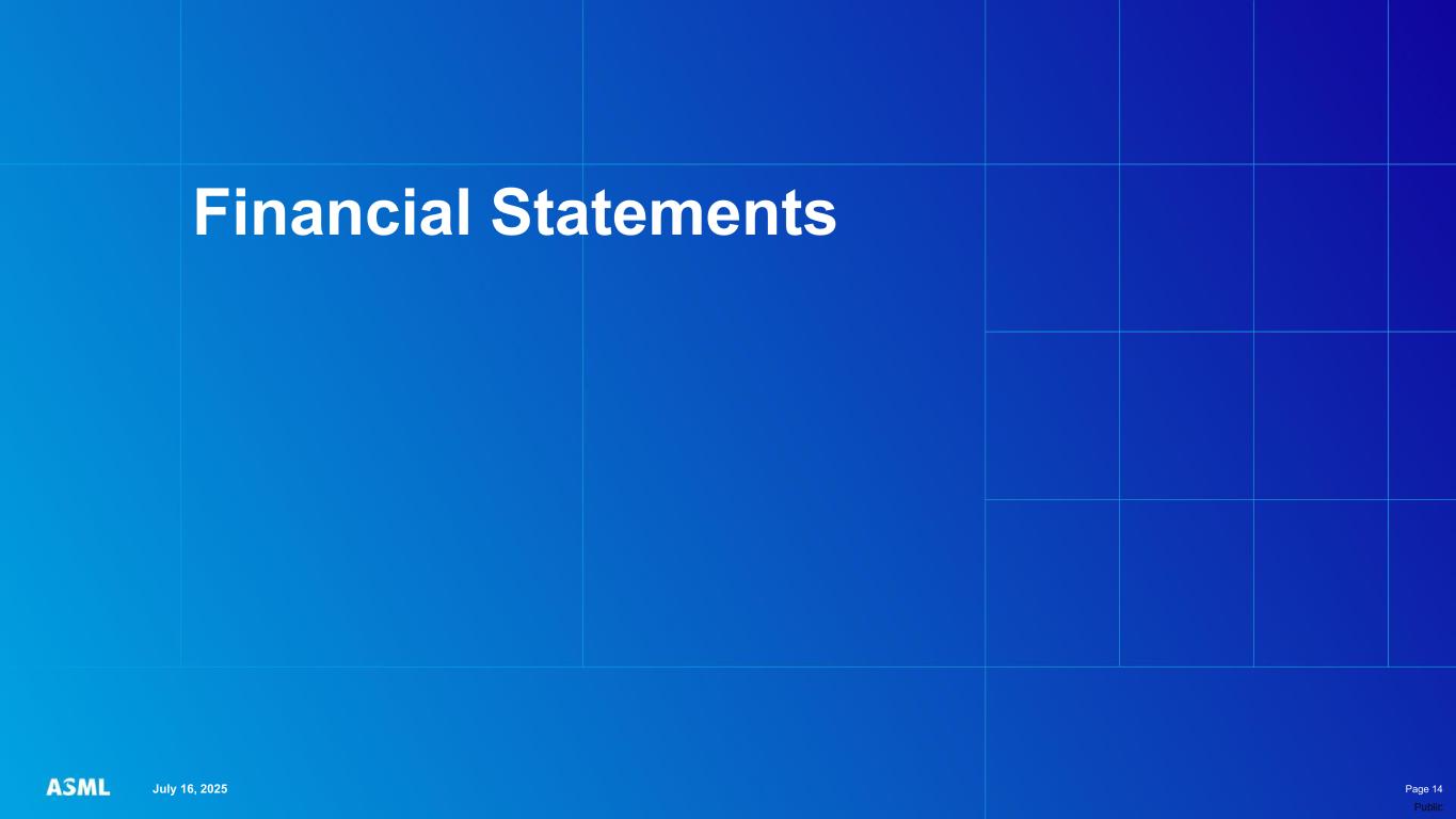 第13页2025年7月16日公共展望1已安装的基地管理等于我们的净服务和现场期权销售。2相对于2024年2025年第三季度,总净销售额在74亿欧元至79亿欧元之间,其中安装基础管理1销售额约为20亿欧元毛利率在50%至52%之间研发成本约为12亿欧元SG & A成本约为3.1亿欧元2025财年预计总净销售额增长2约为15%毛利率约为52%年化有效税率约为17%