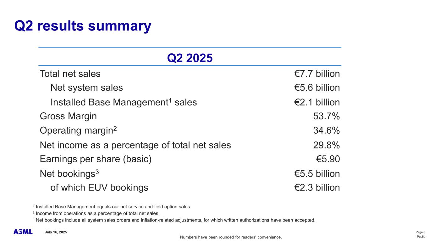 ASML 2025年第二季度荷兰维尔德霍芬2025年7月16日丨ASML报告2025年第二季度总净销售额为77亿欧元,净收入为23亿欧元2025年全年预计总净销售额增长约15%,毛利率约为52% 附件 99.2