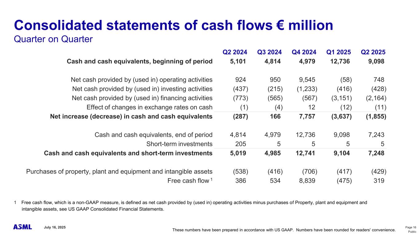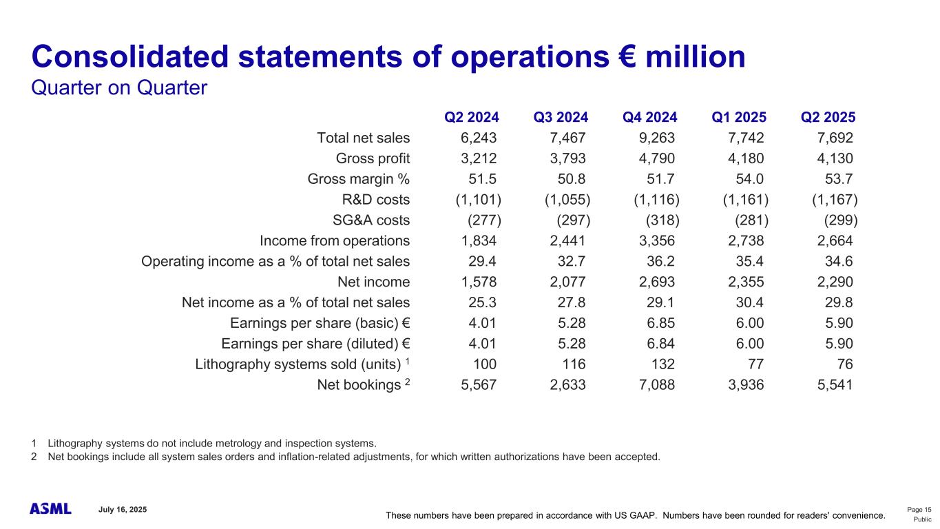 第15页7月16日,2025年公共合并经营报表百万欧元环比Q2 2024 Q3 2024 Q4 2024 Q1 2025Q2 2025总净销售额6,2437,4679,2637,7427,692毛利润3,2123,7934,7904,1804,130毛利率% 51.55 0.85 1.75 4.05 3.7研发成本(1,101)(1,055)(1,116)(1,161)(1,167)SG & A成本(277)(297)(318)(281)(299)营业收入1,8342,4413,3562,7382,664营业收入占总净销售额的百分比29.43 2.7 36.235.43 4.6净收入1,5782,0772,6932,3552,290净收入占总净销售额的百分比25.3 27.82 9.13 0.429.8每股收益(基本)欧元4.01 5.286.856.00 5.90每股收益(稀释后)欧元4.01 5.286.846.00 5.90已售光刻系统(台)11001161327776净预订量25,5672,6337,0883,9365,5411光刻系统不包括计量和检测系统。2净预订量包括所有系统销售订单和通胀相关调整,已接受书面授权。这些数字是根据美国通用会计准则编制的。为方便读者阅读,数字已四舍五入。