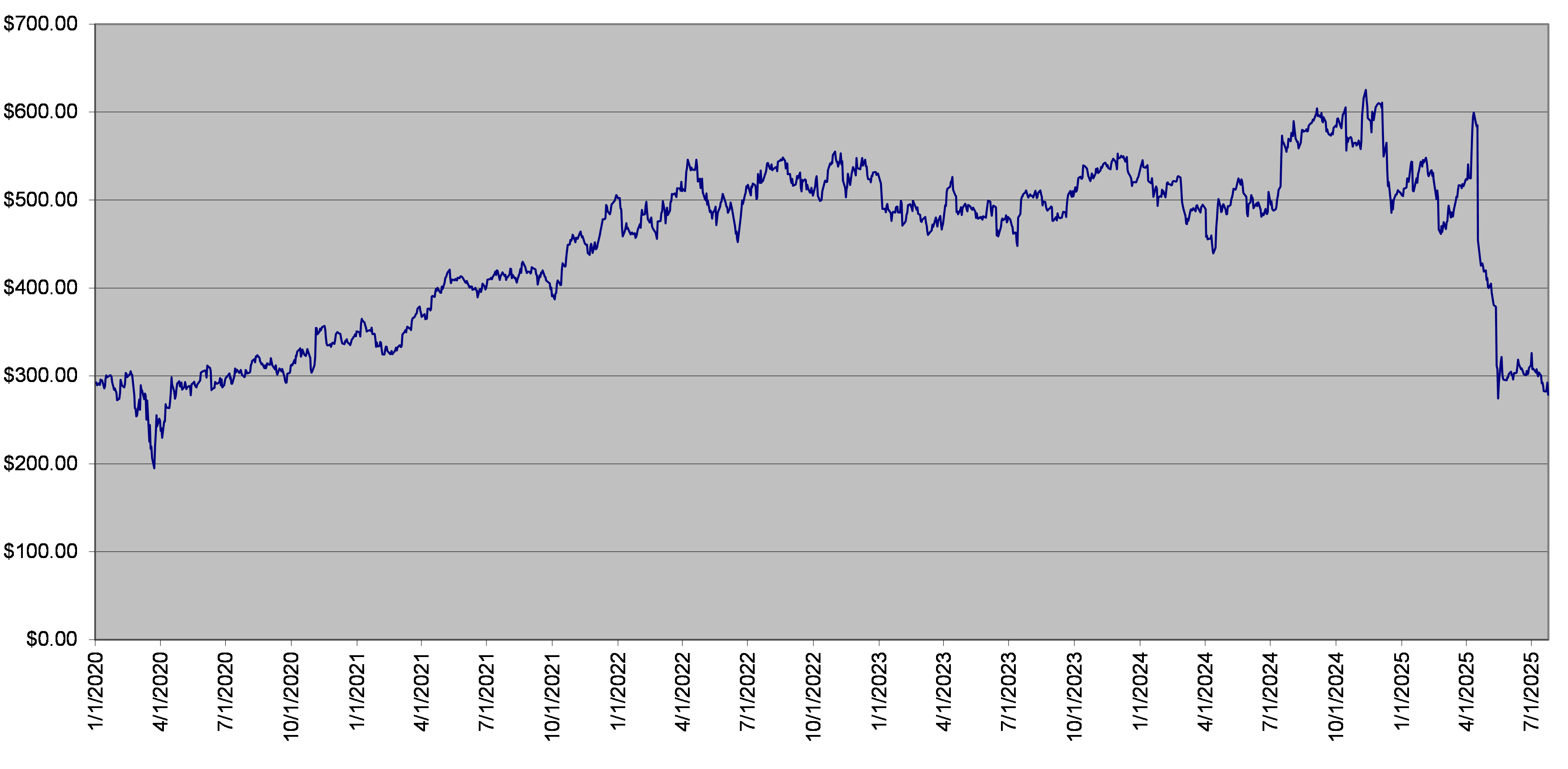 标的2025年7月24日收盘价为278.58美元。下图列出了下文所述期间基础证券的每日收盘水平。我们从彭博金融市场获得了这份文件中提供的历史信息,未经独立验证。底层证券有时经历过高波动性时期。不应将标的的历史收盘水平作为其未来表现的指示,任何时候都不能对标的的收盘水平给出任何保证。