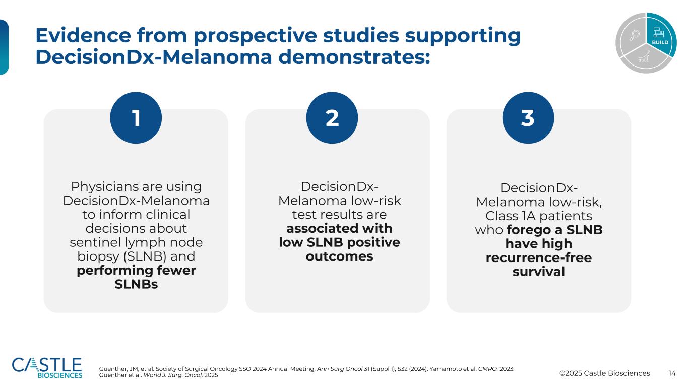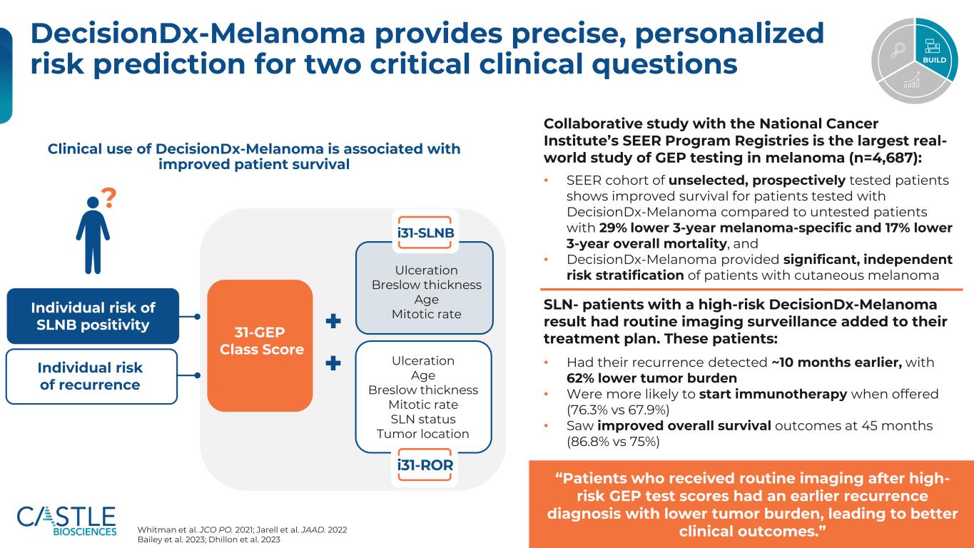 ©2025 Castle Biosciences 13例SLNB阳性个体风险个体复发风险?31-GEP类评分溃疡Breslow厚度年龄有丝分裂率溃疡年龄Breslow厚度有丝分裂率SLN状态肿瘤位置与美国国家癌症研究所的SEER计划登记处进行的合作研究是黑色素瘤GEP检测的最大真实世界研究(n = 4,687):• SEER队列中未选择的、前瞻性测试的患者显示,与未测试的患者相比,DecisionDX-黑色素瘤测试患者的生存率有所提高,3年黑色素瘤特异性降低29%,3年总死亡率降低17%,并且• DecisionDX-黑色素瘤提供了显着,皮肤黑色素瘤SLN患者的独立风险分层-具有高风险DecisionDx-黑色素瘤结果的患者将常规影像监测添加到他们的治疗计划中。这些患者:•在约10个月前发现复发,肿瘤负荷降低62% •更有可能在提供时开始免疫治疗(76.3% vs 67.9%)•在45个月时看到总生存期结果有所改善(86.8% vs 75%)Whitman等JCO PO。2021;Jarell等JAAD。2022 Bailey et al. 2023;Dhillon et al. 2023 Build“在高风险GEP测试评分后接受常规成像的患者,其复发诊断更早,肿瘤负担更低,从而导致更好的临床结果。”DecisionDX-黑色素瘤的临床使用与改善患者生存决策相关DX-黑色素瘤为两个关键临床问题提供了精确、个性化的风险预测
