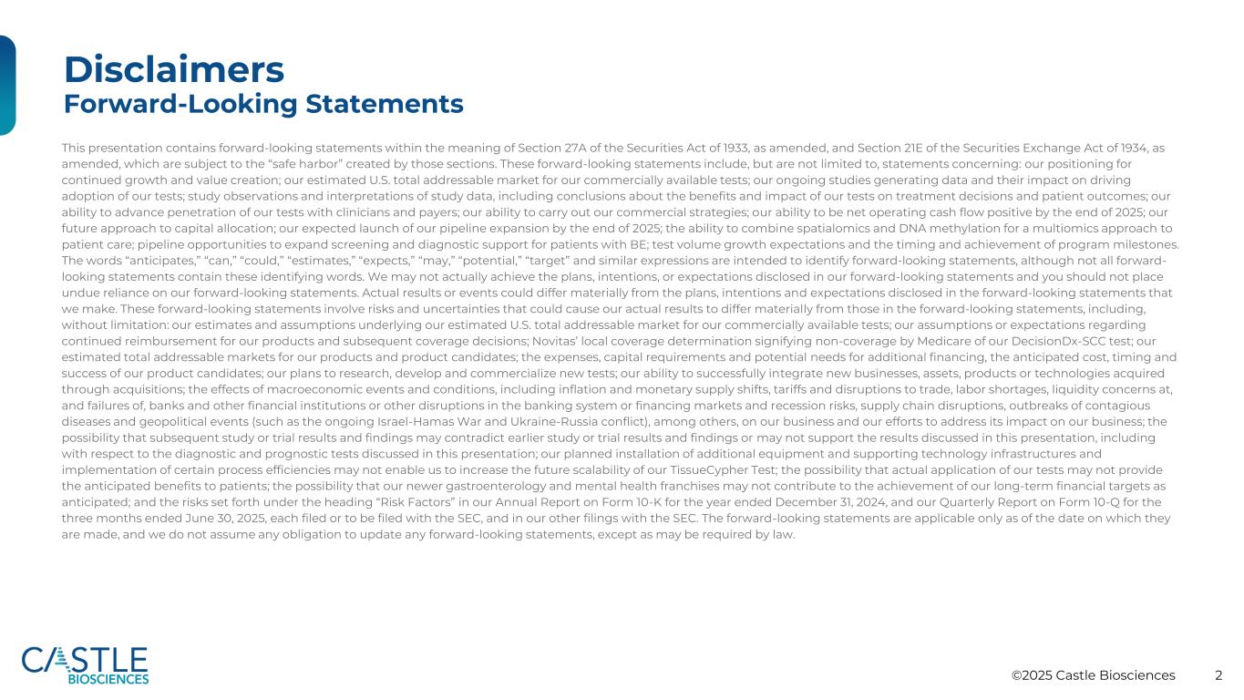 ©2025 Castle Biosciences 2免责声明前瞻性陈述本演示文稿包含经修订的1933年证券法第27A条和经修订的1934年证券交易法第21E条含义内的前瞻性陈述,这些陈述受这些条款创建的“安全港”的约束。这些前瞻性陈述包括但不限于以下方面的陈述:我们对持续增长和价值创造的定位;我们估计的商用测试的美国总潜在市场;我们正在进行的研究产生数据及其对推动采用我们的测试的影响;研究观察和研究数据的解释,包括关于我们的测试对治疗决策和患者结果的益处和影响的结论;我们向临床医生和付款人推进测试渗透的能力;我们执行商业战略的能力;我们在2025年底前实现净经营现金流为正的能力;我们未来的资本配置方法;我们预计在2025年底启动我们的管道扩展;将空间组学和DNA甲基化结合起来用于患者护理的多组学方法的能力;扩大筛查的管道机会以及对BE患者的诊断支持;测试量增长预期以及计划里程碑的时机和实现。“预期”、“可以”、“可能”、“估计”、“预期”、“可能”、“潜在”、“目标”和类似表述旨在识别前瞻性陈述,尽管并非所有前瞻性陈述都包含这些识别词。我们实际上可能无法实现我们前瞻性陈述中披露的计划、意图或预期,您不应过分依赖我们的前瞻性陈述。实际结果或事件可能与我们做出的前瞻性陈述中披露的计划、意图和预期存在重大差异。这些前瞻性陈述涉及风险和不确定性,可能导致我们的实际结果与前瞻性陈述中的结果存在重大差异,包括但不限于:我们对我们的商业可用测试的估计美国总潜在市场所依据的估计和假设;我们对我们的产品的持续报销和随后的承保决定的假设或期望;Novitas的当地承保范围确定表明Medicare未承保我们的DecisionDX-SCC测试;我们对我们的产品和候选产品的估计总潜在市场;额外融资的费用、资本要求和潜在需求,预期成本,我们的候选产品的时机和成功;我们研究、开发和商业化新测试的计划;我们成功整合通过收购获得的新业务、资产、产品或技术的能力;宏观经济事件和条件的影响,包括通货膨胀和货币供应转移、关税和贸易中断、劳动力短缺、对银行和其他金融机构的流动性担忧和倒闭或银行系统或融资市场的其他中断以及衰退风险、供应链中断、传染病爆发和地缘政治事件(例如正在进行的以色列-哈马斯战争和乌克兰-俄罗斯冲突)等,关于我们的业务以及我们努力解决其对我们业务的影响;后续研究或试验结果和发现可能与早期研究或试验结果和发现相矛盾或可能不支持本演示文稿中讨论的结果的可能性,包括关于本演示文稿中讨论的诊断和预后测试;我们计划安装额外设备和支持技术基础设施以及实施某些流程效率可能无法使我们增加TISUeCypher测试的未来可扩展性;实际应用我们的测试可能无法为患者提供预期益处的可能性;可能性我们较新的胃肠病学和心理健康专营权可能无法像预期的那样有助于实现我们的长期财务目标;以及我们截至2024年12月31日止年度的10-K表格年度报告和截至2025年6月30日止三个月的10-Q表格季度报告中“风险因素”标题下所述的风险,分别向SEC提交或将提交,以及我们向SEC提交的其他文件中。前瞻性陈述仅在作出之日适用,我们不承担更新任何前瞻性陈述的任何义务,除非法律可能要求。