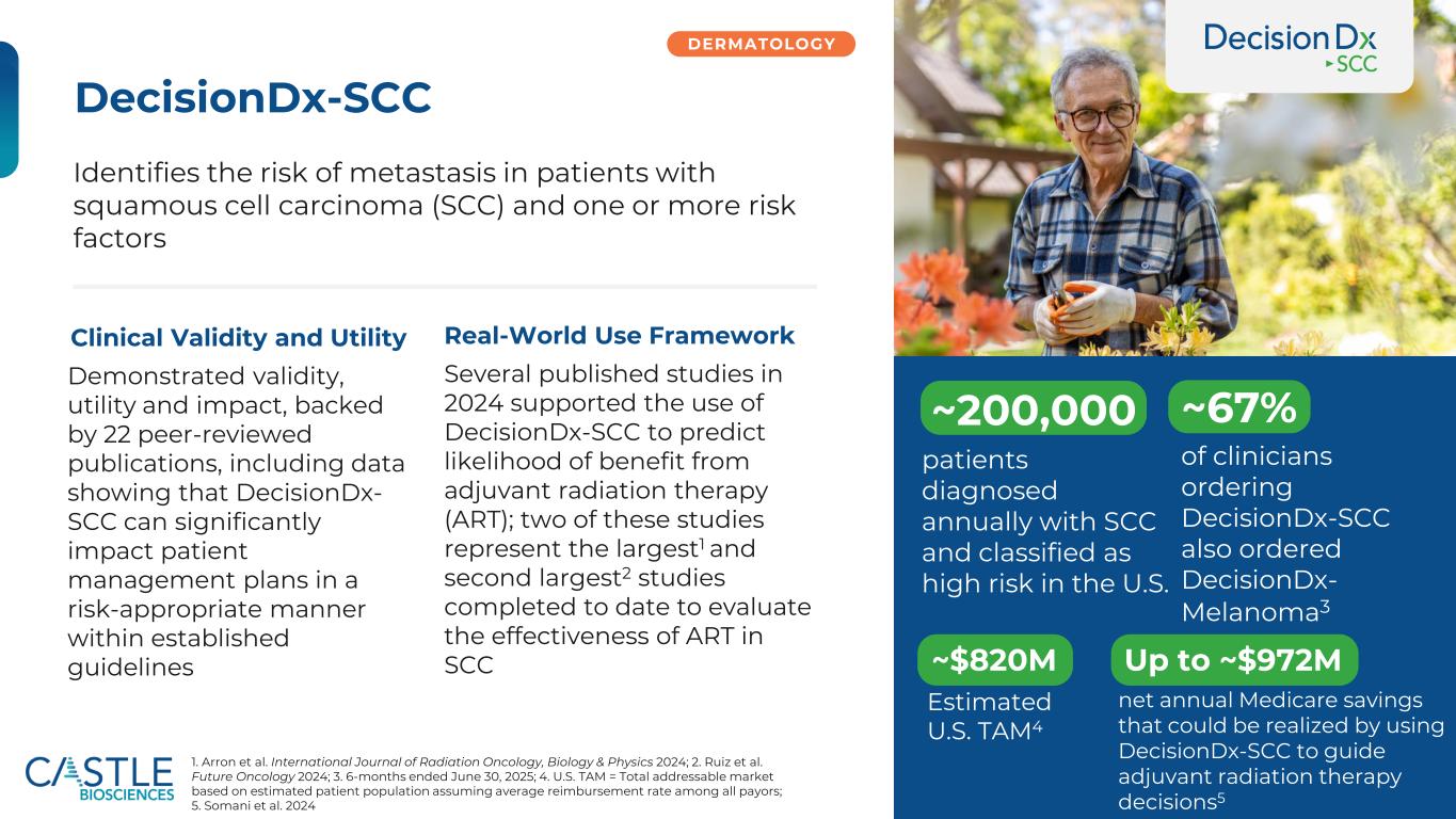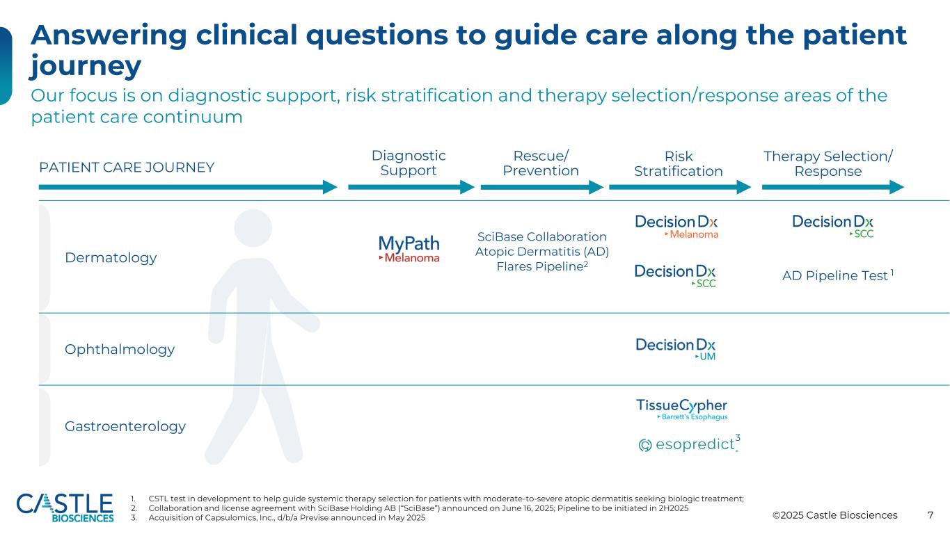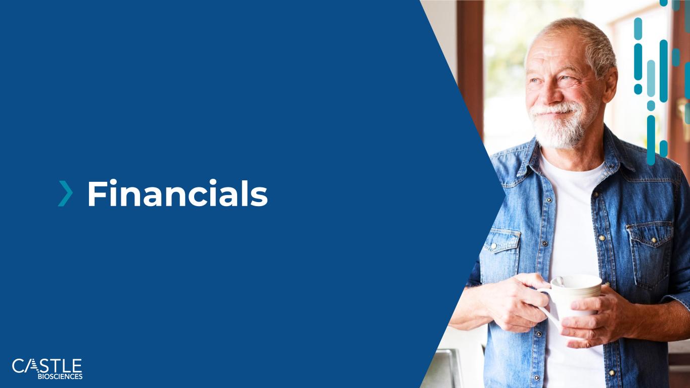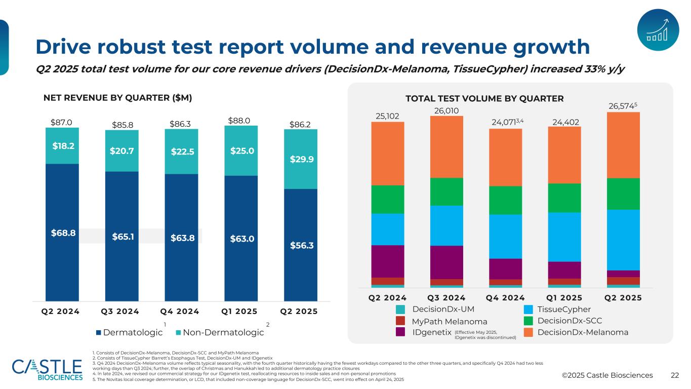 ©2025年Castle Biosciences 22 Drive稳健测试报告数量和收入增长$ 68.8 $ 65.1 $ 63.8 $ 63.0 $ 56.3 $ 18.2 $ 20.7 $ 22.5 $ 25.0 $ 29.9 Q2 2024 Q3 2024 Q4 2025 Q2 2025 Dermatologic Non-Dermatologic $ 87.0 $ 85.8 $ 86.3 $ 88.0 $ 86.2净收入(百万美元)Q2 2024 Q3 2024 Q4 2024 Q1 2025 Q2 2025 DecisionDX-UM MyPath黑色素瘤IDgenetix TissueCypher DecisionDX-SCC DecisionDX-黑色素瘤第一季度总测试量。由DecisionDX-黑色素瘤、DecisionDX-SCC和MyPath黑色素瘤2组成。由TissueCypher Barrett食管试验、DecisionDX-UM和IDGenetix 3组成。2024年第四季度DecisionDx-黑色素瘤的数量反映了典型的季节性,与其他三个季度相比,第四季度的工作日历来最少,具体而言,2024年第四季度的工作日比2024年第三季度少两个;此外,圣诞节和光明节的重叠导致更多的皮肤科诊所关闭4。2024年底,我们修改了IDGenetix测试的商业策略,将资源重新分配给内部销售和非个人促销5。Novitas本地覆盖率确定,或LCD,包括DecisionDX-SCC的非覆盖语言,于2025年4月24日生效1225,10226,01024,0713,424,40226,57452025年第二季度我们的核心收入驱动因素(DecisionDX-黑色素瘤、TissueCypher)的总测试量同比增长33%(2025年5月生效,IDGenetix已停产)