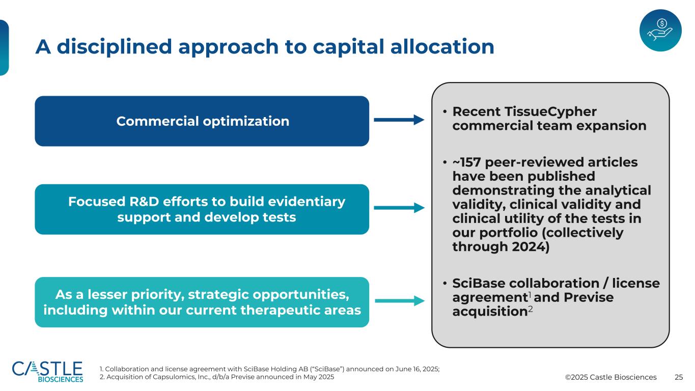©2025 Castle Biosciences 24强劲的经营现金流和调整后EBITDA $ 24.0 $ 23.3 $ 24.4 $(6.0)$ 20.8 Q2 2024 Q3 2024 Q4 2024 Q1 2025Q2 2025按季度划分的经营现金流(百万美元)1。截至2025年6月30日;包括现金、现金等价物&有价投资证券2。2025年第一季度用于经营活动的现金净额包括支付年度奖金以及某些医疗福利贡献3。调整后EBITDA是一种非GAAP衡量标准。请参阅本演示文稿末尾的非GAAP对账,了解调整后EBITDA与其最具可比性的GAAP衡量标准4的对账。调整后EBITDA不包括净收入(亏损)、利息收入、利息费用、所得税费用(收益)、折旧和摊销费用、股票补偿费用和交易证券公允价值变动21.5美元21.6美元21.3美元13.0美元10.4美元2024年第二季度2024年第三季度2024年第四季度2025年第一季度2025年第二季度调整后EBITDA(百万美元)3,4现金状况约为2761美元,支持增长举措