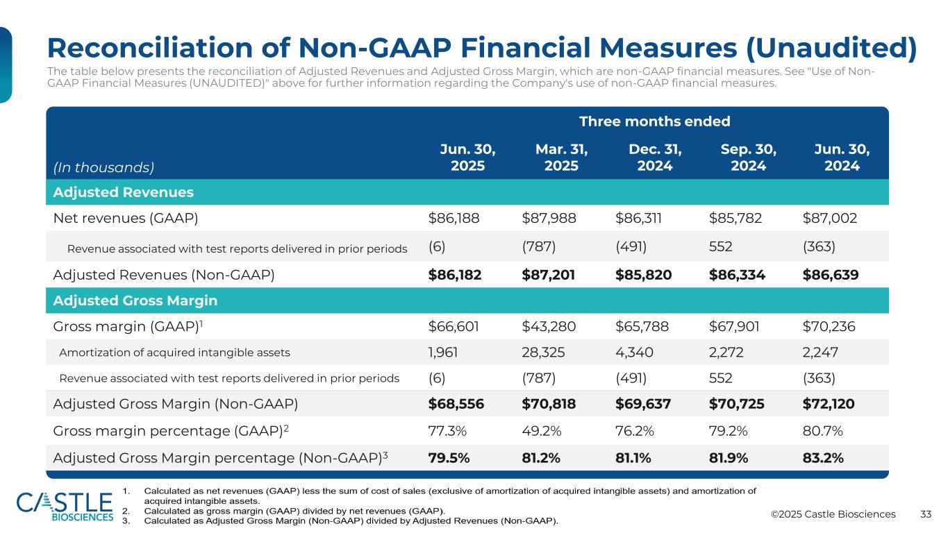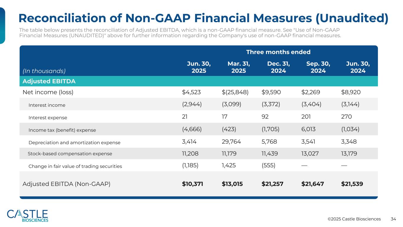 ©2025 Castle Biosciences 33非公认会计准则财务指标的对账(未经审计)下表列出了调整后收入和调整后毛利率的对账情况,这是非公认会计准则财务指标。有关公司使用非GAAP财务指标的更多信息,请参见上文“使用非GAAP财务指标(未经审计)”。(单位:千)截至2025年6月30日止三个月2025年3月31日2024年12月31日2024年9月30日,2024年调整后收入净收入(GAAP)86,188美元87,988美元86,311美元85,782美元87,002美元与前期交付的测试报告相关的收入(6)(787)(491)552(363)调整后收入(Non-GAAP)86,182美元87,201美元85,820美元86,334美元86,639美元调整后毛利率(GAAP)1美元66,601美元43,280美元65,788美元67,901美元70,236美元所购无形资产摊销1,96128,3254,3402,2722,247与前期交付的测试报告相关的收入(6)(787)(491)552(363)调整后毛利率(Non-GAAP)68,556美元70,818美元69,637美元70,725美元72,120美元