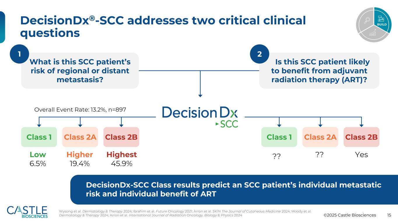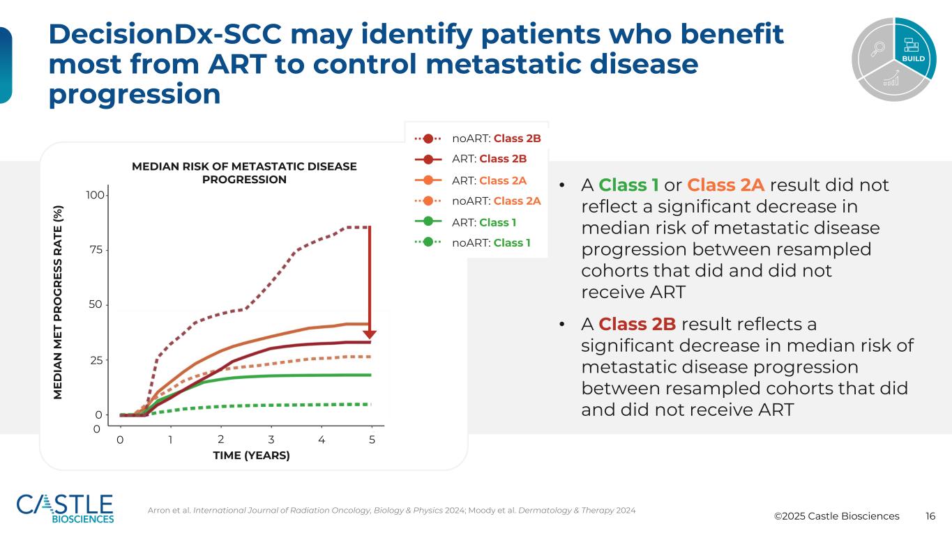 ©2025 Castle Biosciences 15 DecisionDX®-SCC解决两个关键临床问题这名SCC患者发生区域或远处转移的风险是多少?这名SCC患者是否有可能受益于辅助放射治疗(ART)?1类2A类2B低6.5%高19.4%最高45.9%????是1类2A类2B总事件率:13.2%,n = 89712 DecisionDX-SCC类结果预测SCC患者的个体转移风险和ART Wysong等人的个体获益皮肤病学与疗法2024;Ibrahim等人的未来肿瘤学2021;Arron等人的皮肤医学杂志2024;Moody等人的皮肤病学与疗法2024;Arron等人的国际放射肿瘤学杂志,生物学与物理学2024 Build