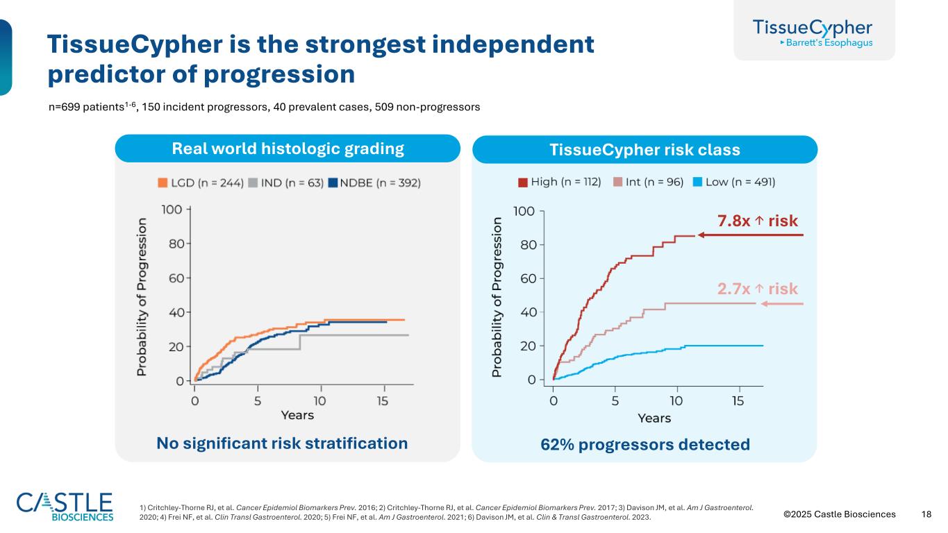 ©2025 Castle Biosciences 17 TissueCypher提供个体化的5年进展为HGD或EAC低风险的风险高风险•高风险评分能够增加监测或早期干预以预防癌症1 •低风险评分可最大限度地减少过度治疗,并支持将监测间隔延长至指示于NDBE、IND和LGD1 Rubenstein JH等人的胃肠病学的指导建议。2024.