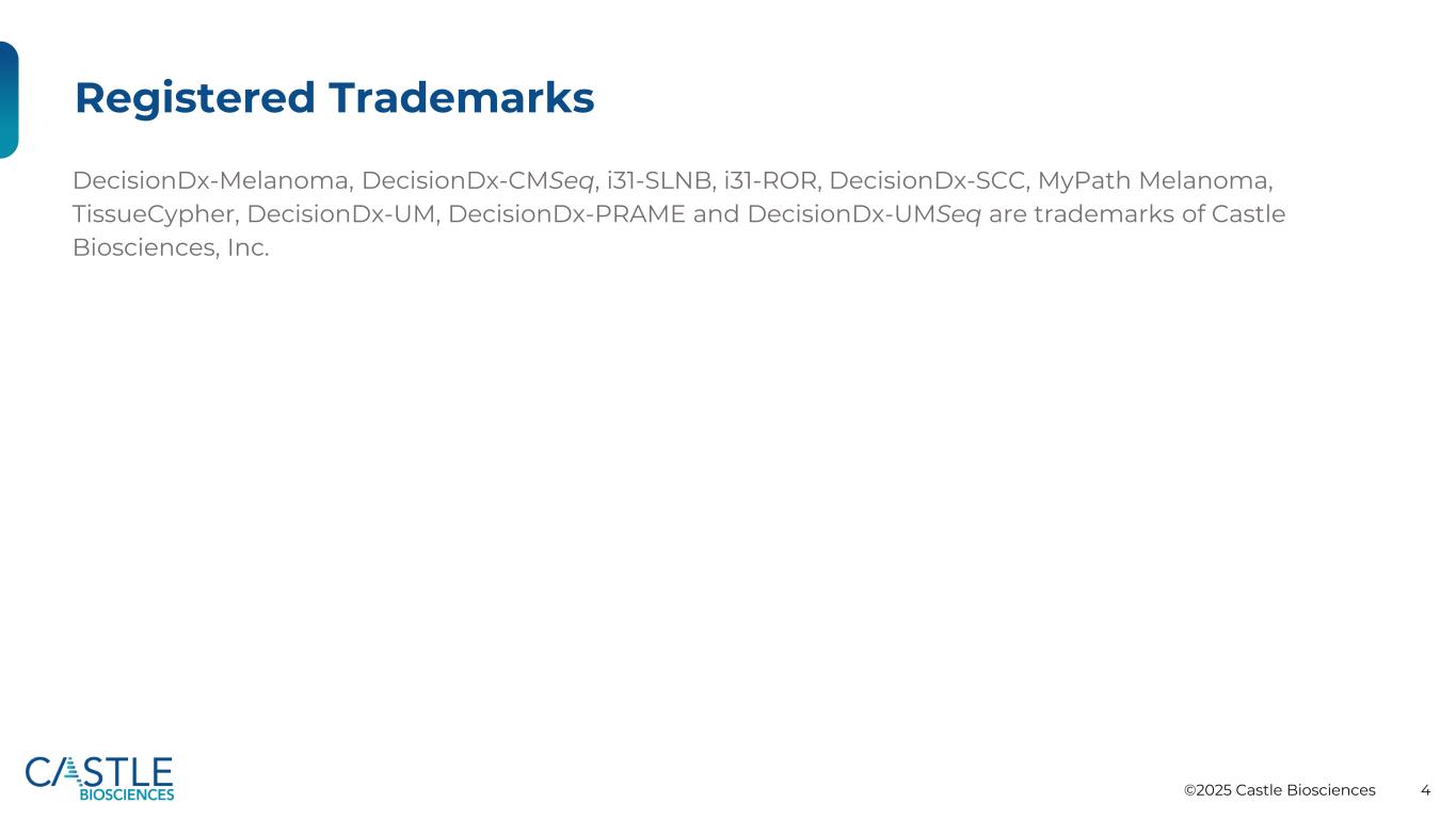 ©2025 Castle Biosciences 3免责声明财务信息;在本演示文稿中,我们使用调整后收入、调整后毛利率和调整后EBITDA的指标来衡量非GAAP财务指标,它们是非GAAP财务指标,不是根据美国公认会计原则(GAAP)计算的。调整后的收入和调整后的毛利率反映了对GAAP净收入的调整,以排除本期记录的与前期交付的测试报告相关的估计可变对价变化相关的净正和/或净负收入调整。调整后的毛利率进一步排除了与收购相关的无形资产摊销。调整后的EBITDA不包括净收入(亏损):利息收入、利息费用、所得税费用(收益)、折旧和摊销费用、基于股票的补偿费用和交易证券的公允价值变动。我们在内部使用调整后的收入、调整后的毛利率和调整后的EBITDA,因为我们认为这些指标分别为评估我们按照公认会计原则报告的收入和经营业绩提供了有用的补充信息。我们认为,当调整后的收入与我们的测试报告数量信息一起使用时,通过排除与前期交付的测试报告相关的收入调整的影响,有助于投资者分析我们当前期间的收入表现和平均售价表现,因为这些调整可能并不代表我们业务当前或未来的表现。我们认为,提供调整后的收入也可能有助于促进与我们历史时期的比较。调整后的毛利率是使用调整后的收入计算的,因此不包括与前期交付的测试报告相关的收入调整的影响,我们认为如上所述,这对投资者是有用的。我们在计算调整后毛利率时进一步排除了与收购相关的无形资产摊销。我们认为,排除与收购相关的无形资产摊销可能有助于与历史期间进行毛利率比较,并且可能有助于评估当期业绩,而不考虑无形资产的历史会计估值,后者仅适用于我们收购的测试,而不是内部开发的测试。我们认为,调整后的EBITDA可能会加强对我们经营业绩的评估,因为它不包括先前就资本投资、融资、投资和我们认为不代表我们持续业绩的某些费用做出的决定的影响。然而,这些非GAAP财务指标可能与其他公司使用的非GAAP财务指标不同,即使使用相同或类似标题的术语来识别此类指标,从而限制了它们用于比较目的的有用性。这些非GAAP财务指标不应被孤立地考虑或用作根据GAAP报告的净收入、毛利率或净收入(亏损)的替代品;应与我们根据GAAP提供的财务信息一起考虑;没有GAAP规定的标准化含义;未经审计;也不是根据任何全面的会计规则或原则编制的。此外,未来可能不时会有其他项目,我们可能会出于这些非公认会计原则财务措施的目的而将其排除,并且我们可能会在未来停止出于这些非公认会计原则财务措施的目的而将我们历来排除的项目排除在外。同样,我们可能会决定修改调整的性质,以得出这些非GAAP财务指标。由于非GAAP财务指标的非标准化定义,我们在本新闻稿中使用的非GAAP财务指标以及随附的调节表对投资者的有用性有限制,因此计算方式可能与其他公司使用的类似名称的指标不同,因此可能无法直接进行比较。因此,投资者不应过分依赖非公认会计准则财务指标。这些非GAAP财务指标与最直接可比的GAAP财务指标的对账显示在本演示文稿末尾的表格中。行业和市场数据本演示文稿包括从第三方来源获得的某些信息和统计数据。公司未对任何此类第三方信息的准确性或完整性进行独立验证。