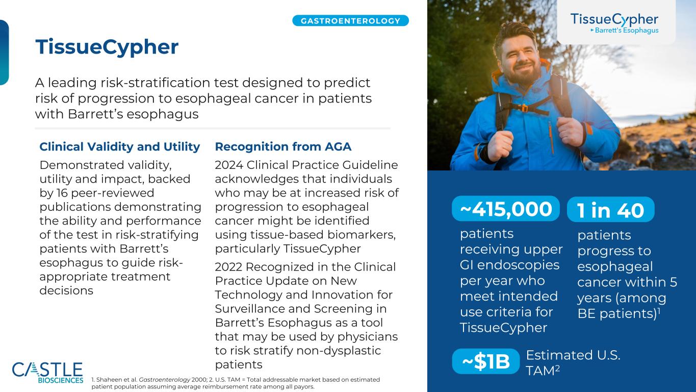 ©2025 Castle Biosciences 30 TissueCypher胃肠病学是一种领先的风险分层测试,旨在预测巴雷特食管患者进展为食管癌的风险,临床有效性和实用性证明了有效性、实用性和影响,并得到16份同行评审出版物的支持,这些出版物证明了该测试在对巴雷特食管进行风险分层的患者中指导风险适当治疗决策的能力和性能,AGA 2024临床实践指南的认可承认,可能使用基于组织的生物标志物来识别可能有更高进展为食管癌风险的个体,特别是TissueCypher 2022在Barrett食管监测和筛查新技术和创新的临床实践更新中获得认可,作为一种工具,医生可能会使用它对非发育不良患者进行风险分层~每年接受上消化道内窥镜检查的415,000名患者符合TissueCypher 1的预期使用标准,其中40名患者在5年内(在BE患者中)进展为食管癌1~$ 1b1。Shaheen et al. Gastroenterology 2000;2。美国TAM =基于假设所有付款人的平均报销率的估计患者群体的总可寻址市场。估计美国TAM2