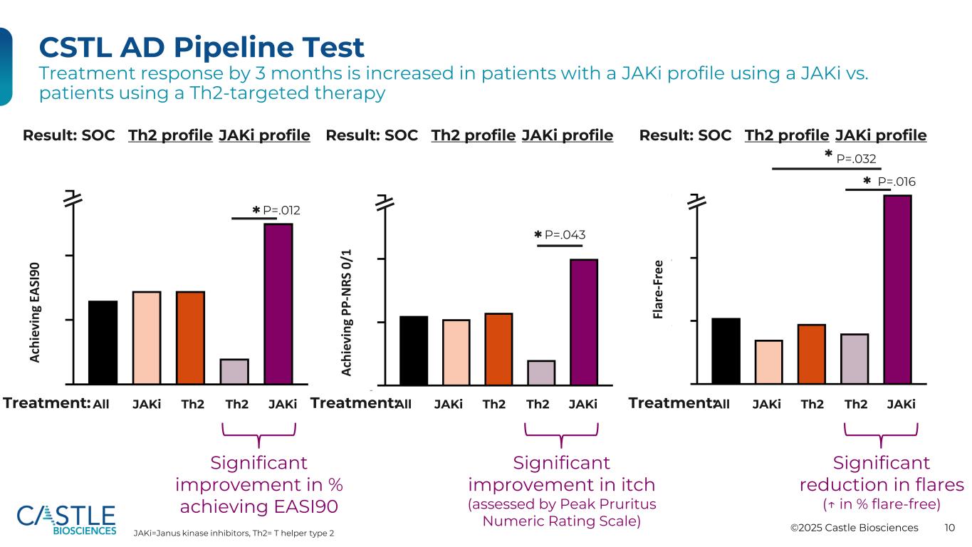 ©2025 Castle Biosciences 10个CSTL AD管道测试治疗反应在使用JAKi的JAKi谱患者中增加3个月,而在使用TH2靶向疗法JAKi Th2 JAKITh2AllTreatment:Result:SOC Th2谱JAKi谱P =.032**JAKi Th2 JAKITh2AllTreatment:P =.016 Result:SOC Th2 Profile JAKi Profile JAKi Th2 JAKITh2AllTreatment:P =.012 Result:SOC Th2 Profile JAKi Profile*显著改善%实现EASI90耀斑显著减少(↓ in %无耀斑)瘙痒显著改善(以峰值瘙痒数字评定量表评估)p =.043*A ch ie vi n g EA SI 90 ach即vi n g p p-n r s 0/1 fl ar e-f re e jaki = Janus激酶抑制剂,th2 = T辅助2型