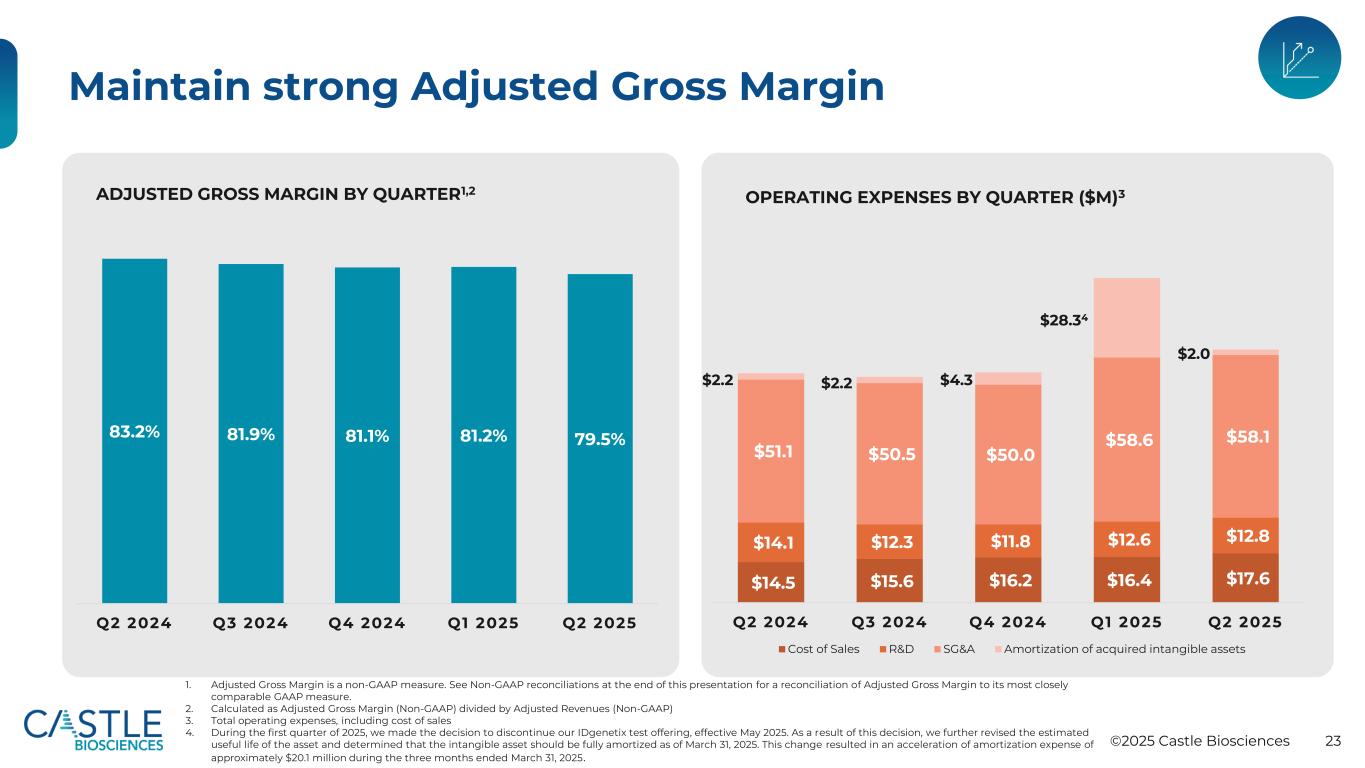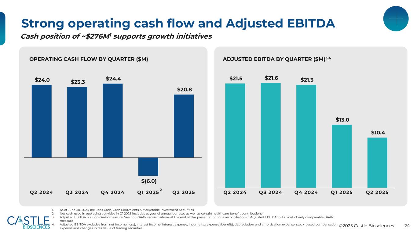 ©2025 Castle Biosciences 23保持强劲的调整后毛利率83.2% 81.9% 81.1% 81.2% 79.5% Q2 2024 Q3 2024 Q4 2024 Q1 2025Q2 2025调整后毛利率按季度1,2 $ 14.5 $ 15.6 $ 16.2 $ 16.4 $ 17.6 $ 14.1 $ 12.3 $ 11.8 $ 12.6 $ 12.8 $ 51.1 $ 50.5 $ 50.0 $ 58.6 $ 58.1 Q2 2024 Q3 2024 Q4 2024 Q4 2024 Q1 2025Q2 2025销售成本研发SG & A按季度摊销所购无形资产运营费用(百万美元)31。调整后的毛利率是一种非公认会计原则的衡量标准。请参阅本演示文稿末尾的非GAAP对账,了解调整后毛利率与其最具可比性的GAAP衡量标准的对账情况。2.计算方法为调整后毛利率(non-GAAP)除以调整后收入(non-GAAP)3。营业费用总额,包括销售成本4。在2025年第一季度,我们决定停止我们的IDGenetix测试产品,自2025年5月起生效。由于这一决定,我们进一步修订了该资产的预计使用寿命,确定该无形资产应于2025年3月31日全部摊销。这一变化导致在截至2025年3月31日的三个月内加速摊销费用约2010万美元。$4.3$2.2$2.2 $28.34 $2.0