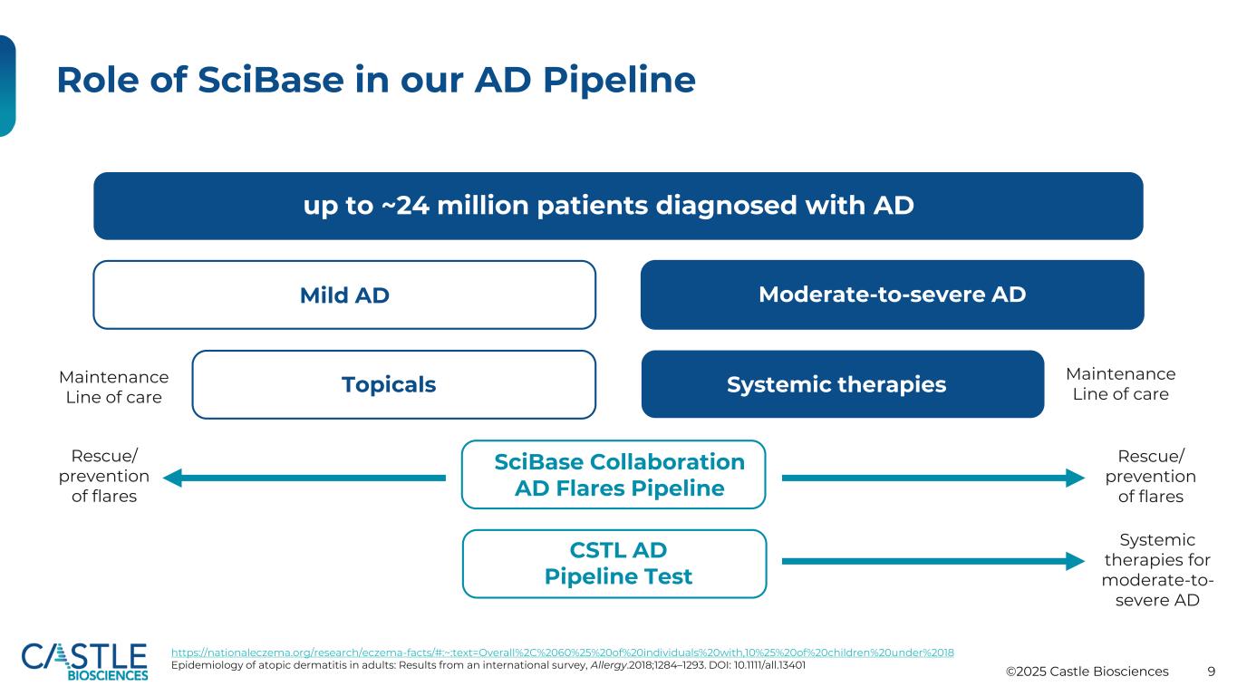 ©2025 Castle Biosciences 7回答临床问题指导患者旅程中的护理我们的重点是诊断支持、风险分层和治疗选择/响应领域的患者护理连续体皮肤科眼科胃肠病学诊断支持风险分层治疗选择/响应患者护理旅程1。正在开发的CSTL测试,有助于指导寻求生物治疗的中重度特应性皮炎患者的全身治疗选择;2。与SciBase Holding AB(“SciBase”)的合作和许可协议于2025年6月16日宣布;管道将于2025年2月启动3。收购Capsulomics,Inc.,d/b/a Previse于2025年5月宣布救援/预防AD管道测试13 SciBase协作特应性皮炎(AD)Flares Pipeline2