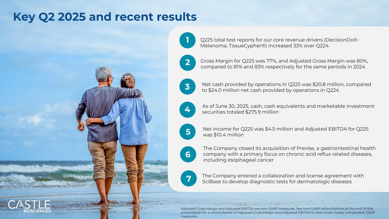 ©2025 Castle Biosciences 6个关键的2025年第二季度和近期业绩1公司完成了对Previse的收购,Previse是一家主要专注于慢性反酸相关疾病,包括食道癌的胃肠道健康公司,Q225的毛利率为77%,调整后的毛利率为80%,而2024年同期分别为81%和83% 5 Q225的运营提供的净现金为2080万美元,而Q224的运营提供的净现金为2400万美元6 Q225为我们的核心收入驱动因素提供的总测试报告(DecisionDX®-黑色素瘤,组织密码®)较Q224增长33%截至2025年6月30日,现金、现金等价物和可销售投资证券总额为2.759亿美元7 Q225净收入为450万美元,Q225调整后EBITDA为1040万美元公司与SciBase签订合作和许可协议,以开发皮肤病诊断测试23调整后毛利率和调整后EBITDA是非公认会计准则衡量标准。请参阅本演示文稿末尾的非GAAP对账,了解调整后毛利率和调整后EBITDA与其最具可比性的GAAP衡量标准的对账情况。4 1
