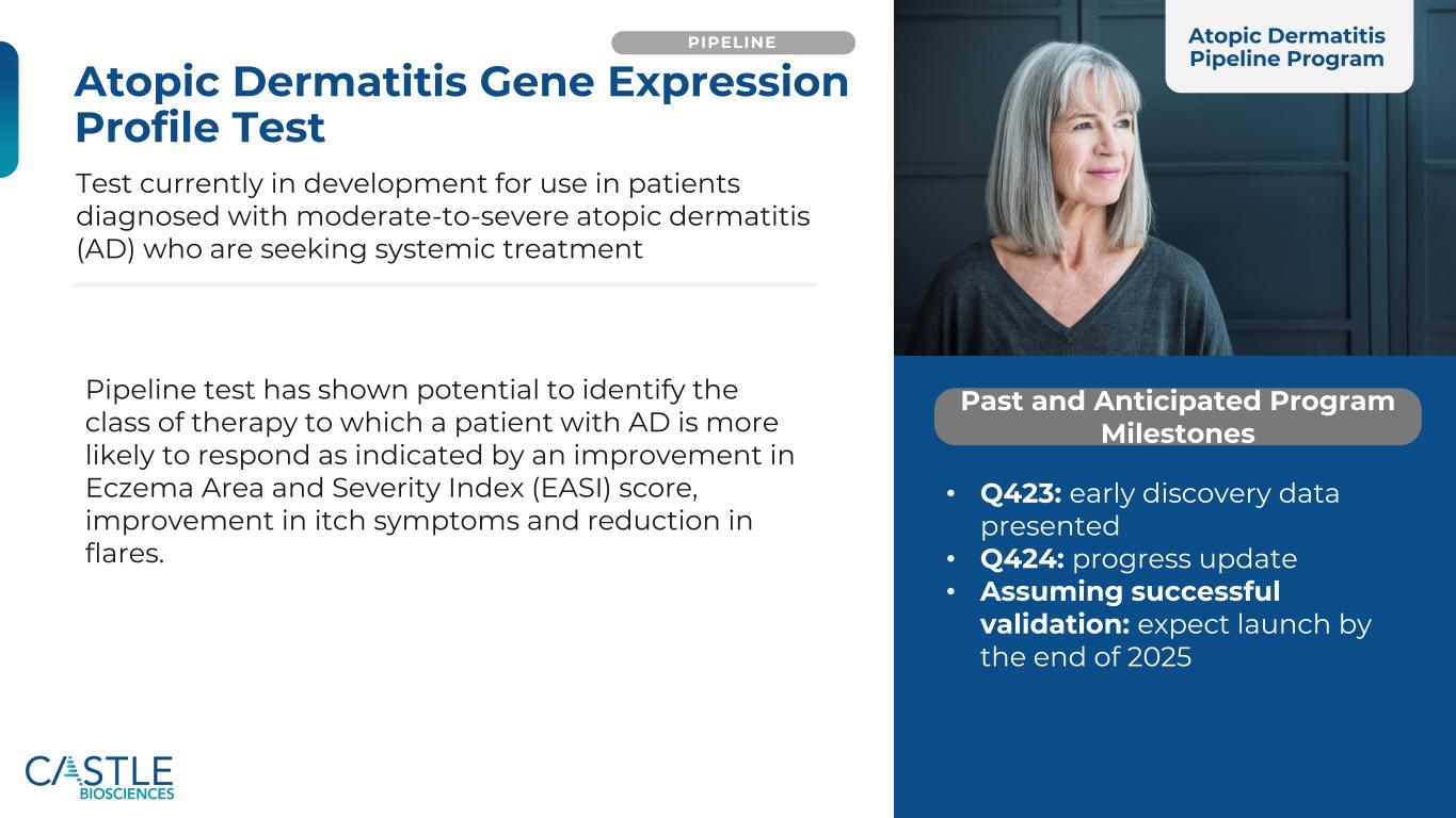 ©2025 Castle Biosciences 32种特应性皮炎基因表达谱检测PIPELINE Test目前正在开发用于寻求全身治疗的中重度特应性皮炎(AD)诊断患者的PIPELINE Test已显示出确定AD患者更有可能对哪类治疗作出反应的潜力,表现为湿疹面积和严重程度指数(EASI)评分改善、瘙痒症状改善和耀斑减少。• Q423:早期发现数据呈现• Q424:进展更新•假设验证成功:预计2025年底推出过去和预期计划里程碑特应性皮炎管道计划