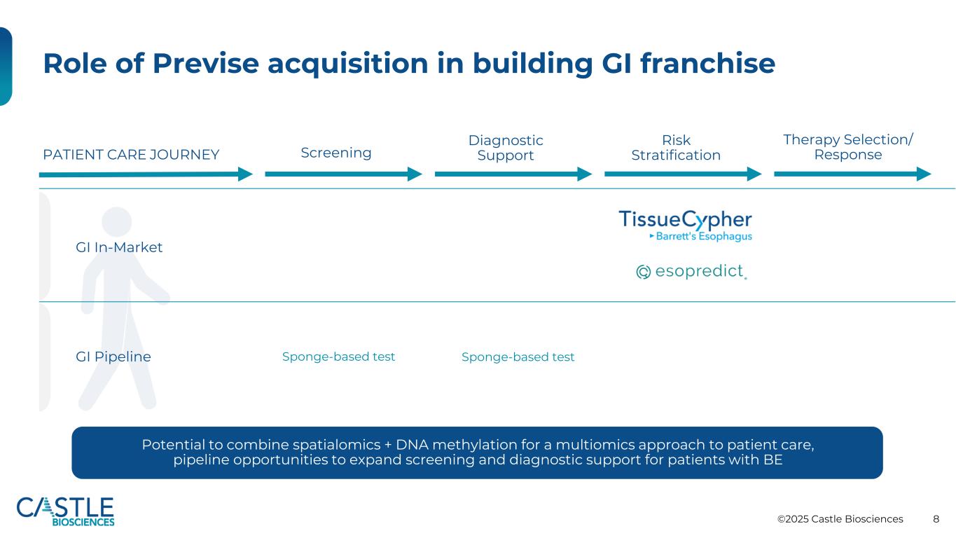 ©2025 Castle Biosciences 8 Previse Acquisition在构建GI特许GI管道诊断支持风险分层治疗选择/响应患者护理之旅中的作用筛查GI市场上基于海绵的测试基于海绵的测试结合空间组学+ DNA甲基化的多组学方法对患者护理的潜力,管道机会扩大对BE患者的筛查和诊断支持