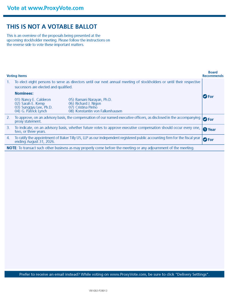 在www.proxyvote.com上投票这不是可投票的投票这是即将举行的股东大会上提出的提案的概述。这些重要事项请按反面指示进行表决。宁愿收到邮件代替?在www.proxyvote.com上投票时,一定要点击“投递设置”。V81683-P38913 1。选举八人担任董事,直至我们的下一次年度股东大会或直至他们各自的继任者当选并合格为止。提名名单:05)Ramani Narayan,博士01)Nancy E. Calderon 06)Richard J. Nigon 02)Sarah E. Kemp 07)Cristina Pinho 03)Sunggyu Lee,博士08)Konstantin von Falkenhausen 04)G. Patrick Lynch为2。在咨询的基础上批准我们指定的执行官的薪酬,如随附的代理声明中所披露。1年3。在咨询的基础上表明,未来是否应该每隔一年、两年或三年进行一次批准高管薪酬的投票。为4。批准任命Baker Tilly US,LLP为我们截至2026年8月31日止财政年度的独立注册公共会计师事务所。注:办理会议或会议任何休会前可能适当提出的其他事项。投票项目董事会建议
