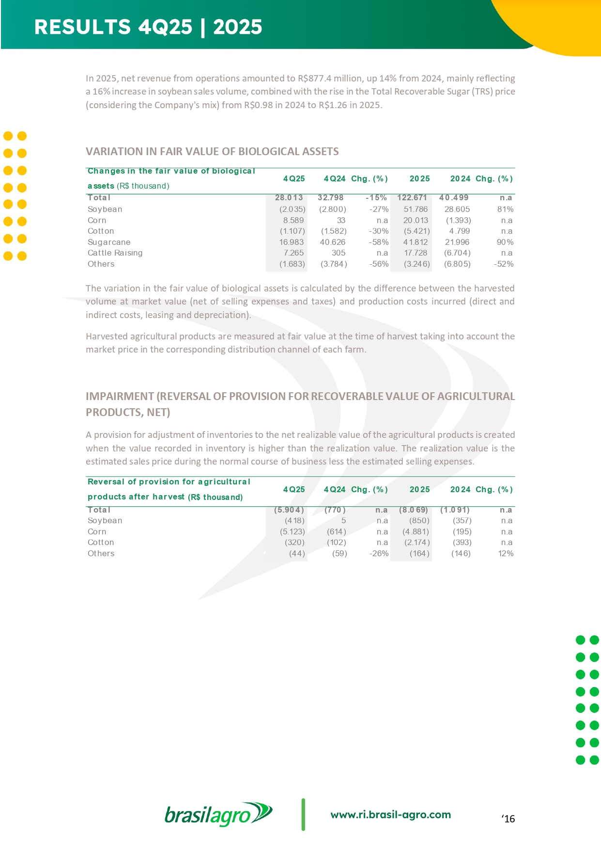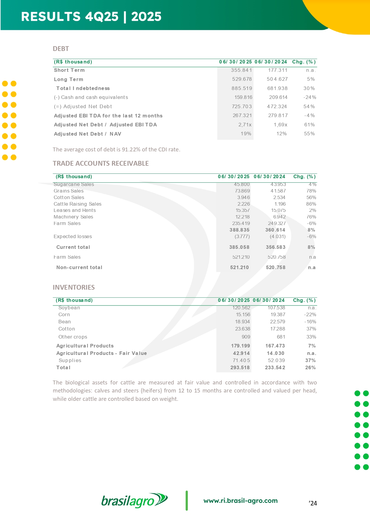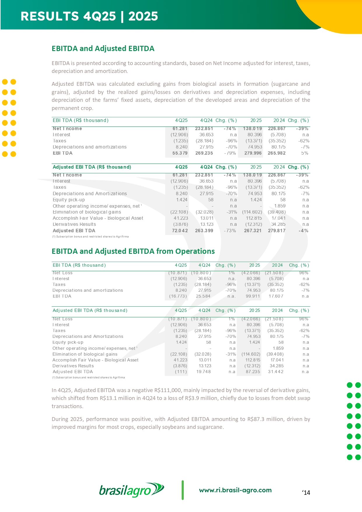 EBITDA和调整后EBITDA EBITDA根据会计准则列报,基于经利息、税收、折旧和摊销调整后的净收入。调整后EBITDA的计算不包括形成中的生物资产(甘蔗和谷物)的收益,经衍生工具的已实现损益和折旧费用调整,包括农场固定资产折旧、发达地区折旧和永久作物折旧。EBITDA和25年第4季度来自运营的调整后EBITDA为负11.1万雷亚尔,主要受到衍生品收益逆转的影响,后者从13雷亚尔转移。24年4季度亏损100万至亏损3雷亚尔。900万,主要是债务互换交易损失所致。2025年期间,业绩表现积极,调整后EBITDA达87雷亚尔。300万,受大多数作物,尤其是大豆和甘蔗的利润率改善推动。CHG。(%)20242025CHG。(%)4 Q24 4 Q25 EBI TDA(R $ t hou sa nd)-39% 226.86 7138.0 19-74% 232.85 161.281 net i ncome n.a(5.708)80.396 n.a 36.653(12.906)i nterest-62%(35.352)(13.371)-96%(28.184)(1.235)税收-7% 80.17 574.953-70% 27.9 158.240折旧和摊销5% 265.98 2279.996-79% 269.23555.379 EBI TDA CHG。(%)20242025CHG。(%)4 Q24 4 Q25调整后EBI TDA(千雷亚尔)-39% 226.86 7138.0 19-74% 232.85 161.281 Net I Ncome N.a(5.708)80.396 n.a 36.653(12.906)I NTERest-62%(35.352)(13.371)-96%(28.184)(1.235)税收-7% 80.17 574.953-70% 27.9 158.240折旧和摊销n.a 58 1.424 n.a 58 1.424 Equity Pick-up n.a 1.859-n.a--其他营业收入/支出,net 1 n.a(39.408)(114.602)-31%(32.028)(22.108)消除生物收益n.a 17.041112.815 n.a 13.01 141.22 3实现公允价值-生物资产n.a 34.285(12.312)n.a 13.123(3.876)衍生品结果-4% 279.81 7267.321-73% 263.39972.042调整后EBI TDA'14(1)子股tion bonus and restricted sha res to Agrifirma CHG。(%)20242025CHG。(%)4 Q24 4 Q25 EBI TDA(R $ t hou sa nd)96%(21.508)(42.066)1%(10.800)(10.871)净亏损n.a(5.708)80.396 n.a. 36.653(12.906)i nterest-62%(35.352)(13.371)-96%(28.184)(1.235)税收-7% 80.17 574.953-70% 27.9 158.240折旧和摊销n.a. 17.60 799.911 n.a. 25.584(16.773)EBI TDA chg。(%)20242025CHG。(%)4 Q24 4 Q25调整ed EBI TDA(R $ t hou sa nd)96%(21.508)(42.066)1%(10.800)(10.871)净亏损n.a(5.708)80.396 n.a 36.653(12.906)i nterest-62%(35.352)(13.371)-96%(28.184)(1.235)税项-7% 80.17 574.953-70% 27.9 158.240折旧和摊销n.a 58 1.424 n.a 58 1.424股权提货-up n.a 1.859-n.a-其他营业收入/支出,net 1 n.a(39.408)(114.602)-31%(32.028)(22.108)消除生物收益n.a 17.041112.815 n.a 13.01 141.22 3实现公允价值-生物资产n.a 34.285(12.312)n.a 13.123(3.876)衍生品结果n.a 31.44287.235 n.a 19.748(111)调整ed EBI TDA(1)子股票t离子红利和限制性sha res to Agrifirma