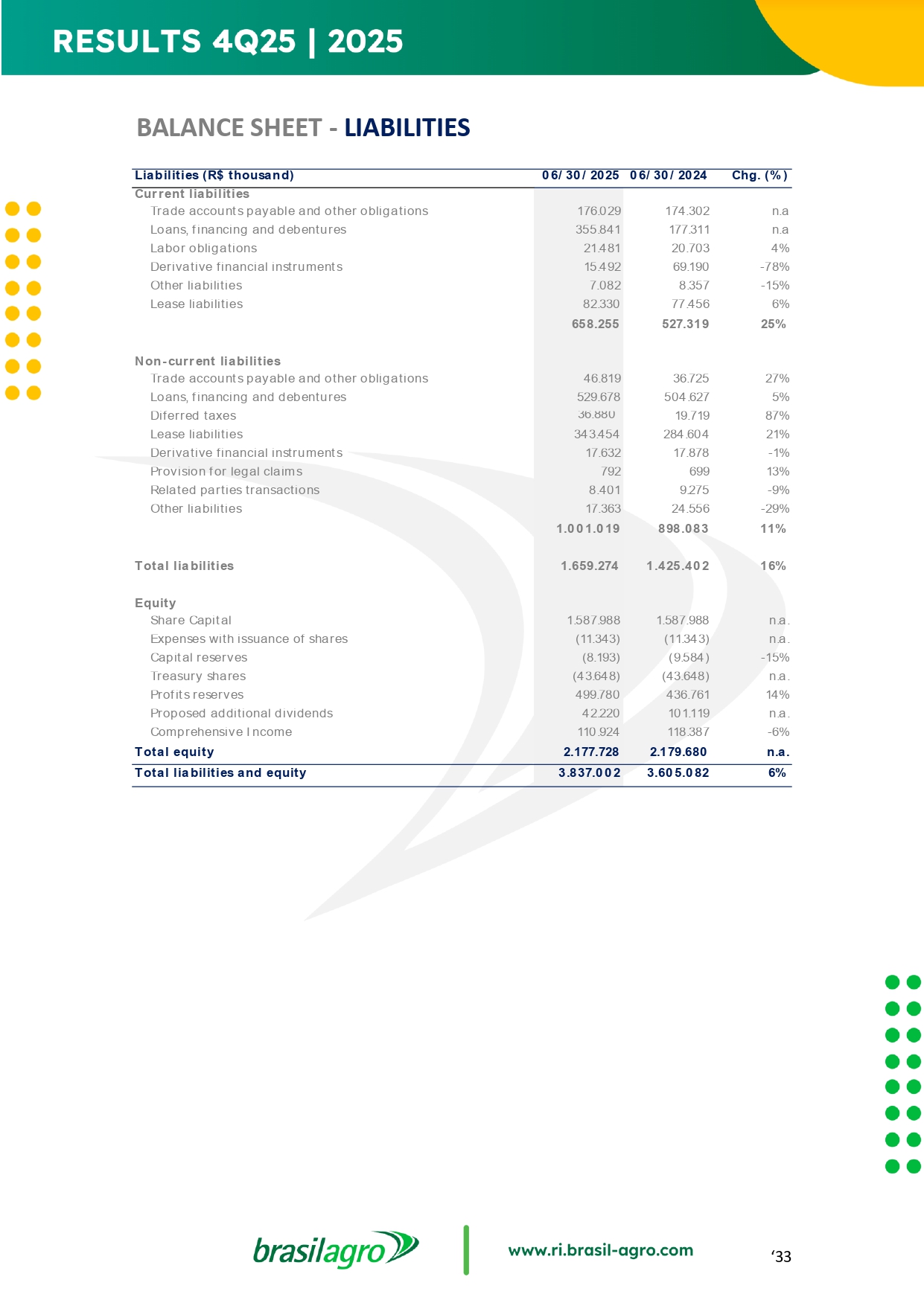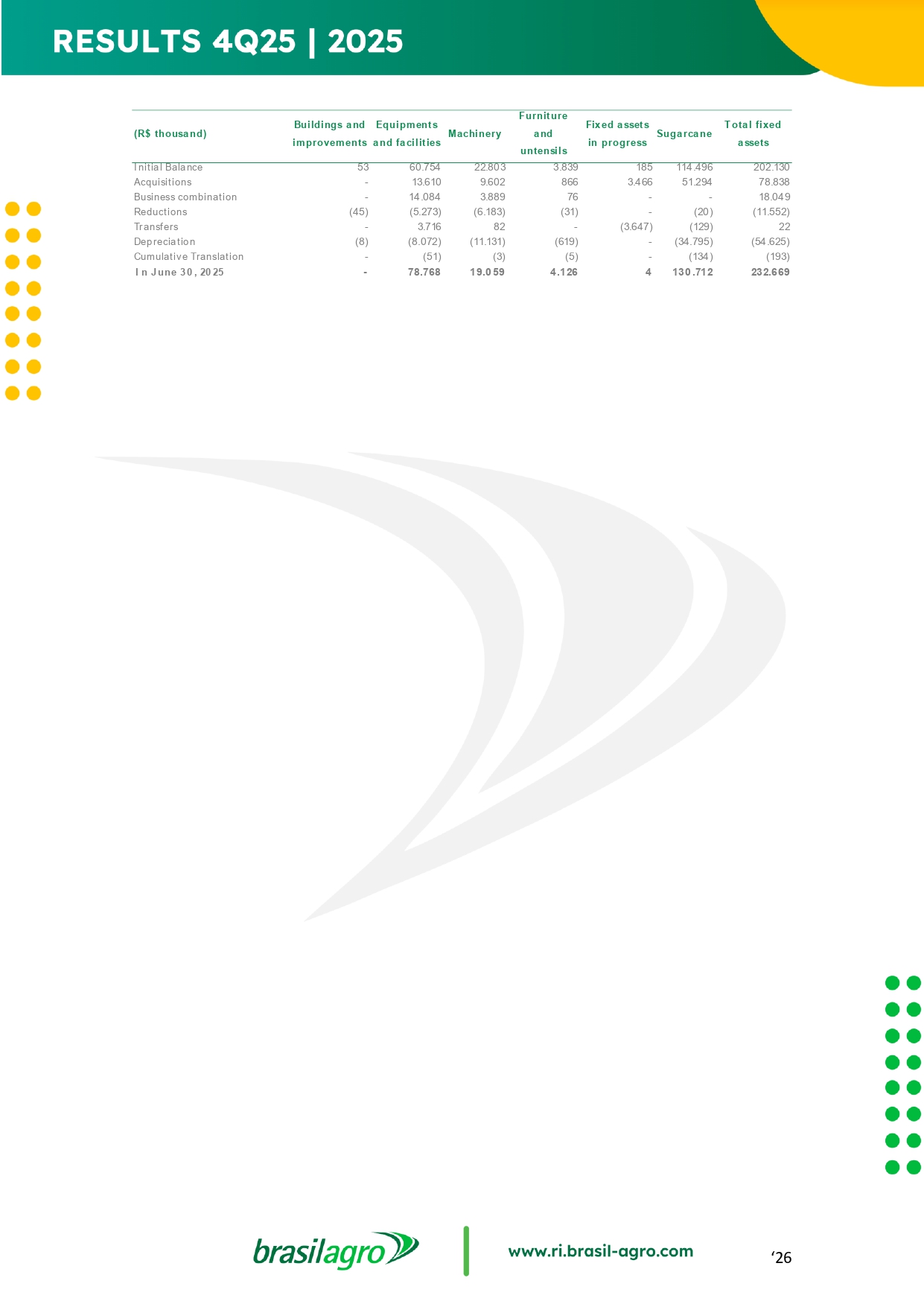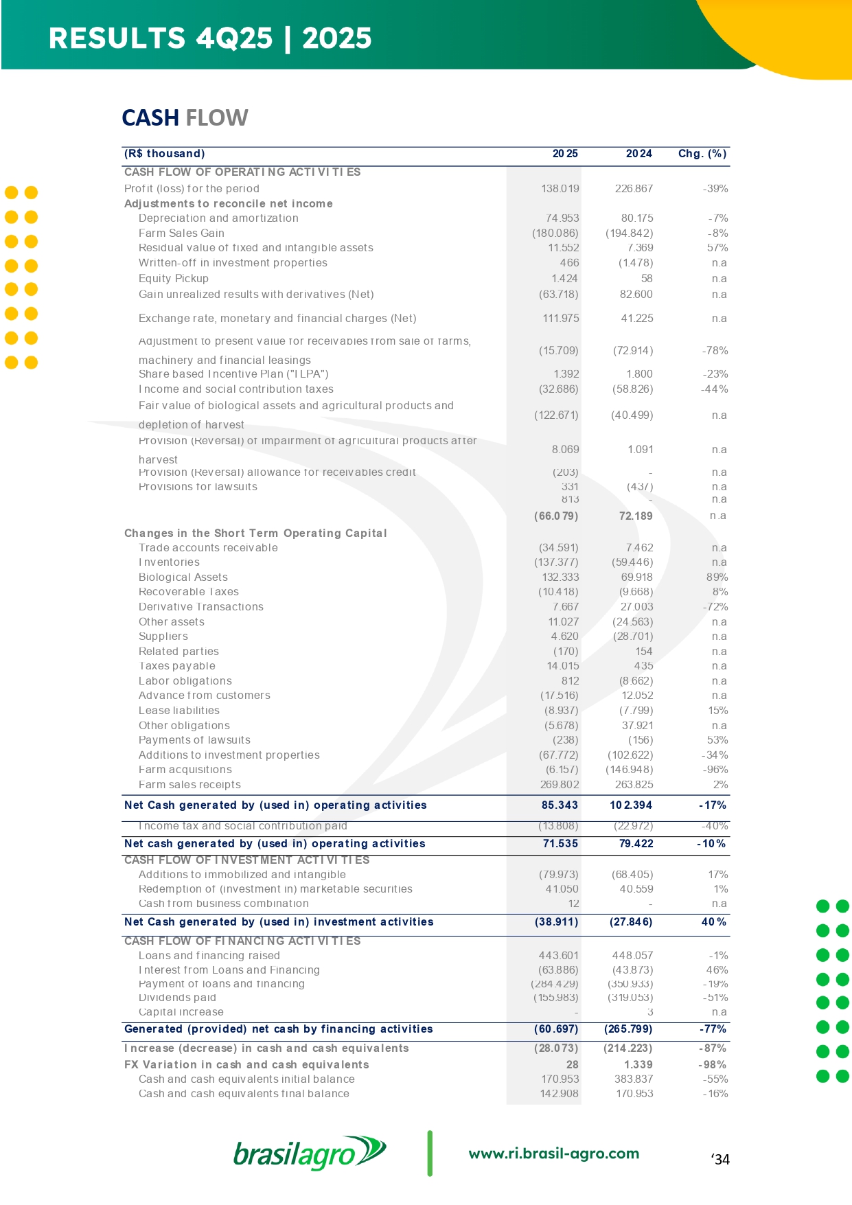 EBITDA和调整后EBITDA EBITDA根据会计准则列报,基于经利息、税收、折旧和摊销调整后的净收入。调整后EBITDA的计算不包括形成中的生物资产(甘蔗和谷物)的收益,经衍生工具的已实现损益和折旧费用调整,包括农场固定资产折旧、发达地区折旧和永久作物折旧。EBITDA和25年第4季度来自运营的调整后EBITDA为负11.1万雷亚尔,主要受到衍生品收益逆转的影响,后者从13雷亚尔转移。24年4季度亏损100万至亏损3雷亚尔。900万,主要是债务互换交易损失所致。2025年期间,业绩表现积极,调整后EBITDA达87雷亚尔。300万,受大多数作物,尤其是大豆和甘蔗的利润率改善推动。CHG。(%)20242025CHG。(%)4 Q24 4 Q25 EBI TDA(R $ t hou sa nd)-39% 226.86 7138.0 19-74% 232.85 161.281 net i ncome n.a(5.708)80.396 n.a 36.653(12.906)i nterest-62%(35.352)(13.371)-96%(28.184)(1.235)税收-7% 80.17 574.953-70% 27.9 158.240折旧和摊销5% 265.98 2279.996-79% 269.23555.379 EBI TDA CHG。(%)20242025CHG。(%)4 Q24 4 Q25调整后EBI TDA(千雷亚尔)-39% 226.86 7138.0 19-74% 232.85 161.281 Net I Ncome N.a(5.708)80.396 n.a 36.653(12.906)I NTERest-62%(35.352)(13.371)-96%(28.184)(1.235)税收-7% 80.17 574.953-70% 27.9 158.240折旧和摊销n.a 58 1.424 n.a 58 1.424 Equity Pick-up n.a 1.859-n.a--其他营业收入/支出,net 1 n.a(39.408)(114.602)-31%(32.028)(22.108)消除生物收益n.a 17.041112.815 n.a 13.01 141.22 3实现公允价值-生物资产n.a 34.285(12.312)n.a 13.123(3.876)衍生品结果-4% 279.81 7267.321-73% 263.39972.042调整后EBI TDA'14(1)子股tion bonus and restricted sha res to Agrifirma CHG。(%)20242025CHG。(%)4 Q24 4 Q25 EBI TDA(R $ t hou sa nd)96%(21.508)(42.066)1%(10.800)(10.871)净亏损n.a(5.708)80.396 n.a. 36.653(12.906)i nterest-62%(35.352)(13.371)-96%(28.184)(1.235)税收-7% 80.17 574.953-70% 27.9 158.240折旧和摊销n.a. 17.60 799.911 n.a. 25.584(16.773)EBI TDA chg。(%)20242025CHG。(%)4 Q24 4 Q25调整ed EBI TDA(R $ t hou sa nd)96%(21.508)(42.066)1%(10.800)(10.871)净亏损n.a(5.708)80.396 n.a 36.653(12.906)i nterest-62%(35.352)(13.371)-96%(28.184)(1.235)税项-7% 80.17 574.953-70% 27.9 158.240折旧和摊销n.a 58 1.424 n.a 58 1.424股权提货-up n.a 1.859-n.a-其他营业收入/支出,net 1 n.a(39.408)(114.602)-31%(32.028)(22.108)消除生物收益n.a 17.041112.815 n.a 13.01 141.22 3实现公允价值-生物资产n.a 34.285(12.312)n.a 13.123(3.876)衍生品结果n.a 31.44287.235 n.a 19.748(111)调整ed EBI TDA(1)子股票t离子红利和限制性sha res to Agrifirma