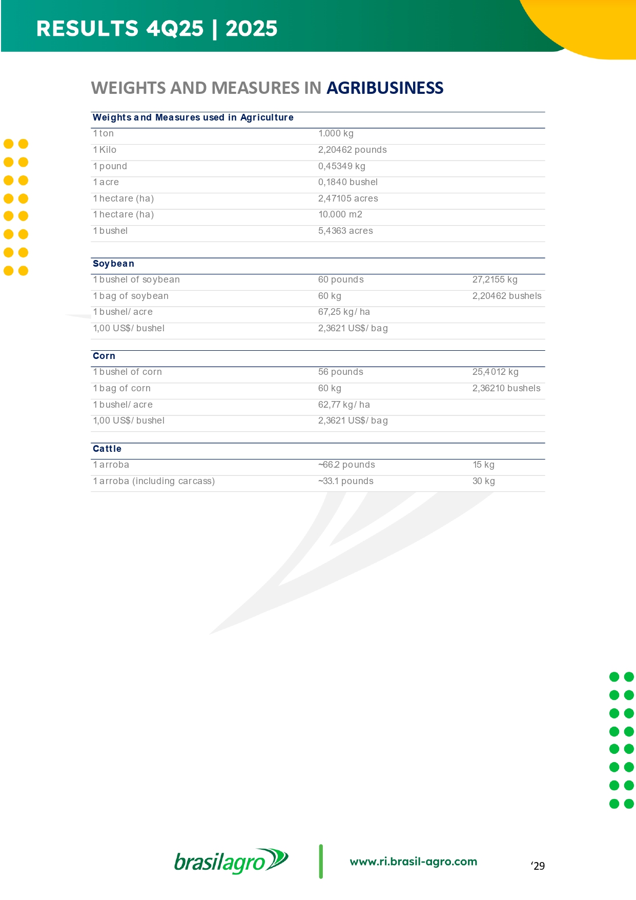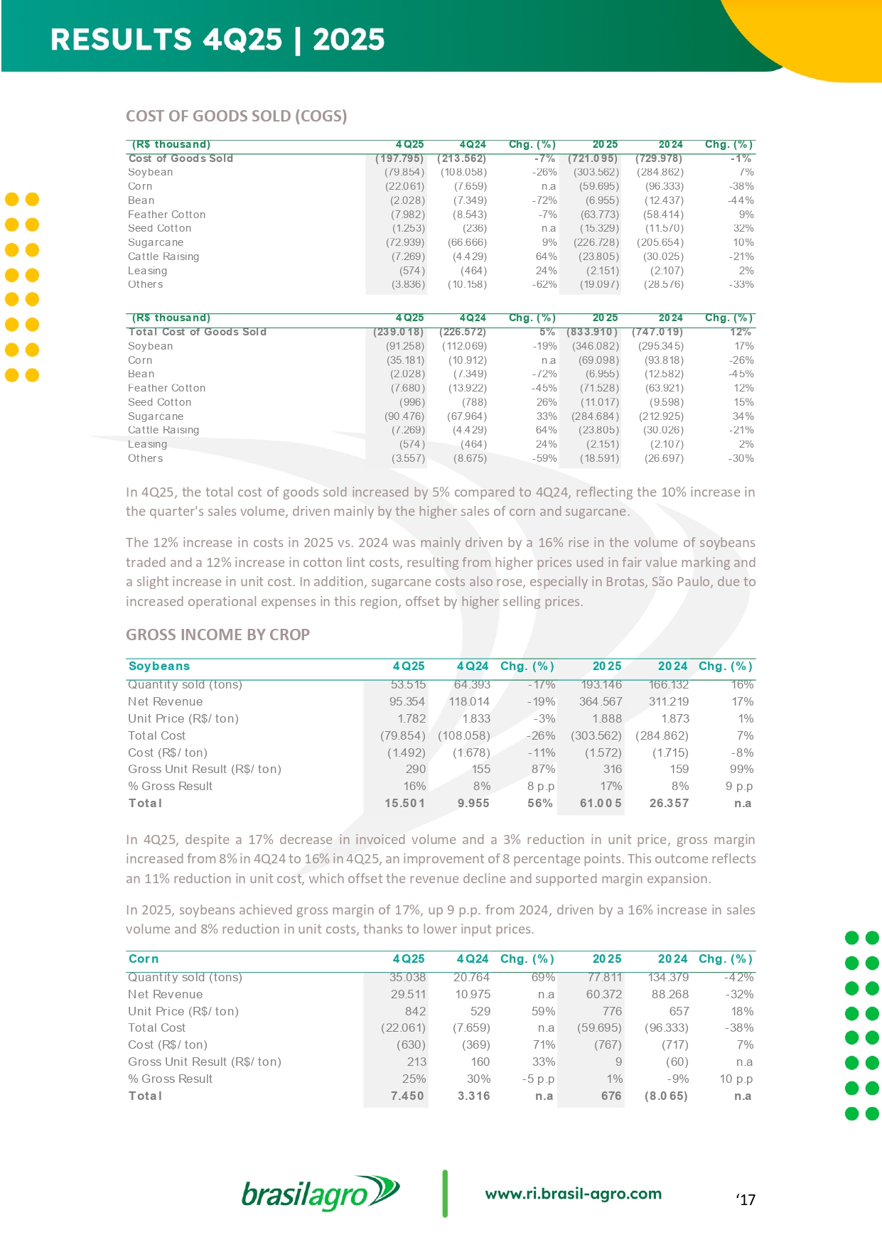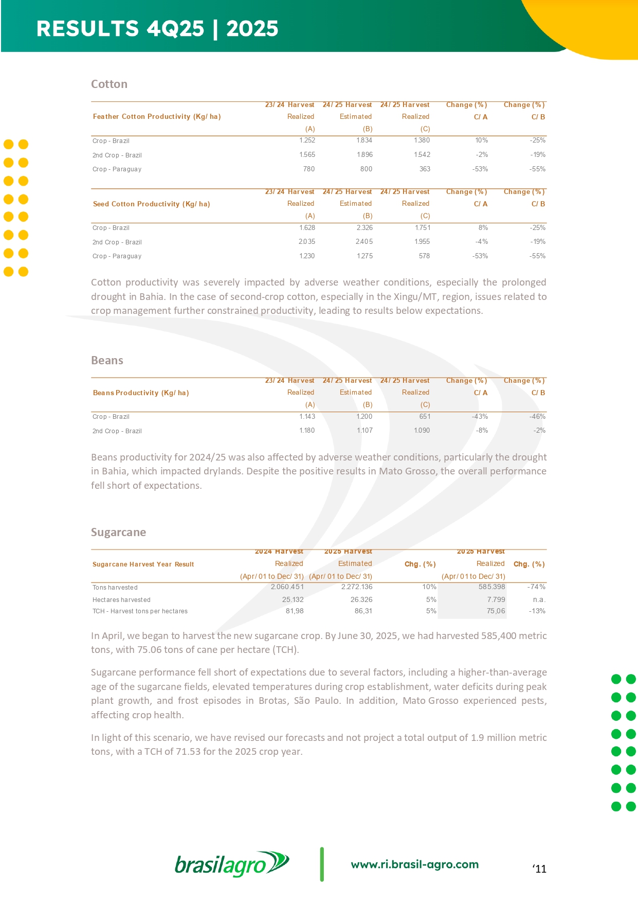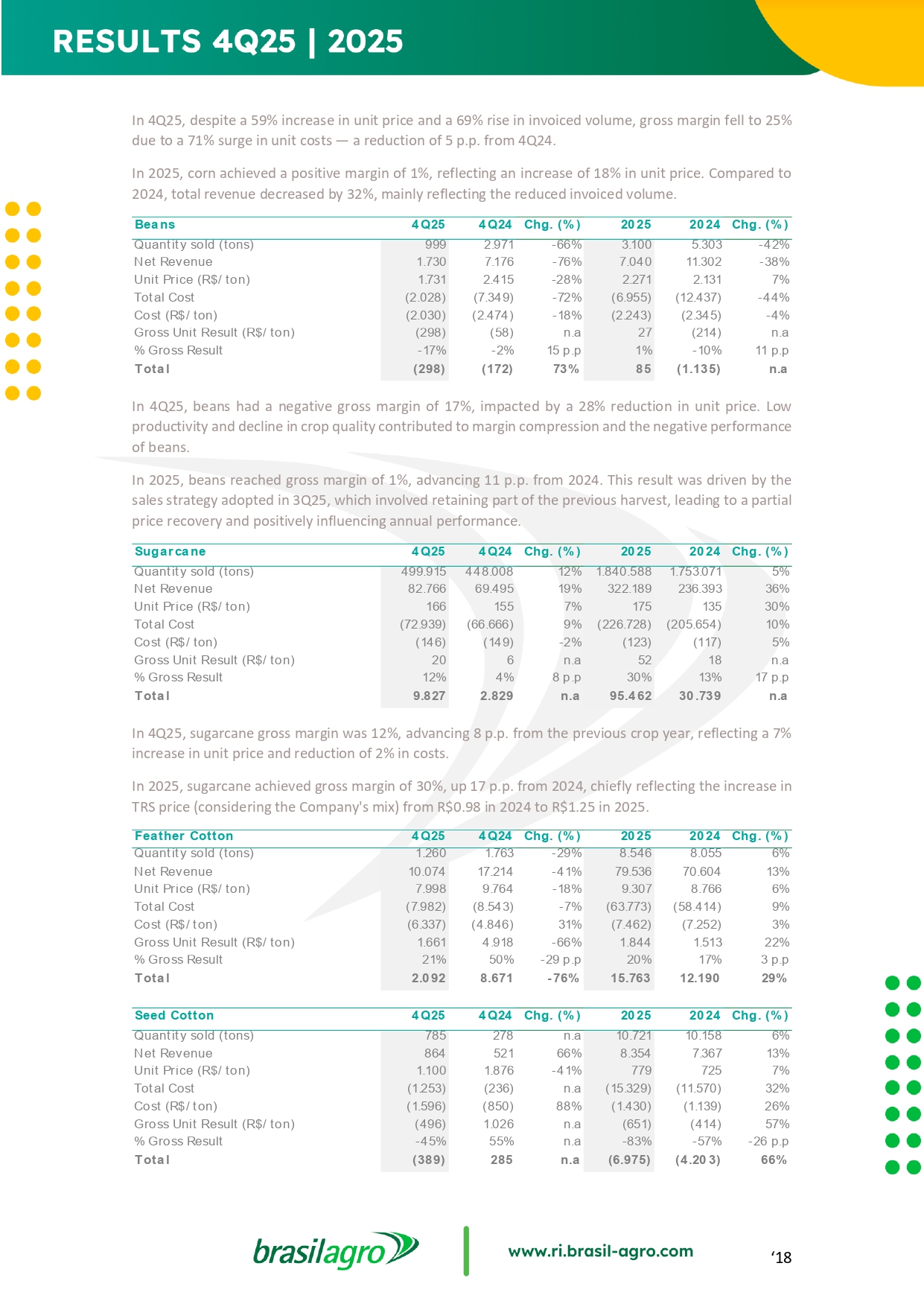 25年4季度,豆子毛利率为负17%,受单价下调28%影响。生产力低下和作物质量下降导致利润压缩和豆类的负面表现。2025年,豆类的毛利率达到1%,比2024年提高了11个p. p.。这一结果是由3 Q25采取的销售策略推动的,该策略涉及保留部分先前的收成,导致部分价格回升,并对年度业绩产生积极影响。4Q25甘蔗毛利率为12%,较上一作物年度提高8个百分点,反映出单价提高7%,成本降低2%。2025年,甘蔗实现毛利率30%,较2024年上升17个百分点,主要反映了TRS价格(考虑公司组合)从2024年的0.98雷亚尔上涨至2025年的1.25雷亚尔。25年第4季度,羽棉实现毛利率21%,较24年第4季度下降29 p. p.,主要反映单位成本增加31%,受作物管理投资增加的影响,这对本季度的盈利能力造成压力。另一方面,在前几个季度录得的正利润率的支持下,2025年的毛利率达到了20%。2025年玉米实现正向幅度1%,反映单价增长18%。与2024年相比,总收入减少32%,主要反映开票量减少。Bea ns 4 Q25 4 Q24 chg。(%)20252024CHG。(%)5.303-42% 3.1002.971-66% 999量化销售(吨)11.302-38% 7.04 07.176-76% 1.730净收入2.13 17% 2.27 12.415-28% 1.73 1单位价格(R/吨)(12.437)-44%(6.955)(7.349)-72%(2.028)总成本(2.345)-4%(2.243)(2.474)-18%(2.030)成本(R/吨)(214)n.a 27(58)n.a(298)总单位结果(R/吨)-10% 11 p.p 1%-2% 15 p.p-17%% Gross result(1.135)n.a 85(172)73%(298)tota l chg。(%)20242025CHG。(%)4 Q24 4 Q25 Suga rca ne 5% 1.75 3.07 11.84 0.58812% 448.00 8499.915 Quant ity sold(tons)36% 236.39332 2.18 919% 69.49582.766 Net revenue 30% 1351757% 155166 unit price(R $/ton)10%(205.654)(226.728)9%(66.666)(72.939)total cost 5%(117)(123)-2%(149)(146)cost(R $/ton)n.a 1852 n.a 620 Gross Unit Result(R $/ton)17 p.p 13 % 30% 8 p.p 4 % 12%% Gross result n.a 30.73 995.462 n.a 2.82 99.827 tota l ' 18 ch(%)20242025CHG。(%)4 Q24 4 Q25 Fea ther Cotton 6% 8.05 58.546-29% 1.76 31.260 Quant ity sold(tons)13% 70.60479.536-41% 17.21 410.074 Net revenue 6% 8.7669.307-18% 9.76 47.998 Unit price(R $/ton)9%(58.414)(63.773)-7%(8.543)(7.982)Total cost 3%(7.252)(7.462)31%(4.846)(6.337)Cost(R $/ton)22% 1.5 131.844-66% 4.9 181.66 1 Gross unit result(R $/ton)3 p.p 17% 20%-29 p.p 50% 21%% Gross result 29% 12.19015.763-76% 8.67 12.092 tota l(%)20242025CHG。(%)4 Q24 4 Q25籽棉6% 10.15 8 10.721 n.a 278785量化销售(吨)13% 7.3678.35466% 521864净收入7% 725779-41% 1.87 61.100单价(R/吨)32%(11.570)(15.329)n.a(236)(1.253)总成本26%(1.139)(1.430)88%(850)(1.596)成本(R/吨)57%(414)(651)n.a 1.026(496)毛单位结果(R/吨)-26 p.p-57-83% n.a 55%-45%%毛结果66%(4.203)(6.975)n.a 285(389)总结果