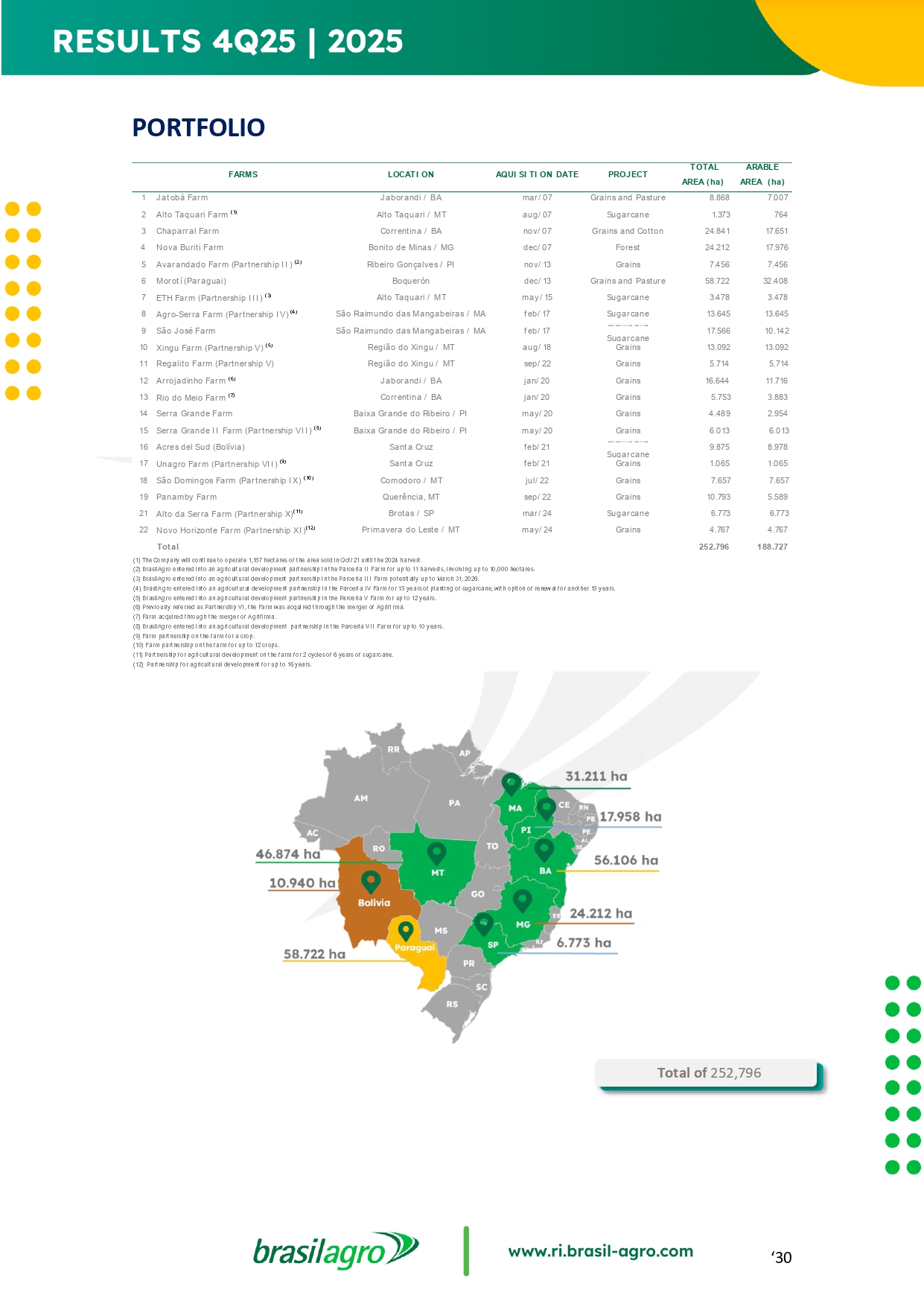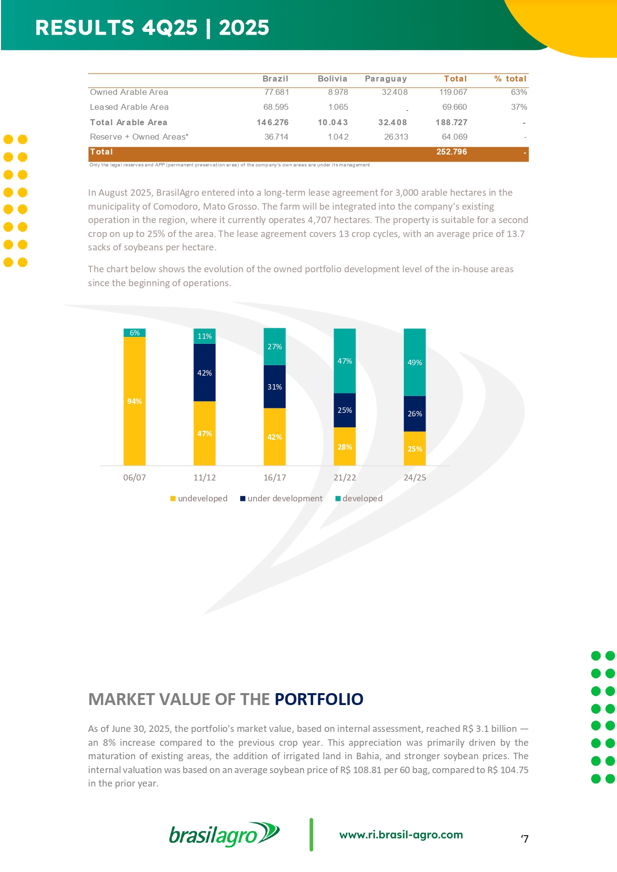 2025年8月,BrasilAgro在马托格罗索州科莫多罗市签订了3000公顷可耕地的长期租赁协议。该农场将被整合到该公司在该地区的现有业务中,该公司目前在该地区经营着4,707公顷土地。该地产适合在高达25%的面积上进行第二次种植。租赁协议涵盖13个作物周期,平均价格为每公顷13.7袋大豆。下图展示了自运营开始以来内部区域自有投资组合开发水平的演变。投资组合的市场价值截至2025年6月30日,投资组合的市场价值,基于内部评估,达到3雷亚尔。10亿——与上一作物年度相比增长8%。这一升值主要是由现有地区成熟、巴伊亚增加灌溉土地以及大豆价格走强推动的。内部估值基于108雷亚尔的大豆平均价格。每60袋81个,相比之下为104雷亚尔。前一年75。%合计巴拉圭玻利维亚巴西63% 119.06732.4088.97 877.681自有耕地面积37% 69.660-1.06568.595租赁耕地面积-188.7 273 32.40 8 10.04 3146.276总耕地面积-64.06 926.31 31.04 236.7 14储备+自有面积*-252.796合计仅com pany自有区域的legal reser ves和APP(永久preser vation专区)归其管理。94% 47% 42% 28% 25% 42% 31% 25% 26% 6% 11% 27% 47% 49% 06/0724/2511/12未开发16/17开发中21/22开发‘7