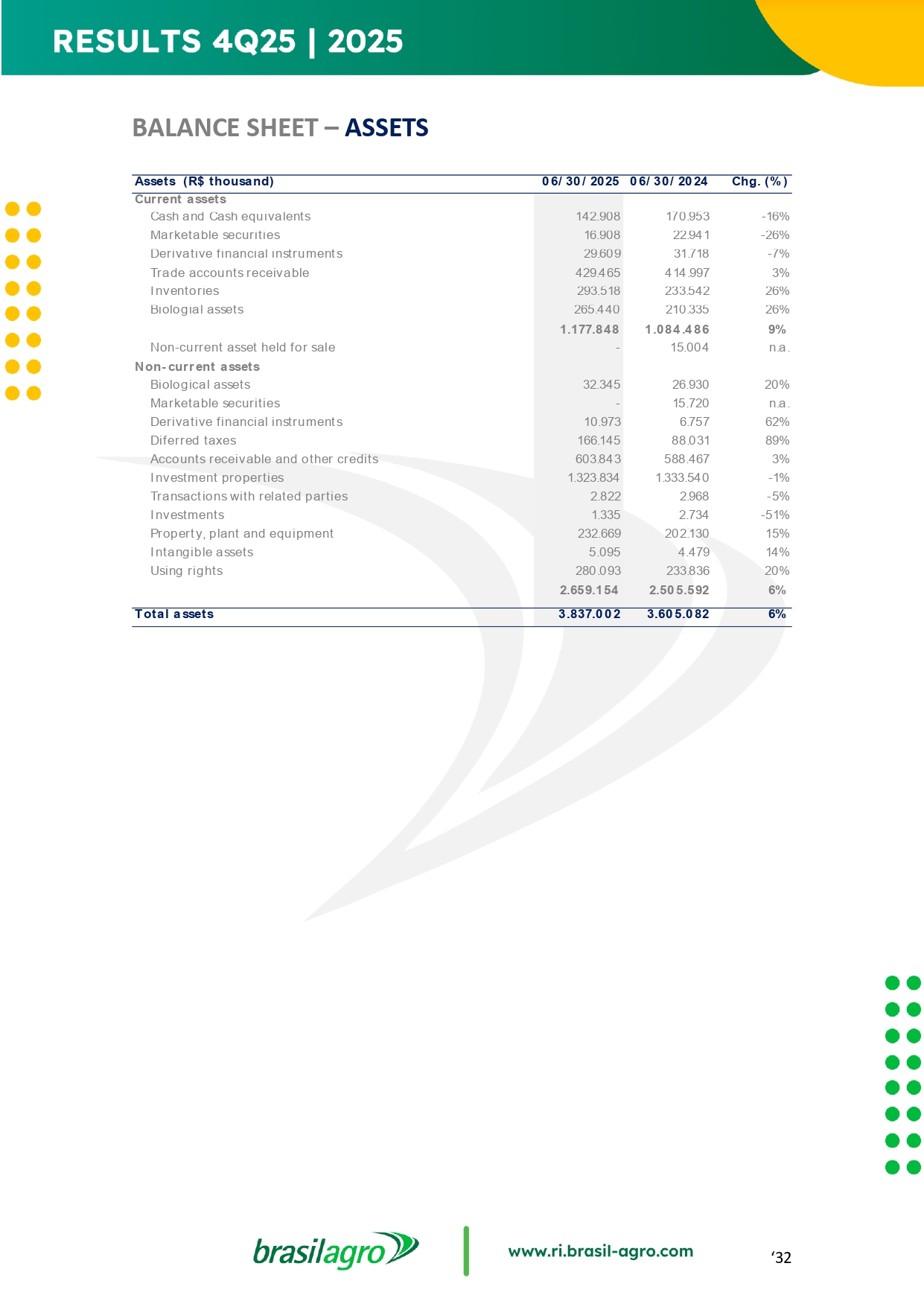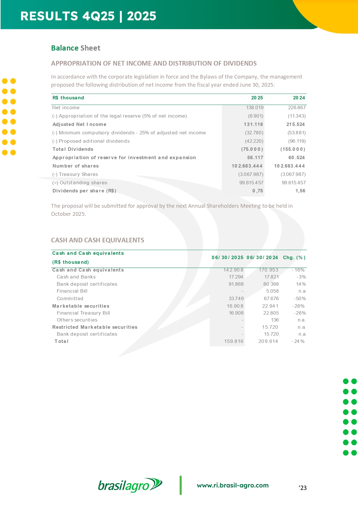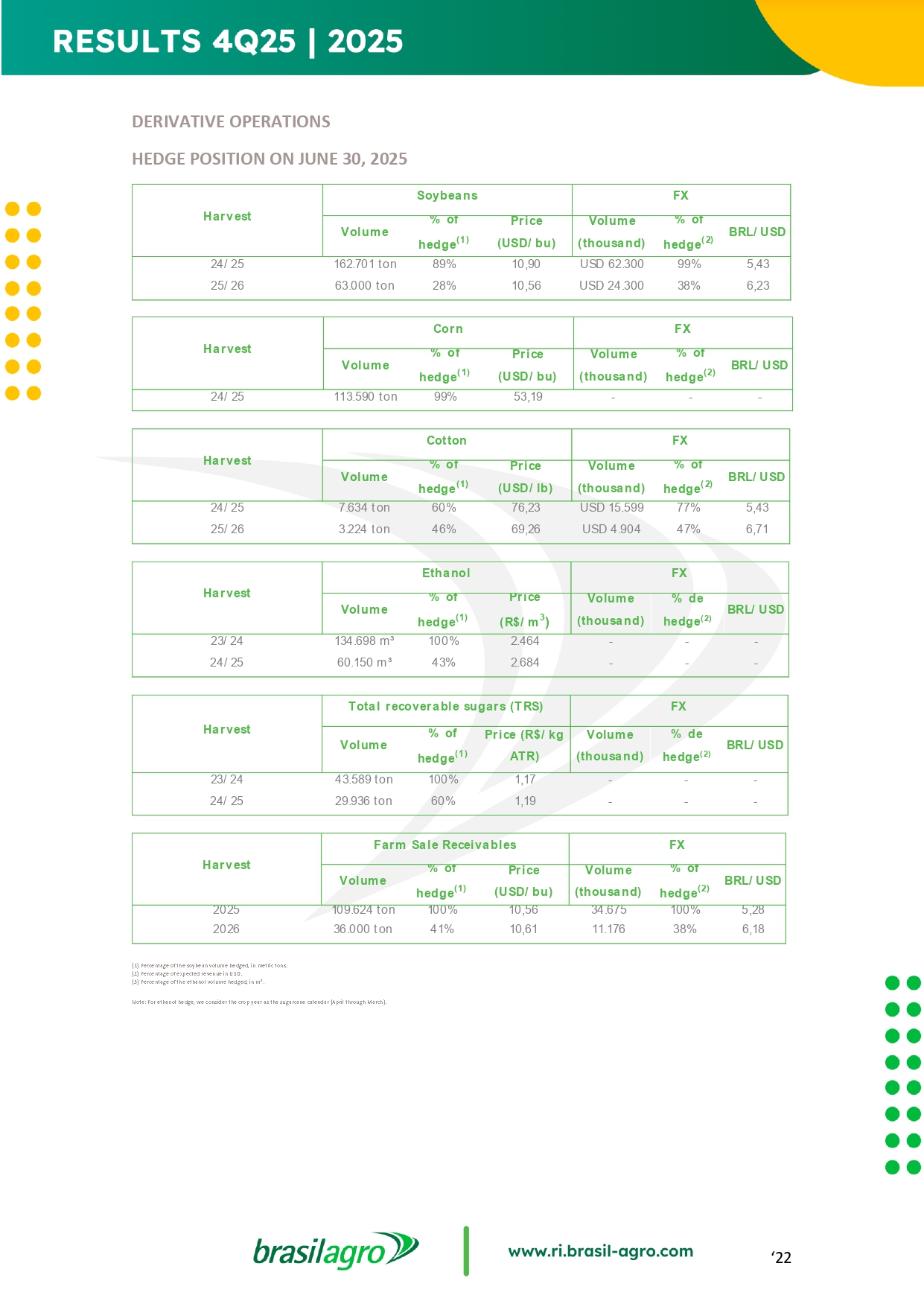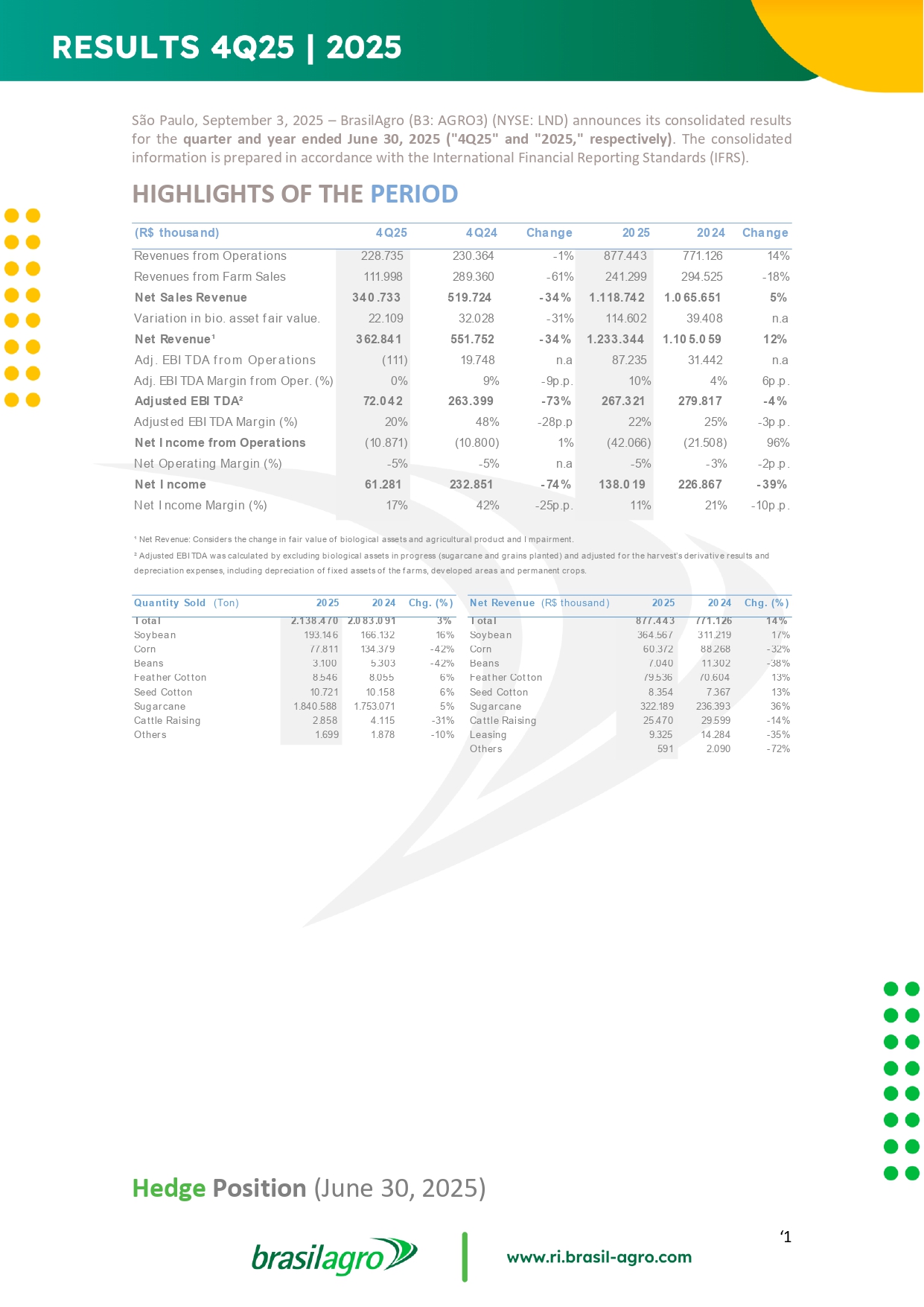 ‘1圣保罗,2025年9月3日– BrasilAgro(B3:AGRO3)(NYSE:LND)公布截至2025年6月30日止季度和年度的综合业绩(分别为“4Q25”和“2025”)。综合资料乃根据国际财务报告准则(IFRS)编制。期对冲头寸要点(2025年6月30日)Cha nge 20242025 Cha nge 4 Q24 4 Q25(R $ thousand nd)14% 771.126877.443-1% 230.364228.73 5Revenues f rom Operations-18% 294.525241.299-61% 289.360111.998 Revenues f rom Farm Sales 5% 1.065.65 11.1 18.74 2-34% 519.72 4340.733 Net SA les revenue n.a 39.408114.602-31% 32.02 822.109 variation in bio.a sset fair value。12% 1.10 5.05 91.23 3.34 4-34% 551.75 2362.841净收入丨n.a 31.44287.235 n.a 19.748(111)调整后EBI TDA f r om op er a t i ons 6p.p. 4% 10%-9p.p. 9% 0%调整后EBI TDA Margin f rom op.(%)-4% 279.81 7267.321-73% 263.39972.042调整后EBI TDA ²-3p.p. 25% 22%-28p.p. 48% 20%调整后EBI TDA Margin(%)96%(21.508)(42.066)1%(10.800)(10.871)Net i ncome from operations-2p.p.-3%-5% n.a-5%-5%-5%净营业利润率(%)-39% 226.86 7138.019-74% 232.85 161.281净i ncome-10p.p. 21% 11%-25p.p. 42% 17%净i ncome利润率(%)丨净收入:考虑生物资产和农产品的f空气价值变化和i减值。²调整后EBI TDA的计算方法是剔除在产生物资产(甘蔗和种植的谷物)和调整后的f或收获的衍生结果和折旧费用,包括f兵种、发达地区和永久作物的f ixed资产的折旧。CHG。(%)20242025净营收(千雷亚尔)CHG。(%)20242025(吨)销售数量14% 771.126877.443合计3% 2.08 3.09 12.13 8.470合计17% 311.219364.567大豆16% 166.13 2193.146大豆-32% 88.26860.372玉米-42% 134.37977.8 11玉米-38% 11.3027.040豆-42% 5.3033.100豆13% 70.60479.536羽棉6% 8.05 58.546羽棉13% 7.36 78.354籽棉6% 10.158 10.721籽棉36% 236.39332 2.18 9甘蔗5% 1.75 3.07 11.84 0.588甘蔗-14% 29.59925.470养牛-31% 4.11 52.858养牛-35% 14.28 49.325租赁-72% 2.090591其他