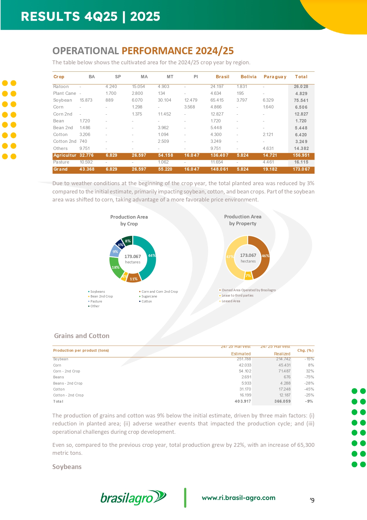 2024/25年度经营业绩下表按区域显示2024/25作物年度的耕作面积。由于作物年度开始时的天气状况,总种植面积比最初估计的减少了3%,主要影响大豆、棉花和豆类作物。部分大豆面积转向玉米,利用了较为有利的价格环境。谷物和棉花谷物和棉花产量比初步估计低9%,主要受三个因素推动:(i)种植面积减少;(ii)影响生产周期的不利天气事件;以及(iii)作物发展期间的运营挑战。即便如此,与上一作物年度相比,总产量增长了22%,增幅为65,300公吨。大豆Tota l Pa ra gua y玻利维亚Bra sil PI MT MA SP BA作物26.02 8-1.83 124.197-4.90315.05 44.240-拉通豆4.82 9-1954.634-1342.8001.700-植物甘蔗75.54 16.32 93.7 9765.4 1512.47930.10 46.07088915.87 3大豆6.5061.640-4.8663.568-1.298--玉米12.8 27--12.8 27-11.45 21.375--玉米第二1.720--1.720---1.720豆5.448-3.962--1.486豆二6.4202.12 1-4.300-1.094--3.206棉花3.249--3.24 9-2.509--740棉花第二14.38 24.63 1-9.751----9.751其他156.95 114.72 15.8 24136.40716.04754.158 26.59 76.82 932.776农业16.11 54.461-11.654-1.062--10.592牧场173.06 719.18 25.8 24148.06 116.04755.22026.59 76.82 943.368Gra nd 44%作物玉米生产面积和玉米第二作物甘蔗棉大豆豆第二作物牧场其他8% 6% 9% 173.067公顷18% 4% 11% 7% 47%按财产拥有面积划分的生产面积由Brasilagro Lease经营给第三方的租赁面积' 9 173.06 746%公顷CHG。(%)24/25har v est实现24/25har v est估计每产品产量(吨)-15% 214.74 2251.788大豆8% 45.43142.03 3玉米32% 71.48754.102玉米-第二季作物-75% 6762.691豆-28% 4.2885.93 3豆-第二季作物-45% 17.24831.170棉花-25% 12.18 716.199棉花-第二季作物-9% 366.05 9403.917总吨l