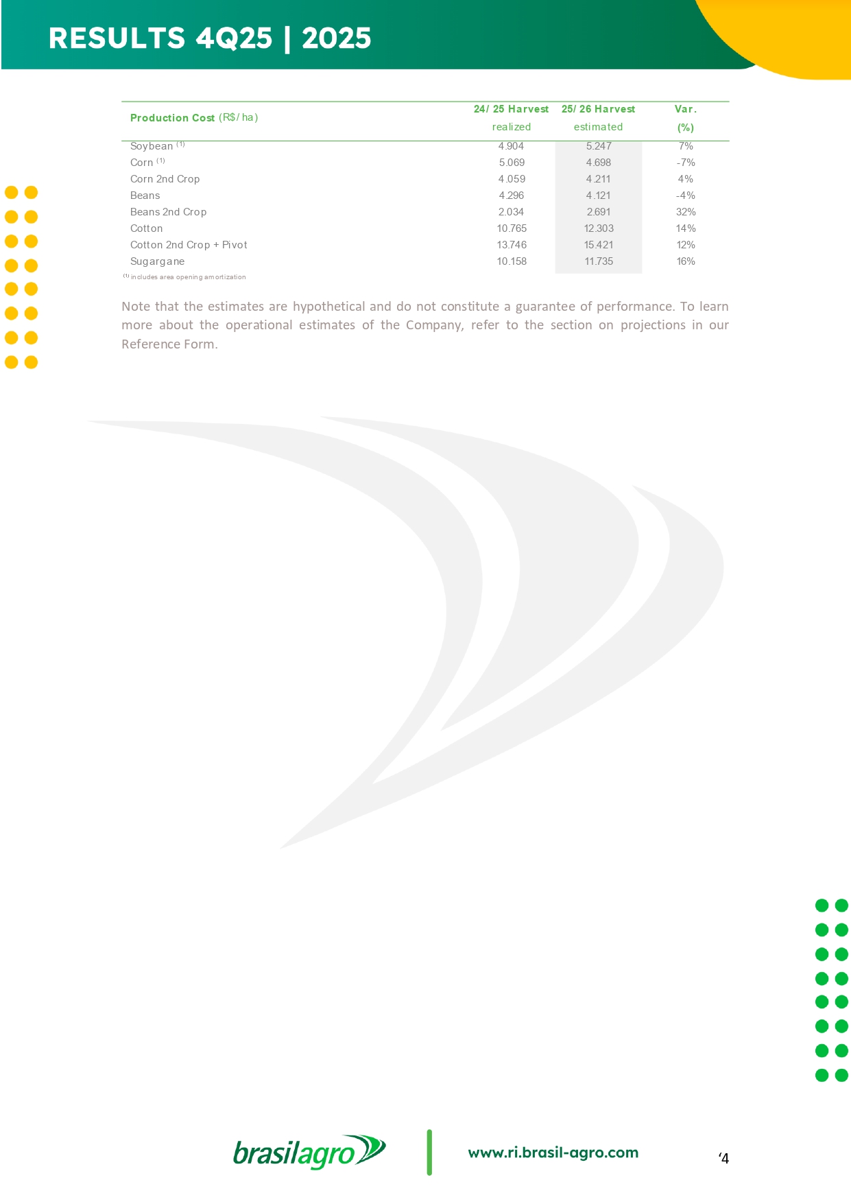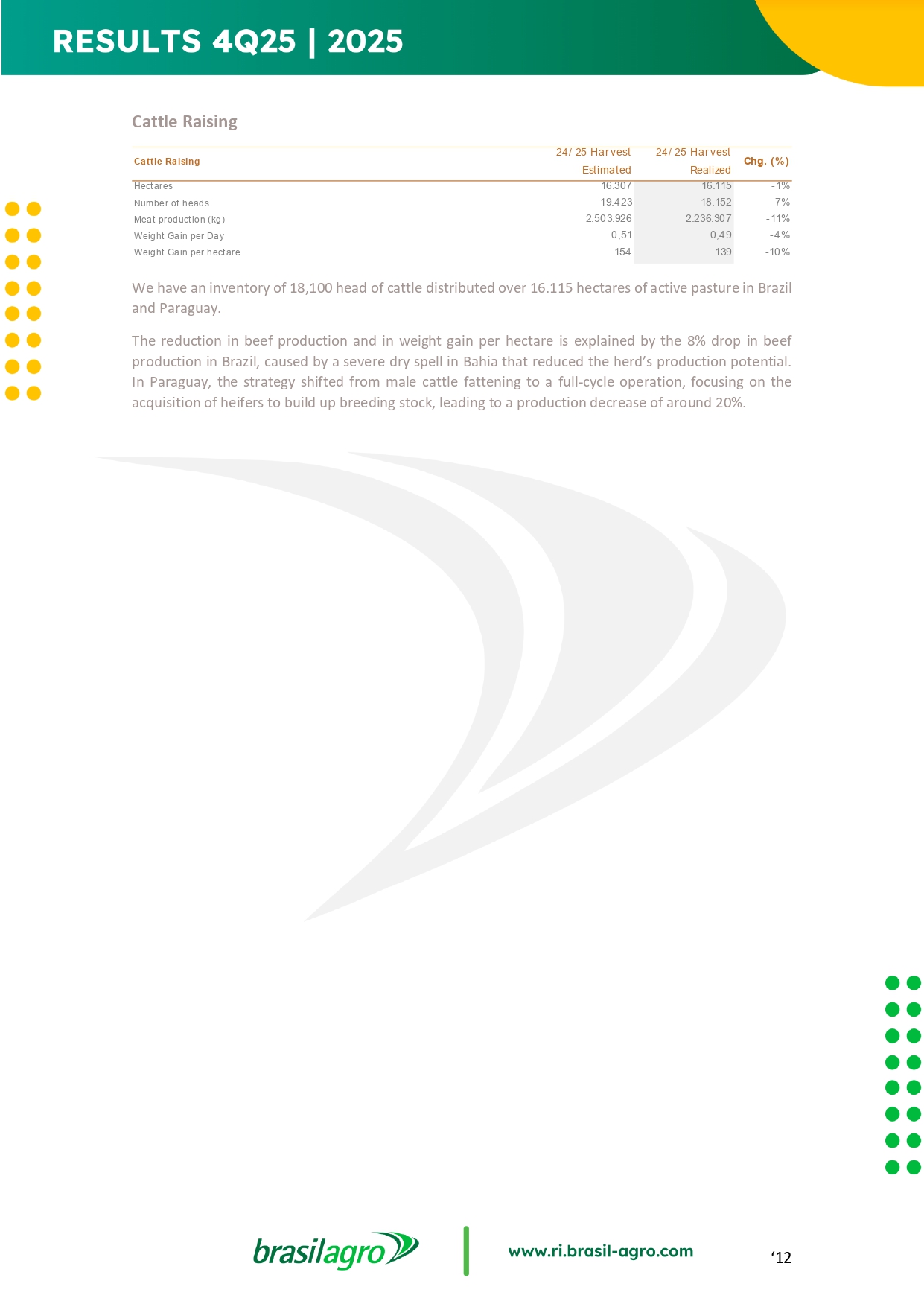 种植面积(公顷)24/25收获25/26收获chg。(%)估计实现5% 79.34 475.541大豆69% 11.01 26.506玉米27% 16.31612.8 27玉米-第二季作物-54% 7861.720豆8% 5.87 35.4 48豆-第二季作物-70% 1.89 86.420棉花-32% 2.2143.249棉花-第二季作物4% 27.05 126.02 8拉通藤-46% 2.62 74.82 9植物藤-46% 8.64916.115牧草17% 16.84 114.382其他n.a 172.6 10173.067按作物分列的总产量(吨)24/25收获25/26收获CHG。(%)预估实现17% 252.02 2214.742大豆43% 64.87 245.43 1玉米39% 99.23071.487玉米-第二季41% 954676豆70% 7.27 44.288豆-第二季-51 % 8.42717.248棉花-20% 9.80 812.18 7棉花-第二季21% 442.587366.059甘蔗总收成年度结果2025收成预估2025收成预估CHG。(%)(Apr/01至Dec/31)(Apr/01至Dec/31)-18% 1.86 1.7942.27 2.136吨收获-1% 26.02 826.326公顷收获-17% 71,5386,31 TCH-每公顷CHG收获吨。(%)25/26丰收预估*24/25丰收实现养牛-46 % 8.64916.115公顷-36 % 11.56718.15 2头数-15 % 1.90 9.5702.236.307肉类产量(公斤)-4 %0,470,49日增重59% 221139每公顷增重*Fazenda Prefer ê ncia的出售已经在考虑之中。牛玉米-25/26收获(%)种植甘蔗棉豆第二季玉米大豆预估65% 68% 95% 97% 92% 82% 76%可变成本0% 0% 11% 13% 14% 13% 11%种子0% 11% 23% 13% 39% 29% 21%化肥0% 6% 22% 19% 10% 14% 16%防御0% 38% 26% 39% 27% 25% 25%农业服务0% 8% 2% 3% 2% 1% 1%燃料和润滑油7% 0% 0% 0% 0% 0% 0% 0% 0% 0%机器维修和仪器53% 0% 0% 0% 0% 0%动物饲料5% 4% 11% 9% 1% 0% 1%其他35% 32% 5% 3% 8% 18% 24%固定成本18% 3% 1% 7% 6% 9%人工13% 0% 1%折旧及摊销金额0% 16% 1% 0% 9% 13% I FRS 16 4% 0% 2% 0% 2% 1%其他' 3