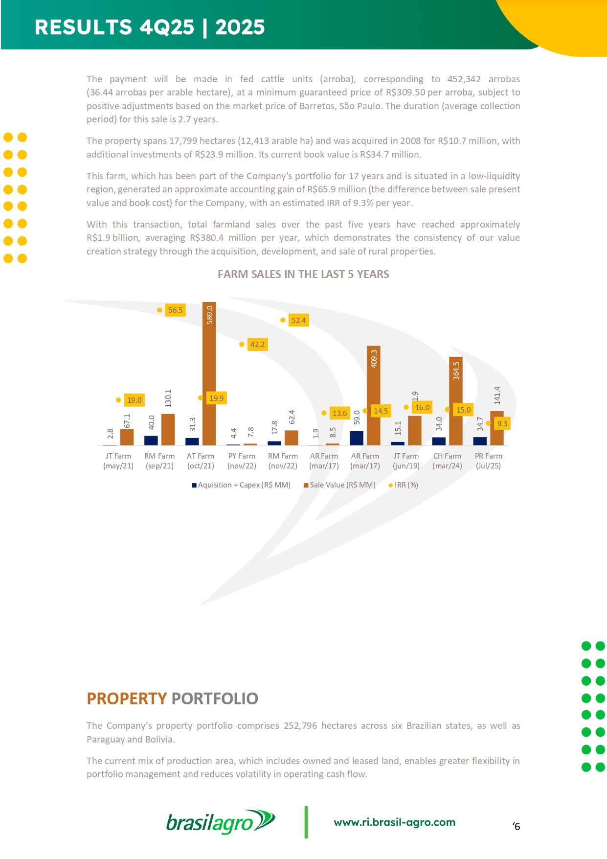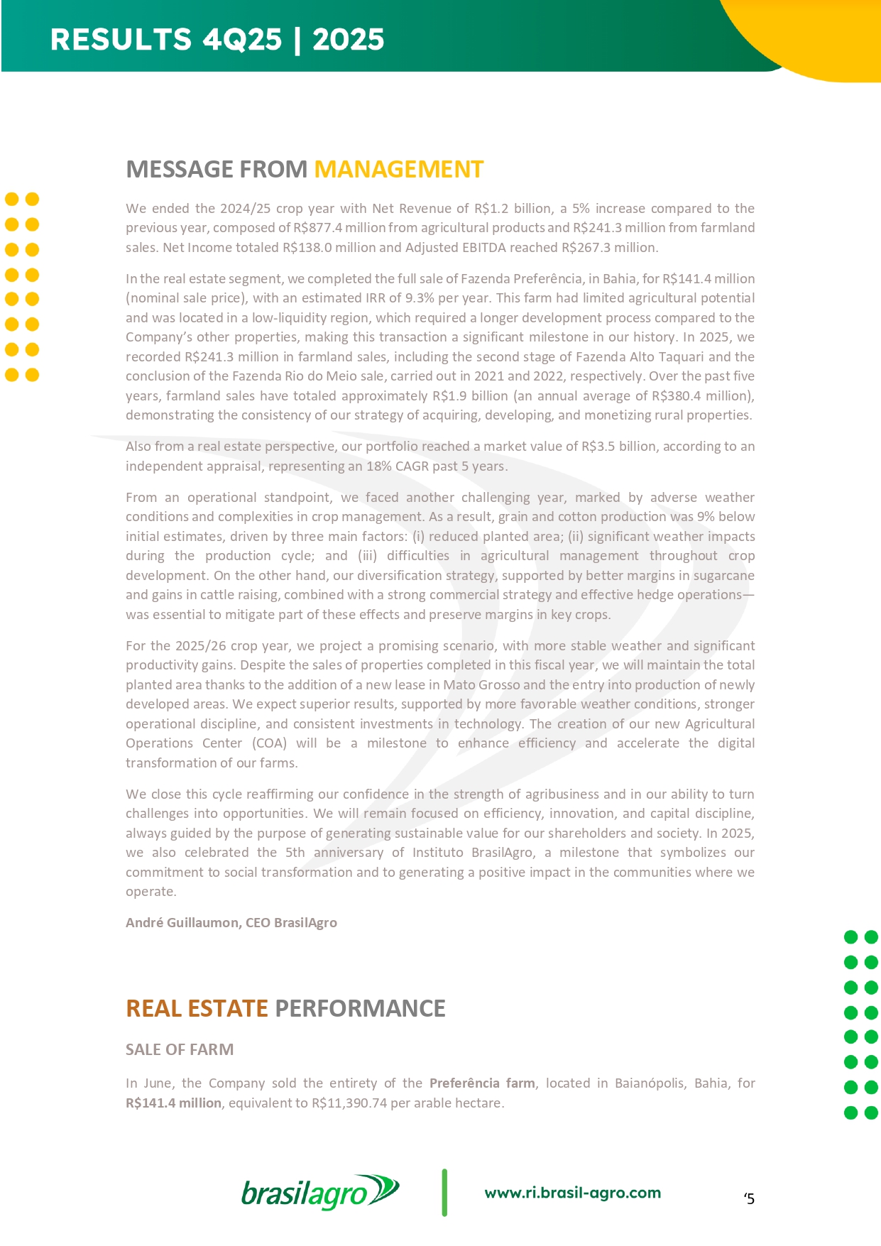 来自管理层的消息我们在2024/25作物年度结束时的净收入为1雷亚尔。20亿,较上年增长5%,由877雷亚尔组成。400万来自农产品和241雷亚尔。300万来自农田销售。净收入总计138雷亚尔。0万,调整后EBITDA达到267雷亚尔。300万。在房地产领域,我们以141雷亚尔的价格完成了巴伊亚州Fazenda Prefer ê ncia的全部销售。400万(名义售价),预估IRR为9。每年3%。该农场的农业潜力有限,且位于流动性较低的地区,与公司的其他物业相比,需要更长的开发过程,这使得该交易成为我们历史上的一个重要里程碑。2025年,我们录得241雷亚尔。300万的农田销售,包括Fazenda Alto Taquari的第二阶段和Fazenda Rio do Meio销售的结束,分别于2021年和2022年进行。过去五年,农田销售总额约为1雷亚尔。90亿(年均380雷亚尔。400万),彰显了我们收购、开发、变现农村物业战略的一致性。同样从房地产的角度来看,我们的投资组合达到了3雷亚尔的市值。50亿,根据独立评估,过去5年的复合年增长率为18%。从运营的角度来看,我们面临着又一个充满挑战的一年,其特点是不利的天气条件和作物管理的复杂性。因此,粮食和棉花产量比初步估计低9%,原因主要有三个:(i)种植面积减少;(ii)生产周期内的重大天气影响;(iii)在整个作物发育过程中的农业管理困难。另一方面,我们的多元化战略得到了甘蔗利润率提高和养牛收益的支持,再加上强有力的商业战略和有效的对冲操作——对于缓解部分这些影响和保持关键作物的利润率至关重要。对于2025/26作物年度,我们预计会出现一个充满希望的情景,天气将更加稳定,生产力将显着提高。尽管本财年完成了物业的销售,但由于马托格罗索州新增租约和新开发区域的投产,我们将维持总种植面积。我们预计,在更有利的天气条件、更强的运营纪律以及对技术的持续投资的支持下,将取得优越的结果。我们新的农业运营中心(COA)的创建将成为我们农场提升效率和加速数字化转型的里程碑。我们结束这一周期,重申我们对农业综合企业的实力以及我们将挑战转化为机遇的能力的信心。我们将始终专注于效率、创新和资本纪律,始终以为股东和社会创造可持续价值为宗旨。2025年,我们还庆祝了Instituto BrasilAgro成立5周年,这是一个里程碑,象征着我们致力于社会转型,并在我们经营所在的社区产生积极影响。Andr é Guillaumon,CEO BrasilAgro‘5 Real Estate Performance Sale of Farm 6月,该公司以141雷亚尔的价格出售了位于巴伊亚州Baian ó polis的整个Prefer ê ncia农场。400万,相当于11,390雷亚尔。每耕地74公顷。付款将在饲养牛单位(arroba),对应452,342 arrobas(36。每耕地公顷44棵arrobas),最低保证价格为309雷亚尔。50/arroba,视圣保罗Barretos市场价格正向调整。此次出售的期限(平均收款期)为2。7年。