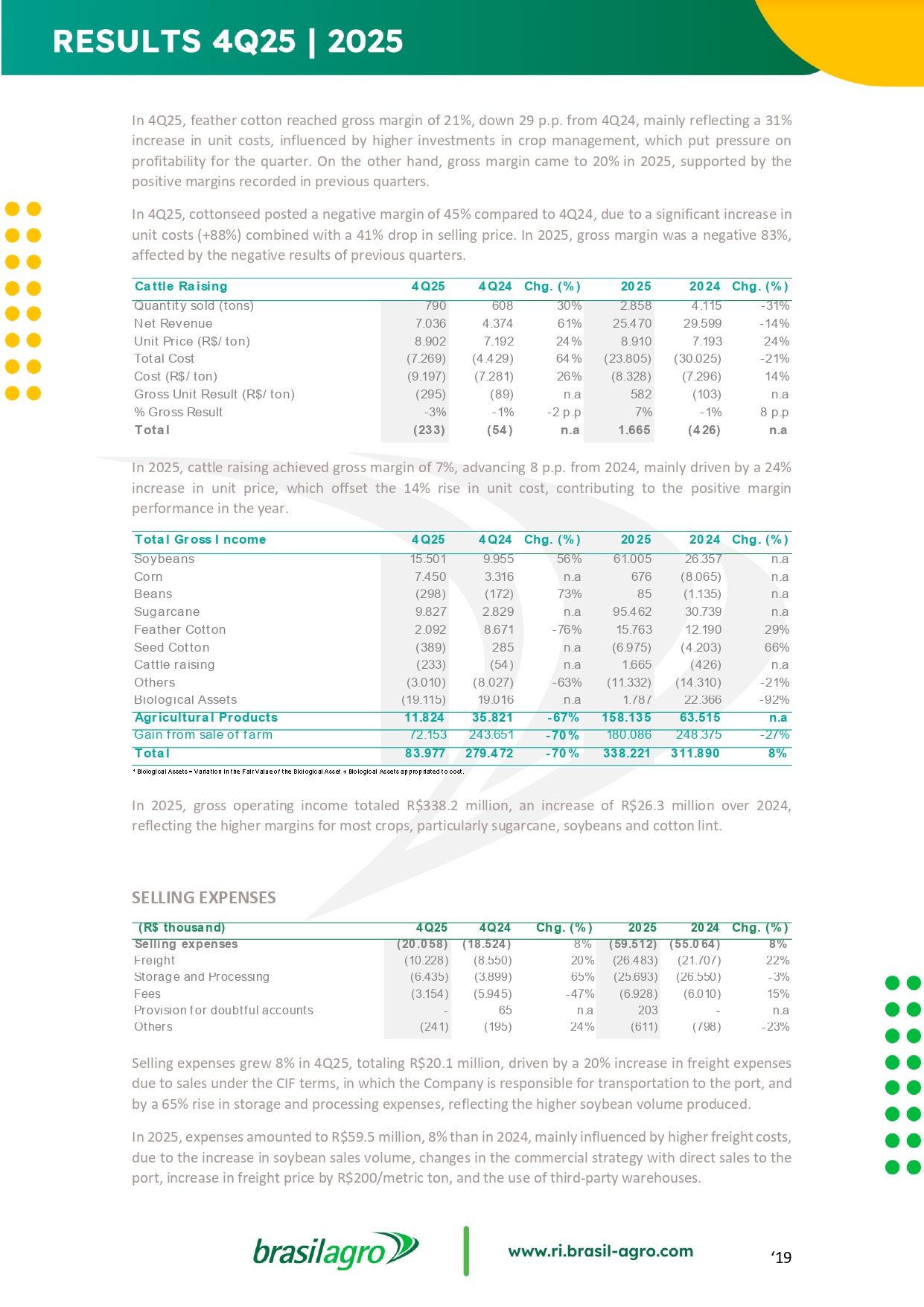 销货成本(COGS)‘17在4 Q25,总销货成本较4 Q24增加5%,反映本季度销量增加10%,主要受玉米和甘蔗销量增加所带动。2025年与2024年成本上涨12%,主要是由于用于公允价值标记的价格较高和单位成本略有增加,导致交易的大豆数量增加16%和皮棉成本增加12%。此外,甘蔗成本也有所上涨,特别是在圣保罗的布罗塔斯,原因是该地区的运营费用增加,但被较高的售价所抵消。25年4季度,尽管开票量下降17%,单价下降3%,但毛利率从24年4季度的8%上升到25年4季度的16%,改善了8个百分点。这一结果反映出单位成本降低了11%,这抵消了收入下降并支持了利润率扩张。2025年,大豆实现毛利率17%,较2024年上升9个百分点,这得益于较低的投入价格,销量增长16%,单位成本下降8%。25年第4季度,尽管单价增长59%,开票量增长69%,但由于单位成本飙升71% ——较24年第4季度减少5个百分点,毛利率降至25%。CHG。(%)20242025CHG。(%)4 Q24 4 Q25(千雷亚尔)-1%(729.978)(721.095)-7%(213.562)(197.795)销货成本7%(284.862)(303.562)-26%(108.058)(79.854)大豆-38%(96.333)(59.695)n.a(7.659)(22.061)玉米-44%(12.437)(6.955)-72%(7.349)(2.028)豆9%(58.414)(63.773)-7%(8.543)(7.982)羽棉32%(11.570)(15.329)n.a(236)(1.253)籽棉10%(205.654)(226.72 8)(%)20242025CHG。(%)4 Q24 4 Q25(千雷亚尔)12%(747.019)(833.9 10)5%(226.572)(239.018)总销售成本17%(295.345)(346.082)-19%(112.069)(91.258)大豆-26%(93.8 18)(69.098)n.a(10.912)(35.181)玉米-45%(12.582)(6.955)-72%(7.349)(2.028)豆12%(63.921)(71.528)-45%(13.92 2)(7.680)羽棉15%(9.598)(11.017)26%(788)(996)籽棉34%(212.925)(284.684)33%由农作物ChG。(%)20242025CHG。(%)4 Q24 4 Q25大豆a ns 16% 166.13 2 193.146-17% 64.39353.5 15 Quant ity sold(tons)17% 311.219364.567-19% 118.01 495.354 Net revenue 1% 1.87 31.888-3% 1.83 31.782 unit price(R $/ton)7%(284.862)(303.562)-26%(108.058)(79.854)总成本-8%(1.715)(1.572)-11%(1.678)(1.492)成本(R $/ton)99% 15931687% 155290 Gross unit result(R $/ton)9 p.p 8% 17% 8 p.p 8% 16%% Gross result n.a 26.35761.00556% 9.95515.501 tota l chg(%)20242025CHG。(%)4 Q24 4 Q25玉米-42% 134.37977.81 169% 20.76 435.03 8已售数量(吨)-32% 88.268 60.372 n.a 10.97 529.5 11净收入18% 65777659% 529842单价(R/吨)-38%(96.333)(59.695)n.a(7.659)(22.061)总成本7%(717)(767)71%(369)(630)成本(R/吨)n.a(60)933% 160213毛单位结果(R/吨)10 p.p-9% 1%-5 p.p 30% 25% %毛结果n.a(8.065)676 n.a 3.3167.450 tota l
