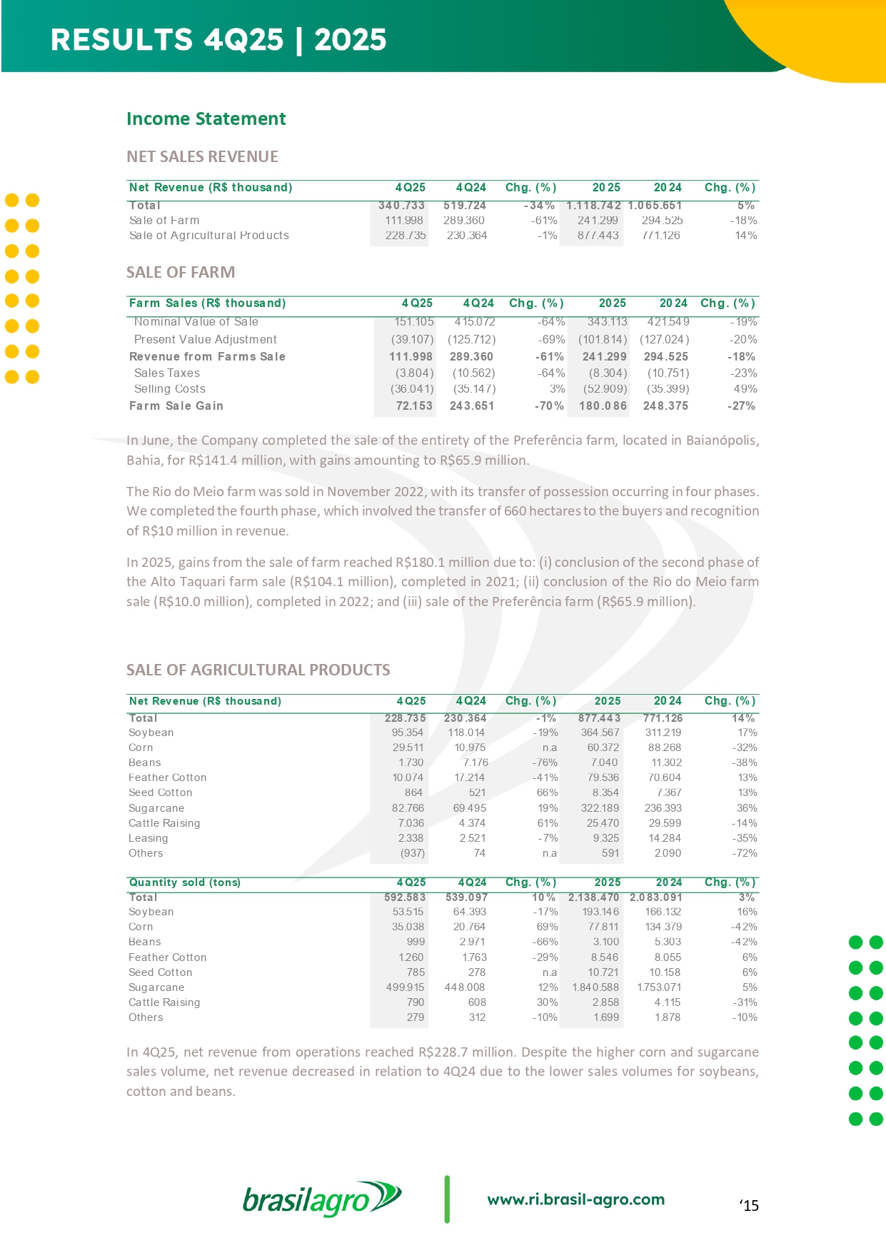 6月,公司以141雷亚尔的价格完成了位于巴伊亚州Baian ó polis的整个Prefer ê ncia农场的出售。400万,收益达65雷亚尔。900万。Rio do Meio农场于2022年11月出售,其所有权转移分四个阶段进行。我们完成了第四阶段,这涉及向买家转让660公顷土地并确认1000万雷亚尔的收入。2025年,出售农场的收益达到180雷亚尔。100万因:(i)完成Alto Taquari农场出售的第二阶段(104雷亚尔。100万),2021年完成;(ii)完成Rio do Meio农场出售(10雷亚尔。(三)出售Prefer ê ncia农场(65雷亚尔),2022年完成。900万)。25年第4季度销售农业产品,运营净收入达到228雷亚尔。700万。尽管玉米和甘蔗销量增加,但由于大豆、棉花和豆类销量下降,净营收较24季度减少。2025年,业务净收入达877雷亚尔。400万,比2024年增长14%,主要反映大豆销量增加16%,加上总可回收糖(TRS)价格(考虑公司的混合)从0雷亚尔上涨。2024年为98至1雷亚尔。2025年26名。净收入(千雷亚尔)4 Q25 4 Q24 CHG。(%)20252024CHG。(%)5% 1.065.65 11.1 18.74 2-34% 519.72 4340.733合计-18% 294.525241.299-61% 289.360111.998出售农场14% 771.126877.443-1% 230.364228.735出售农产品CHG。(%)202420254 Q24CHG。(%)4 Q25 Fa RMM Sa les(R $ thousand nd)-19% 421.54 9343.11 3415.072-64% 151.105销售名义价值-20%(127.024)(101.814)(125.7 12)-69%(39.107)现值调整-18% 294.525241.299289.360-61% 111.998来自Fa RMM Sa le的收入-23%(10.751)(8.304)(10.562)-64%(3.804)销售税49%(35.399)(52.909)(35.147)3%(36.041)销售成本-27% 248.375180.086243.651-70% 72.15 3 fa rm Sa le ga in ' 15 chg。(%)20242025CHG。(%)Q4 Q4 Q4净收入(千雷亚尔)14% 771.126877.443-1% 230.364228.7 35合计17% 311.219364.567-19% 118.01 495.354大豆-32% 88.268 60.372 n.a 10.97 529.5 11玉米-38% 11.3027.040-76% 7.17 61.730豆13% 70.60479.536-41% 17.21 410.074羽棉13% 7.3678.35466% 521864籽棉36% 236.39332 2.18 919% 69.49582.766甘蔗-14% 29.59925.47061% 4.37 47.036养牛-35% 14.28 49.325-7% 2.52 12.338租赁-72% 2.090591 n.a(%)20242025CHG。(%)4 Q24 4 Q25 Qua ntity sold(tons)3% 2.08 3.09 12.13 8.47010% 539.09 759 2.583 total 16% 166.13 2193.146-17% 64.39353.515 soybean-42% 134.37 977.81 169% 20.76 435.03 8 corn-42% 5.303 3.100-66% 2.97 1999豆6% 8.05 58.546-29% 1.76 31.260羽棉6% 10.15 8 10.72 1 n.a 278785籽棉5% 1.75 3.07 11.84 0.58812% 448.00 8499.915甘蔗-31% 4.11 52.85830% 608790养牛-10% 1.87 81.699-10% 312279其他