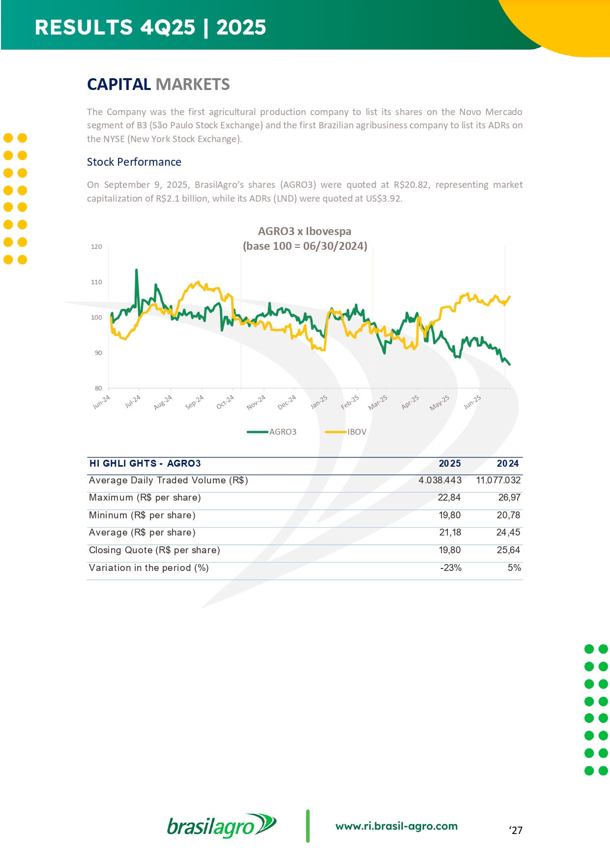 资本市场该公司是第一家在B3(圣保罗证券交易所)的Novo Mercado板块上市的农业生产公司,也是第一家在纽约证券交易所(纽约证券交易所)上市其ADR的巴西农业综合企业。2025年9月9日股票表现,BrasilAgro的股票(AGRO3)报20雷亚尔。82,代表市值2雷亚尔。10亿,而其ADR(LND)报3美元。92 .8090100110120 AGRO3 x Ibovespa(base 100 = 06/30/2024)IBOV AGRO3 20242025 HI GHLI GHTS-AGRO3 11.07 7.03 24.03 8.443平均每日交易量(R $)26,9722,84最大值(R $ per share)20,7819,80 Mininum(R $ per share)24,4521,18 Average(R $ per share)25,6419,80 Closing Quote(R $ per share)5%-23 %期内变动(%)' 27