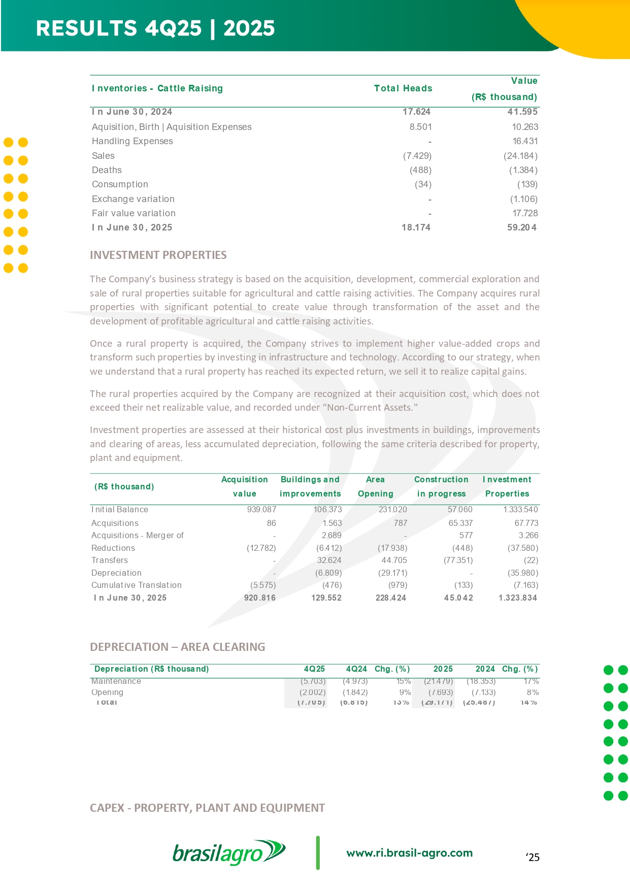 折旧–区域清算资本支出-财产、厂房和设备I nventories-ca ttle ra ising tota l hea ds va lue(R $ thousand nd)41.59517.624 i n june 30,202410.2638.501收购、出生|收购费用16.431-处理费用(24.184)(7.429)销售(1.384)(488)死亡(139)(34)消费(1.106)-汇兑变动17.728-公允价值变动59.20418.17 4 i n june 30,2025投资物业公司的经营策略是基于收购、开发、适合农业和养牛活动的农村物业的商业勘探和销售。公司通过改造资产和发展有利可图的农业和养牛活动,收购具有重大创造价值潜力的农村物业。一旦收购了农村物业,公司努力实现更高附加值的作物,并通过投资基础设施和技术来改造这些物业。根据我们的策略,当我们了解到一个农村物业达到了预期收益,我们将其出售以实现资本收益。公司收购的农村物业按其取得成本确认,不超过其可变现净值,记入“非流动资产。"投资物业的评估按其历史成本加上对建筑物、改善和清理区域的投资,减去累计折旧,遵循对物业、厂房和设备描述的相同标准。收购建筑物和区域建设I nvestment(千雷亚尔)在建物业期初改善价值1.33 3.54057.060231.0 2016.373939.087 i nitial balance 67.77 365.33 77871.56386 acquisitions 3.266577-2.689-acquisitions-merger of(37.580)(448)(17.938)(6.412)(12.782)reductions(22)(77.351)44.70 532.624-transfers(35.980)-(29.17 1)(6.809)-depreciation(7.163)(133)(979)(476)(5.575)cumulative translation 1.32 3.83 445.04 228.424129.55 2920.816 i(%)20242025CHG。(%)4 Q24 4 Q25折旧(千雷亚尔nd)17%(18.353)(21.479)15%(4.973)(5.703)维持8%(7.133)(7.693)9%(1.842)(2.002)开盘14%(25.487)(29.17 1)13%(6.815)(7.705)Tota l ' 25