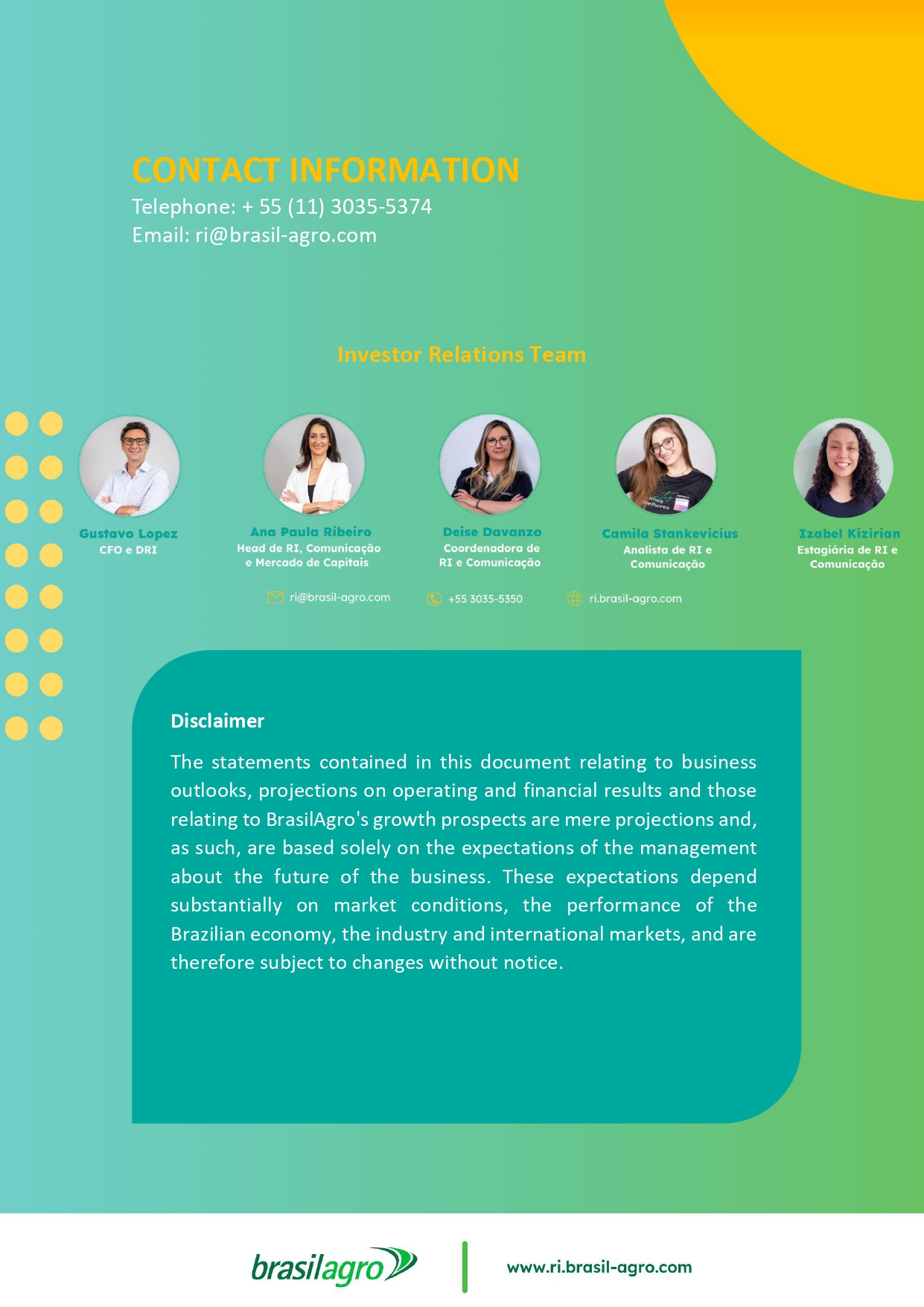 ‘28联系信息电话:+ 55(11)3035-5374邮箱:ri@brasil-agro.com投资者关系团队免责声明本文件中包含的与业务前景、经营和财务业绩预测以及与BrasilAgro增长前景相关的陈述仅为预测,因此完全基于管理层对业务未来的预期。这些预期在很大程度上取决于市场状况、巴西经济表现、行业和国际市场,因此可能会发生变化,恕不另行通知。
