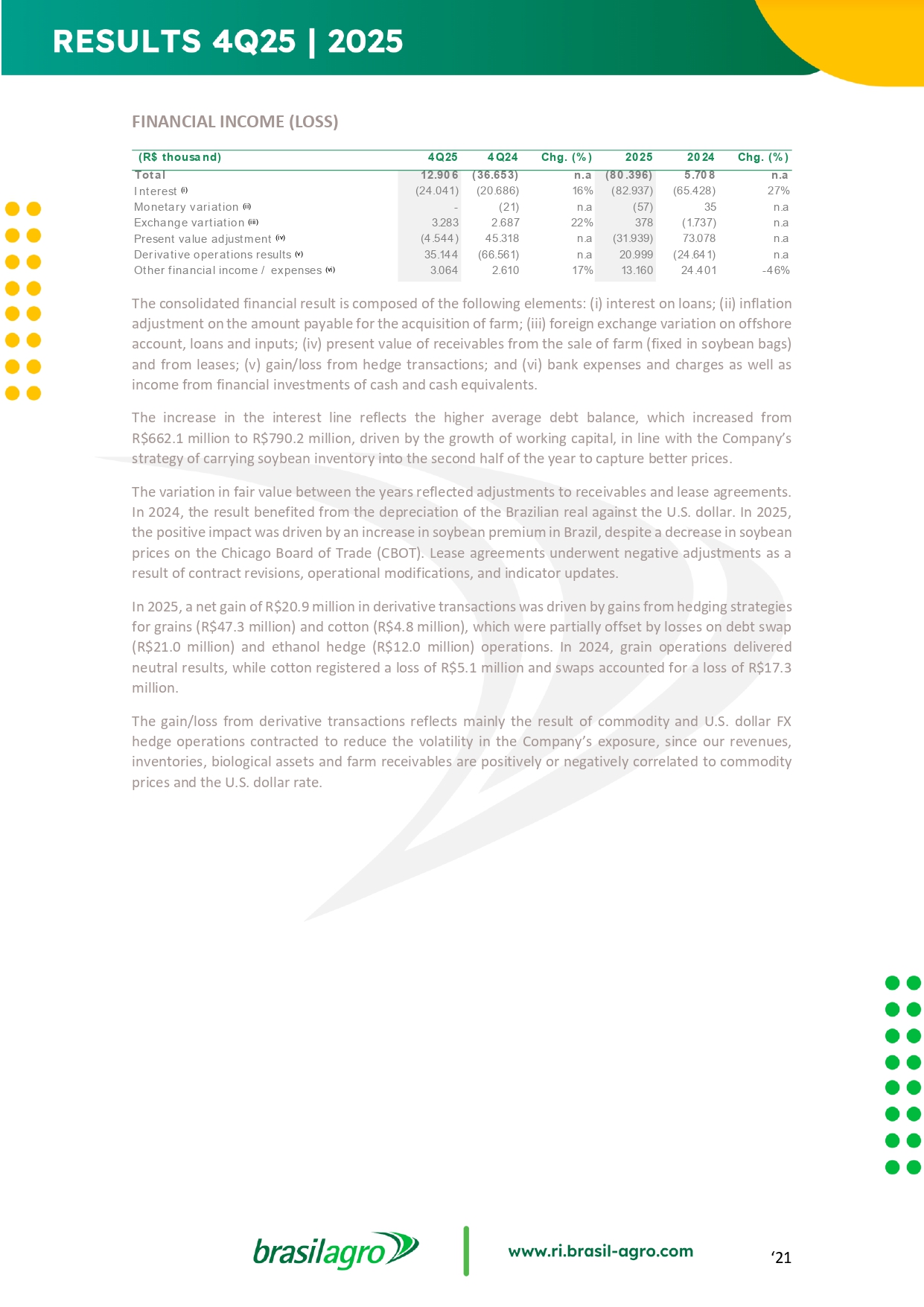 财务收入(亏损)‘21综合财务业绩由以下要素组成:(i)贷款利息;(ii)收购农场应付金额的通货膨胀调整;(iii)离岸账户、贷款和投入的外汇变动;(iv)出售农场(固定在大豆袋中)和租赁产生的应收款项的现值;(v)对冲交易产生的损益;(vi)银行费用和收费以及现金和现金等价物的财务投资收入。利息额度的增加反映了较高的平均债务余额,从662雷亚尔增加。100万至790雷亚尔。200万,受营运资金增长推动,符合公司将大豆库存结转至下半年以捕捉更好价格的策略。年度间公允价值变动反映了对应收账款和租赁协议的调整。2024年,这一结果得益于巴西雷亚尔对美元的贬值。2025年,尽管芝加哥期货交易所(CBOT)大豆价格下跌,但巴西大豆升水增加推动了这一积极影响。由于合同修订、操作修改和指标更新,租赁协议经历了负向调整。2025年净收益20雷亚尔。衍生品交易中有900万笔是由谷物对冲策略的收益推动的(47雷亚尔。300万)和棉花(4雷亚尔。800万雷亚尔),部分被债务互换损失(21雷亚尔)抵消。0万)和乙醇对冲(12雷亚尔。0万)的操作。2024年,谷物操作产生了中性结果,而棉花录得5雷亚尔的亏损。100万,掉期亏损17雷亚尔。300万。衍生品交易的收益/损失主要反映了商品和美元外汇对冲操作收缩的结果,以降低公司风险敞口的波动性,因为我们的收入、库存、生物资产和农场应收账款与商品价格和美元汇率呈正相关或负相关。CHG。(%)20242025CHG。(%)4 Q24 4 Q25(R $ thousand nd)n.a 5.708(80.396)n.a(36.653)12.906 tota l 27%(65.428)(82.937)16%(20.686)(24.041)i nterest(i)n.a 35(57)n.a(21)-货币变动(ii)n.a(1.737)37822% 2.6873.283 Exchange vartiation(iii)n.a 73.078(31.939)n.a 45.318(4.544)现值调整(iv)n.a(24.641)20.999 n.a(66.561)35.14 4衍生经营业绩(v)-46% 24.40113.16017% 2.6 103.064其他f财务收入/支出(vi)